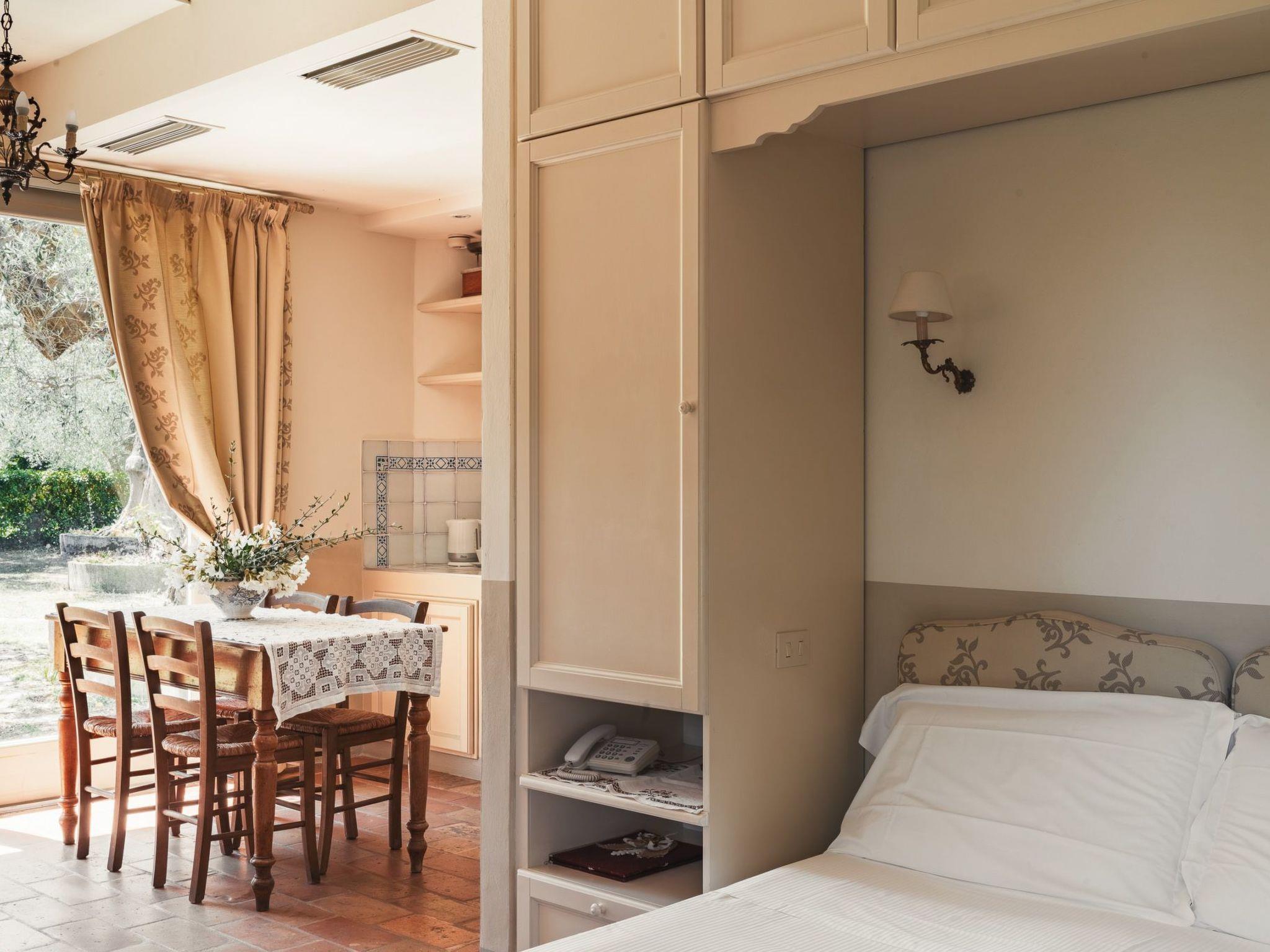 The two-room flat, located on the ground floor of the old barn, consists of two main rooms and is tastefully furnished, retaining some original details. The first room is used as a living area, with a country-style kitchen, a wooden and crystal dining table and a cosy sleeping corner with a double bed set under a built-in wardrobe. The second room is a real double bedroom, reached by passing through a door and up three steps, designed to provide additional privacy and comfort. There are also two bathrooms, practical and functional, making the flat ideal for two couples or a family. A window with original masonry grilles, once used to ventilate the grain, now provides an evocative play of light and shade. Delicate furnishings with matching fabrics and antique chandeliers create a harmonious atmosphere. Outside, a charming relaxation area under a centuries-old olive tree invites you to sip an aperitif or dine with family or friends, making every stay an unforgettable experience.