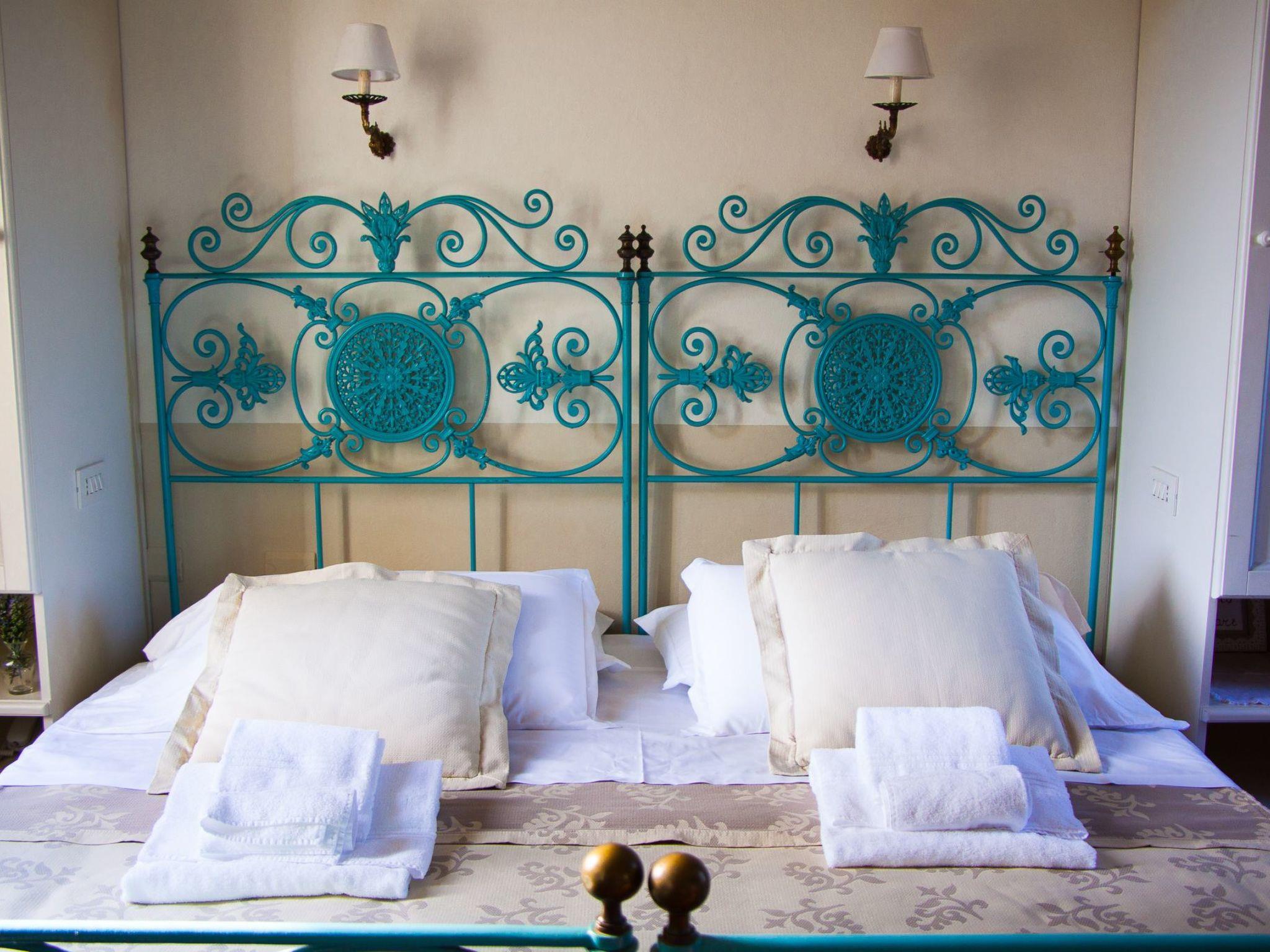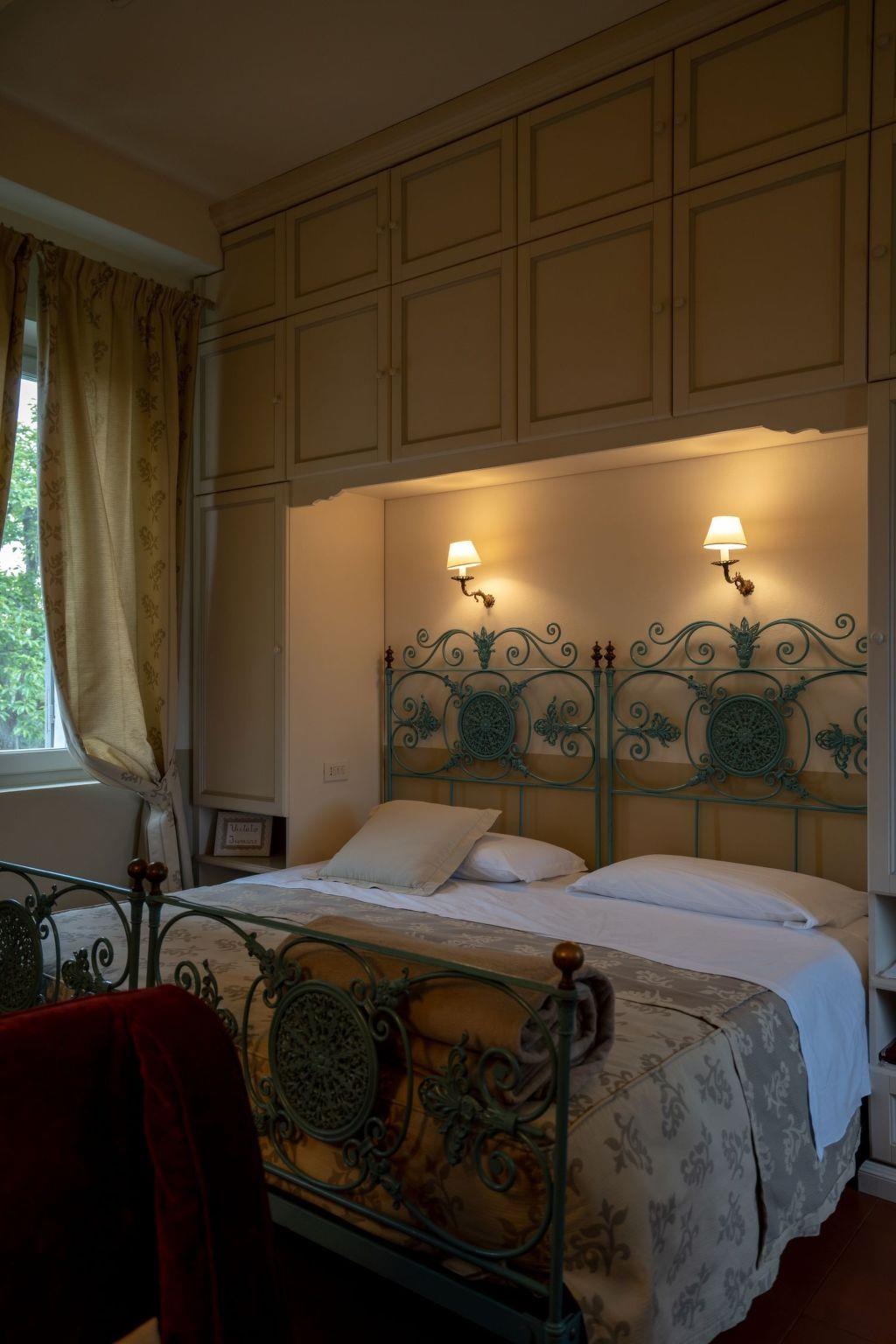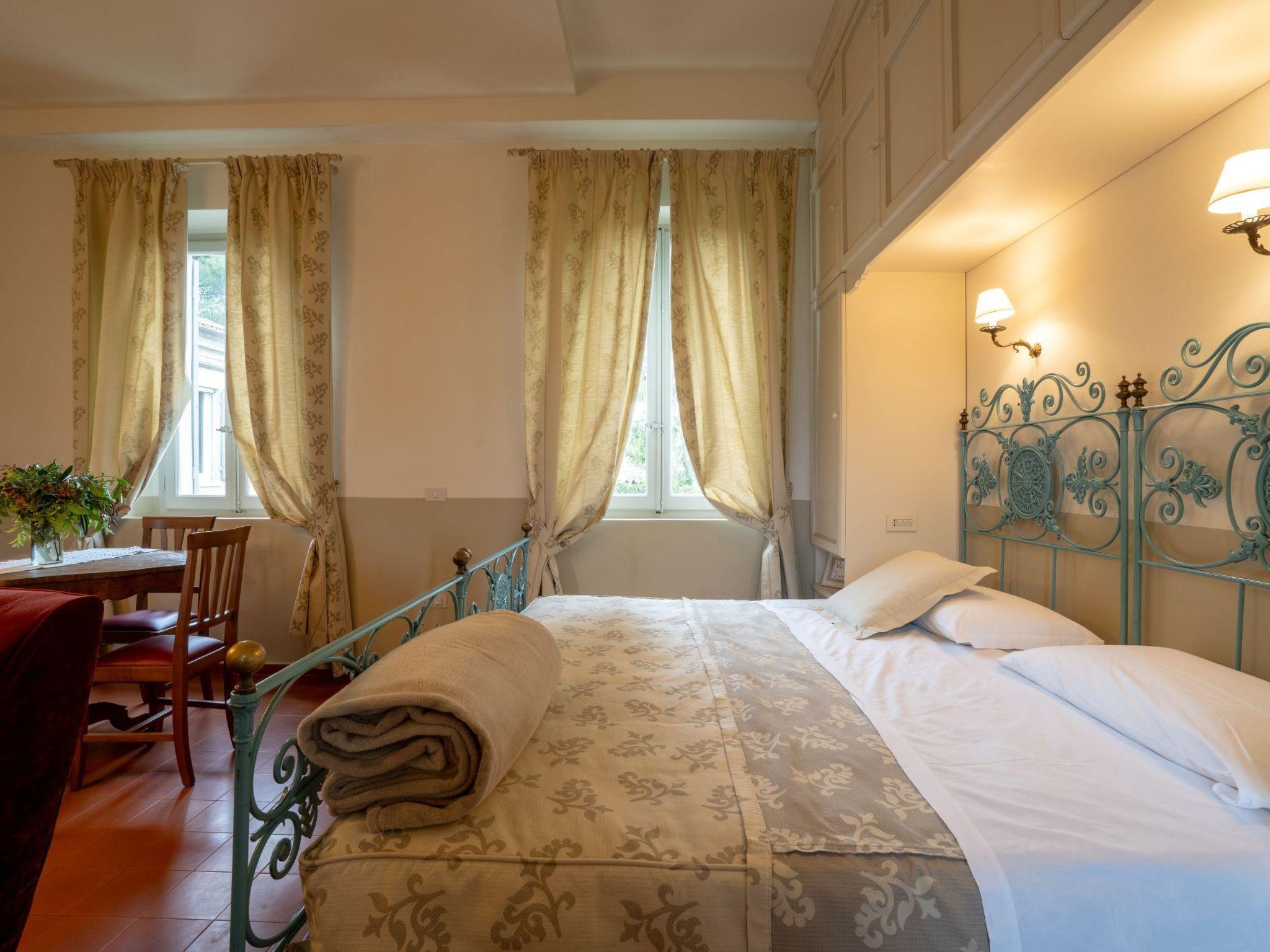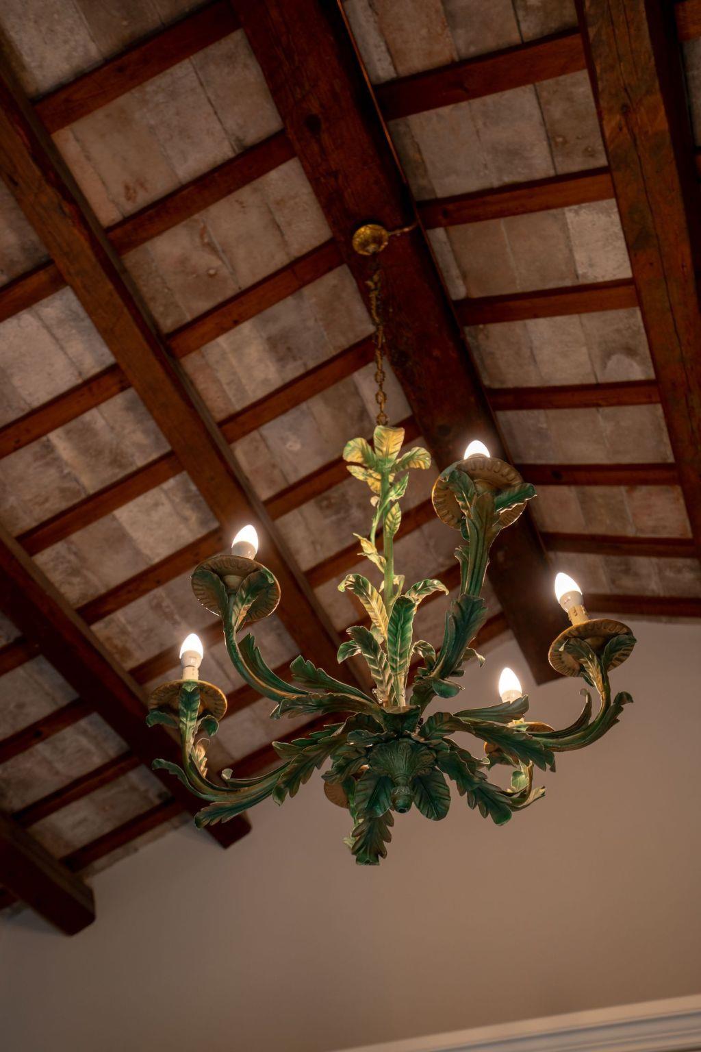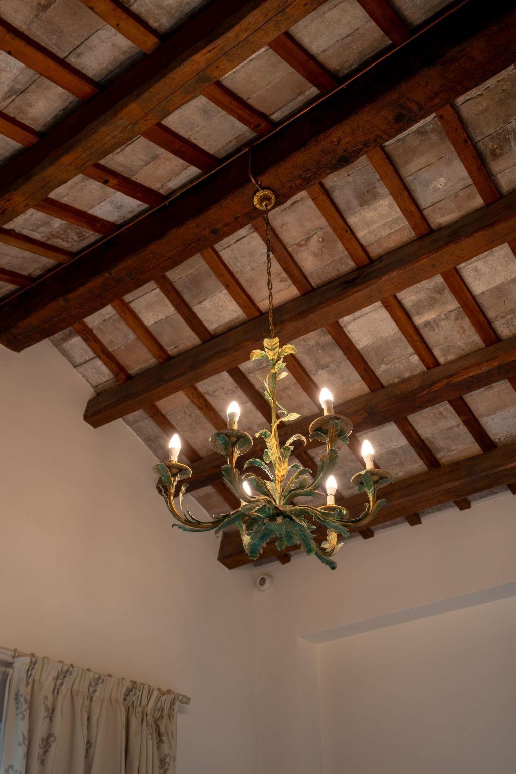 A built-in wardrobe conceals an evocative secret passage leading to the second room, which is a real master bedroom, illuminated by a large French window. Making the room even more unique is a chandelier decorated with small green and gold leaves, suspended from an original beam of the farmhouse.