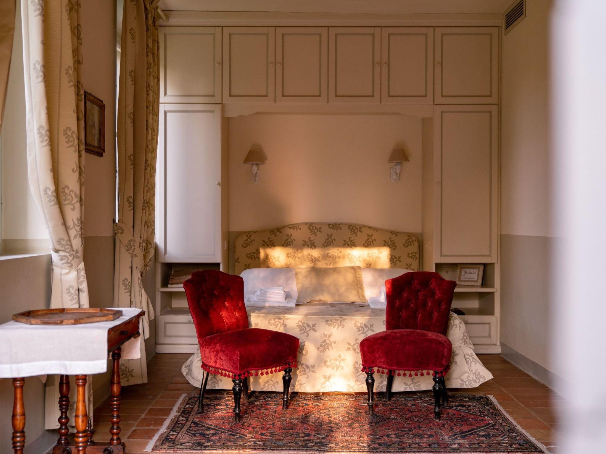 Matching curtains and bedspreads harmonise with the dark red velvet armchairs.