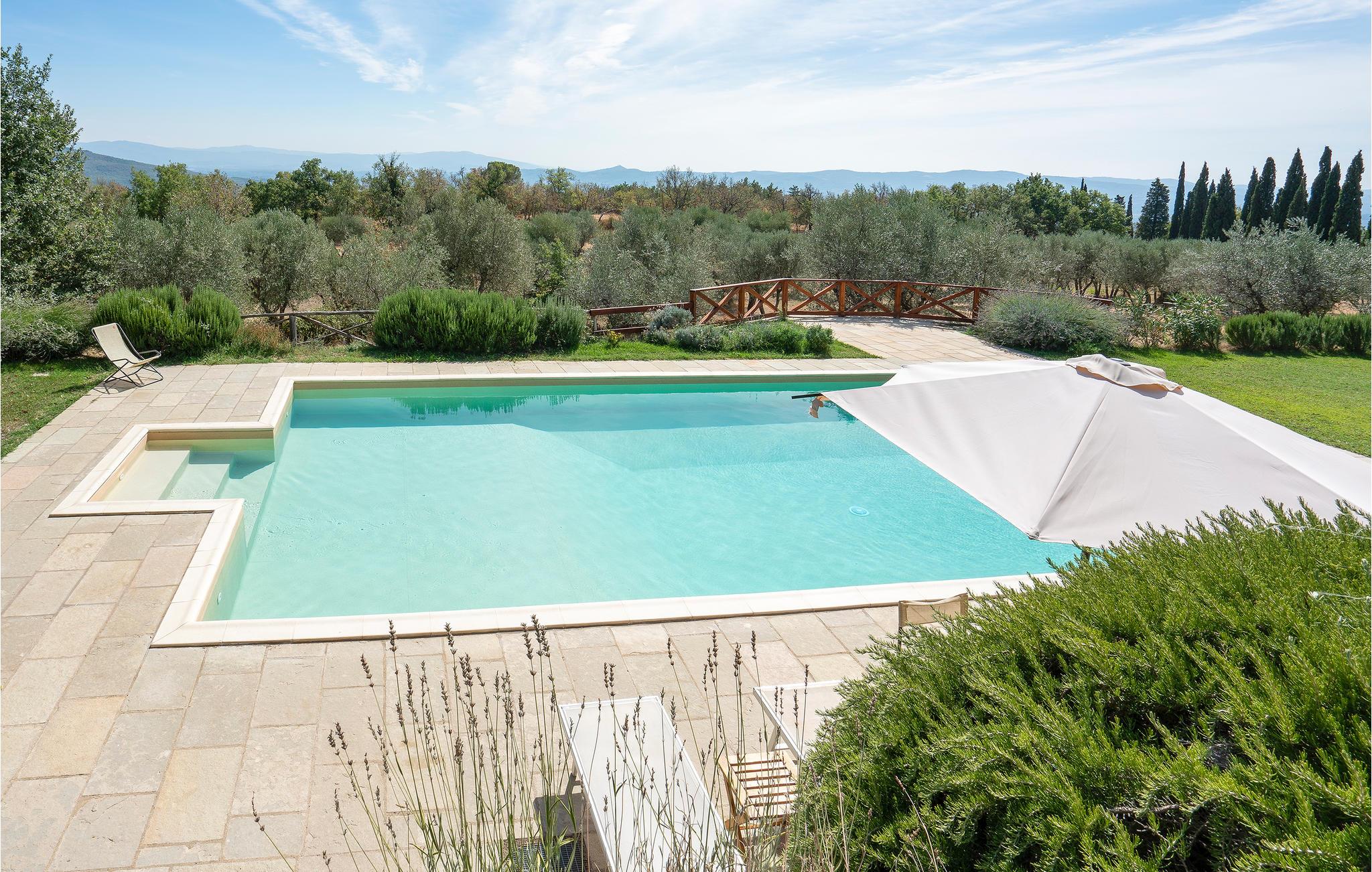 Freuen Sie sich auf einen schönen Urlaub in diesem ansprechenden Ferienhaus mit Pool und fantastischem Panoramablick auf die Landschaft.