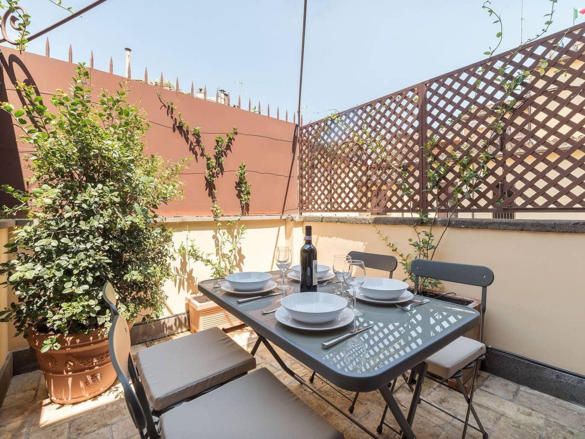 The flat has 2 double bedrooms and a living room with a double sofa bed. Ideal for 4 people, it can accommodate up to 6. It is equipped with air conditioning, Wi-Fi, washing machine and dishwasher.You will appreciate the two small terraces, for an outdoor meal, to relax on the deckchairs in the sun or for an aperitif at the end of the day, enjoying the view of the typical roofs and courtyards of the centre of Rome, in a quiet setting.The traditional Roman bricks on the walls, the antique furniture and the wooden ceilings of the old Roman houses make the flat charming and cosy.
