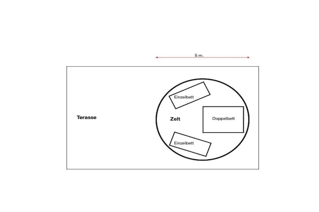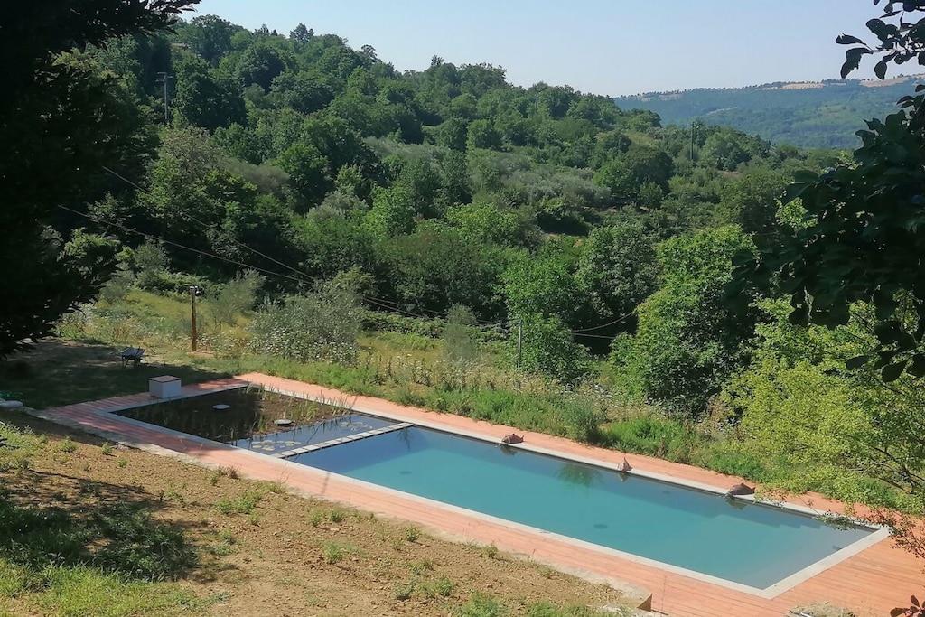 The tent is located on a large wooden terrace shaded by centuries-old chestnut trees and offers maximum privacy. The tent features a double bed and, upon request, two single beds. Carpets are also provided on the floor, and there are electricity and water connections. The terrace overlooking the valley has a dining table with chairs, a parasol, and sun loungers. There is a spacious shared kitchen equipped with everything you need for a comfortable stay: an oven, gas stove, private refrigerator, cutlery, plates, etc. The showers and toilets (private) are located next to the tent, and the pool is about 50 meters from the tent.
