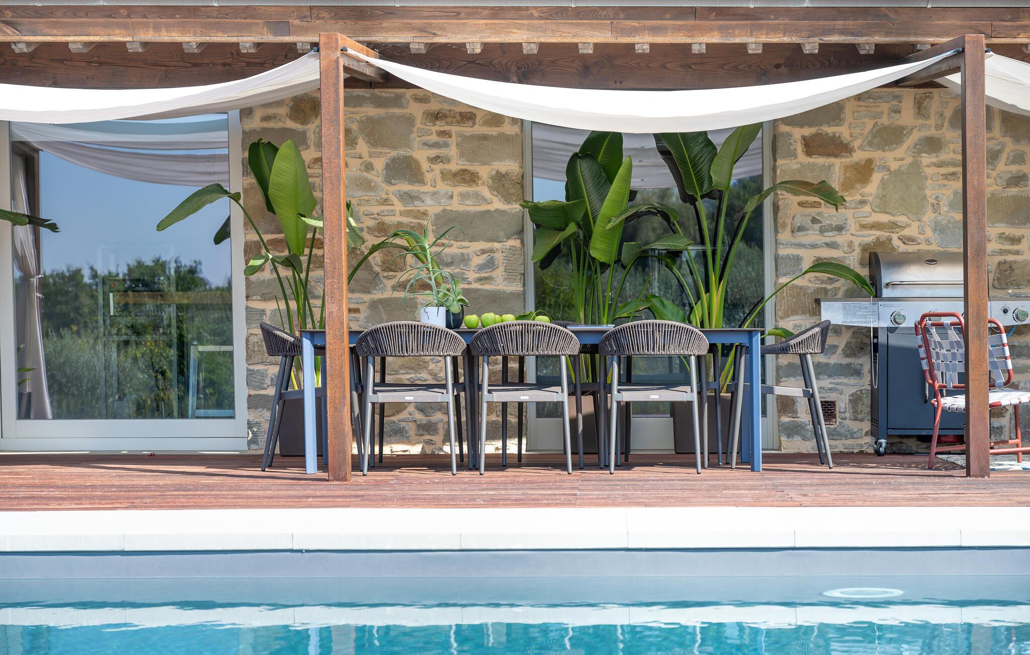 Der Außenbereich ist ein Paradies für Genießer. Ziehen Sie Ihre Bahnen im großen Pool oder entspannen Sie im Außen-Whirlpool mit Blick auf die umliegenden Olivenhaine. Die überdachte Terrasse mit gemütlichen Loungemöbeln und einem Essbereich ist der ideale Ort für ausgedehnte Mahlzeiten oder ein Glas Wein am Abend.