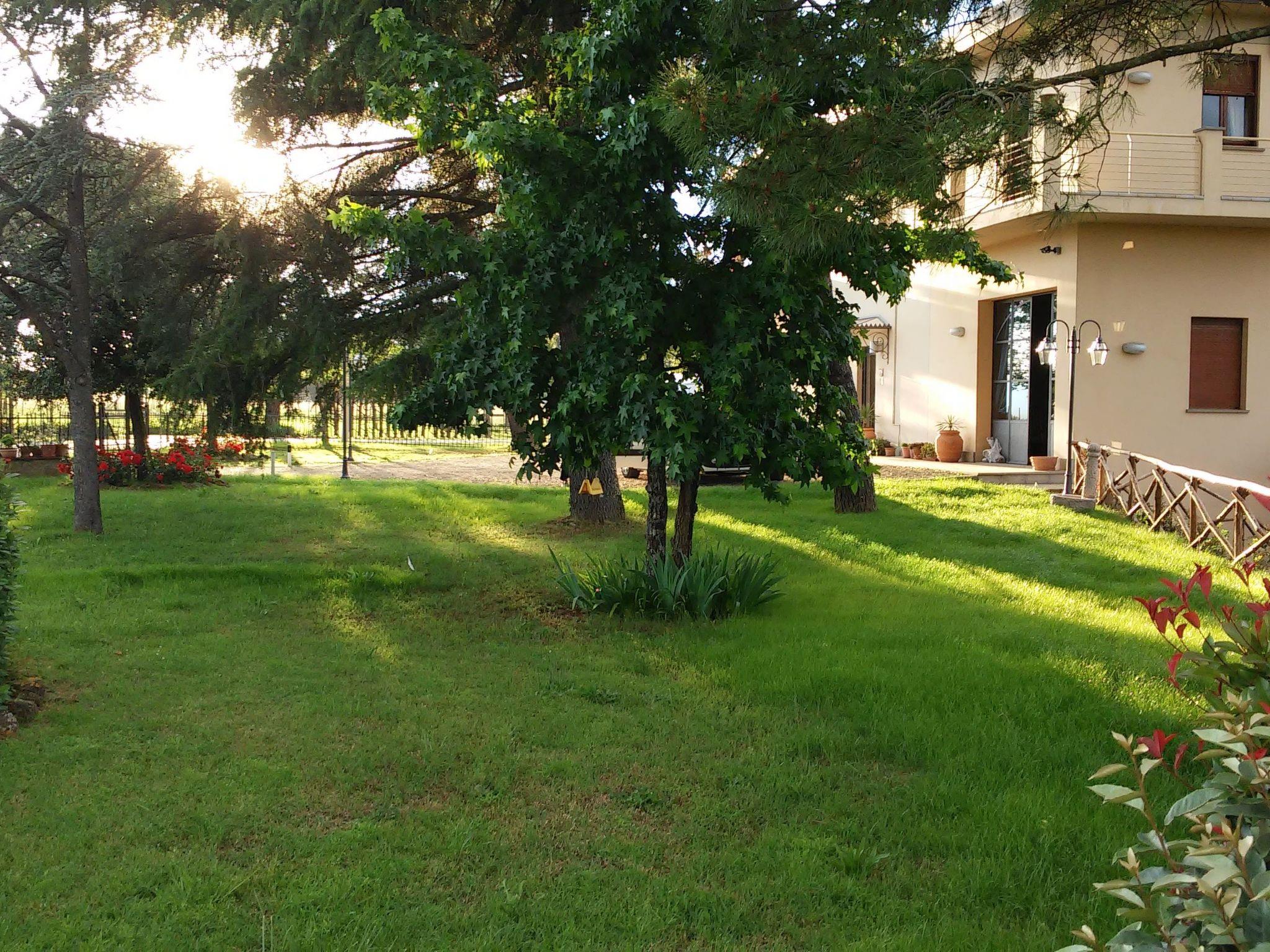 The private terrace with panoramic view is equipped with deck chairs. In the communal garden of about 4000 square metres there are sun loungers, deckchairs, hammocks and small tables. A gazebo with barbeque and a shaded parking area are also available. The swimming pool is equipped with an outdoor shower, solarium and deckchairs. Enchanting night lighting. Wi-Fi is available in the garden and pool area.