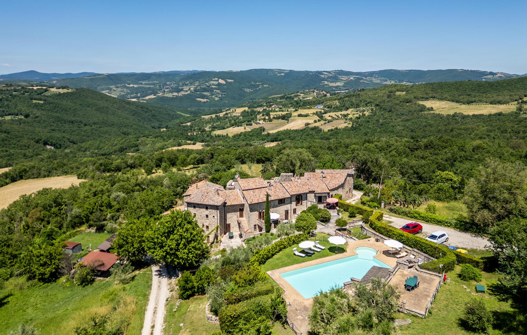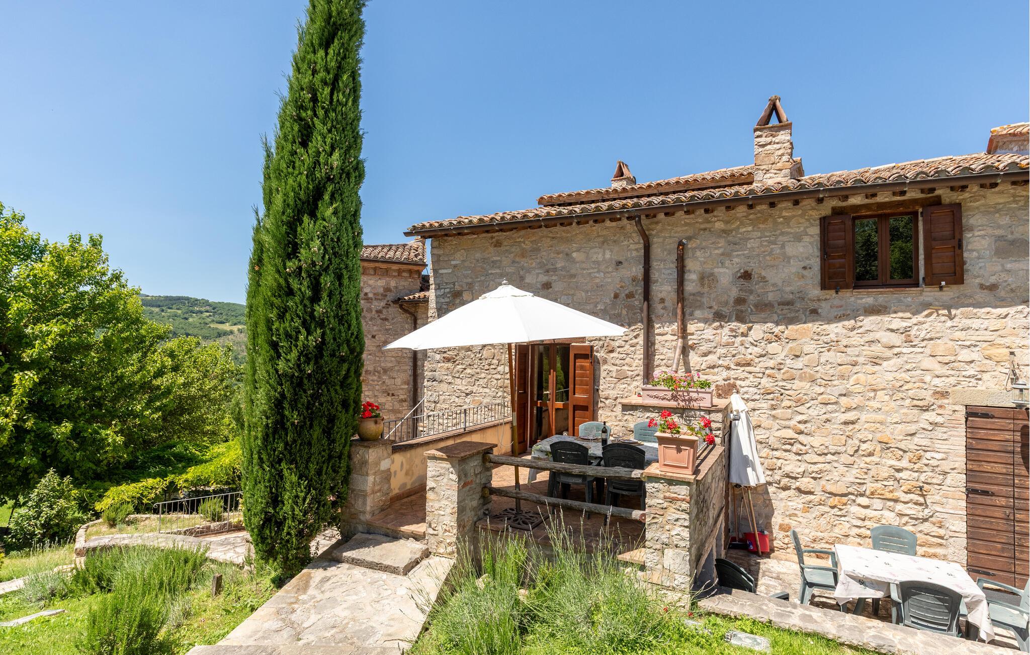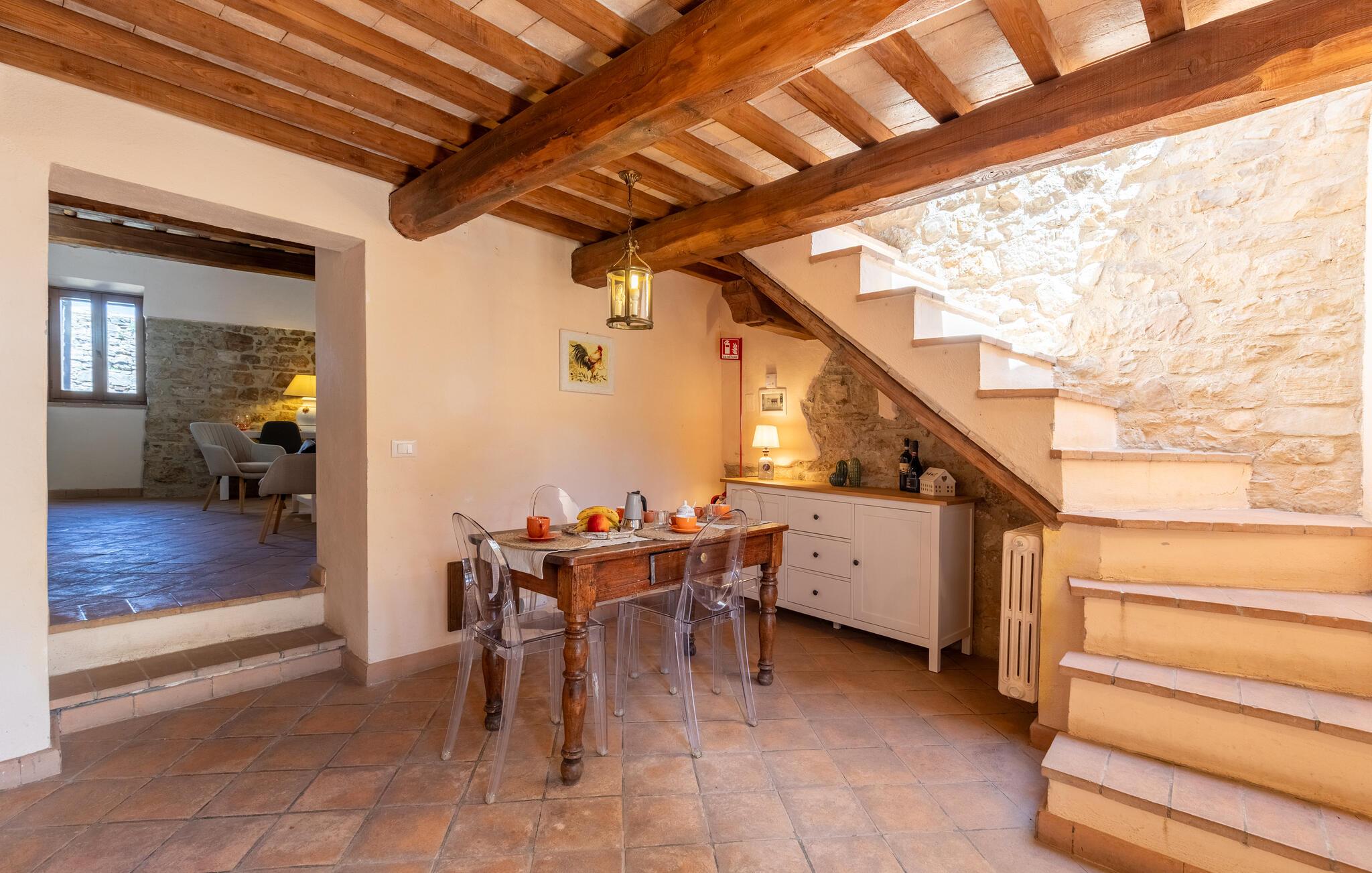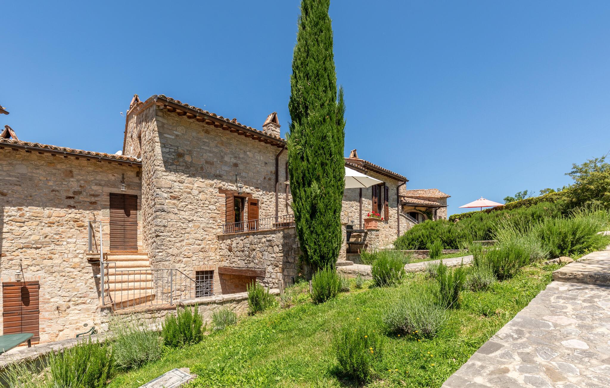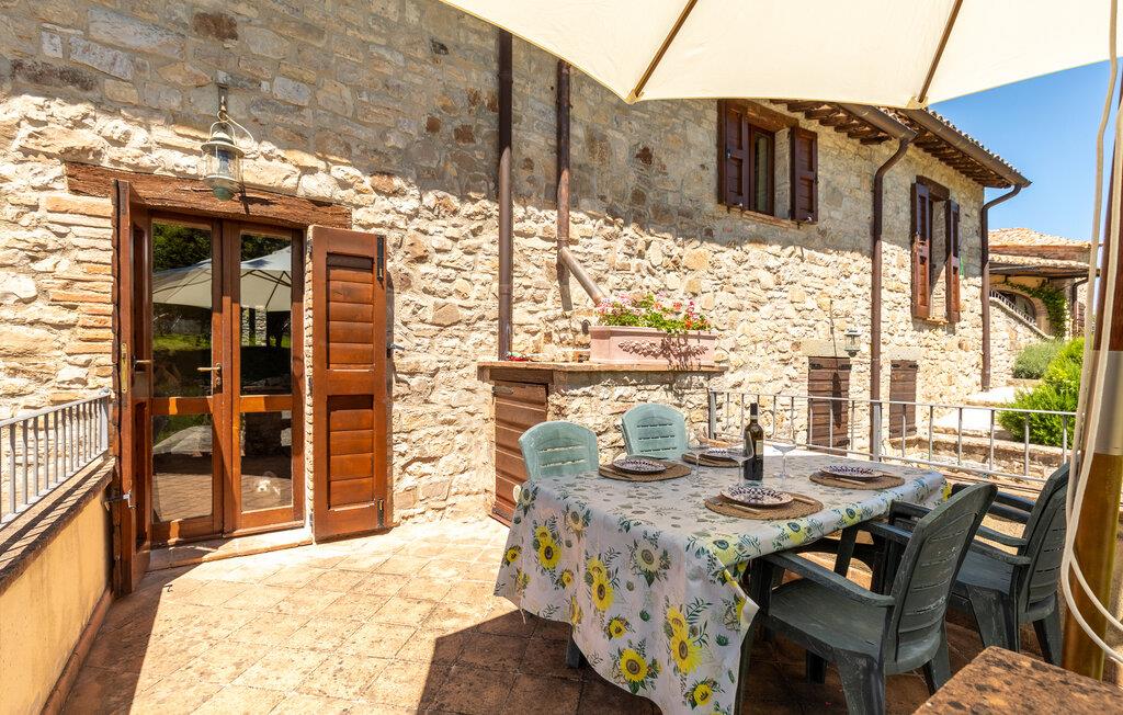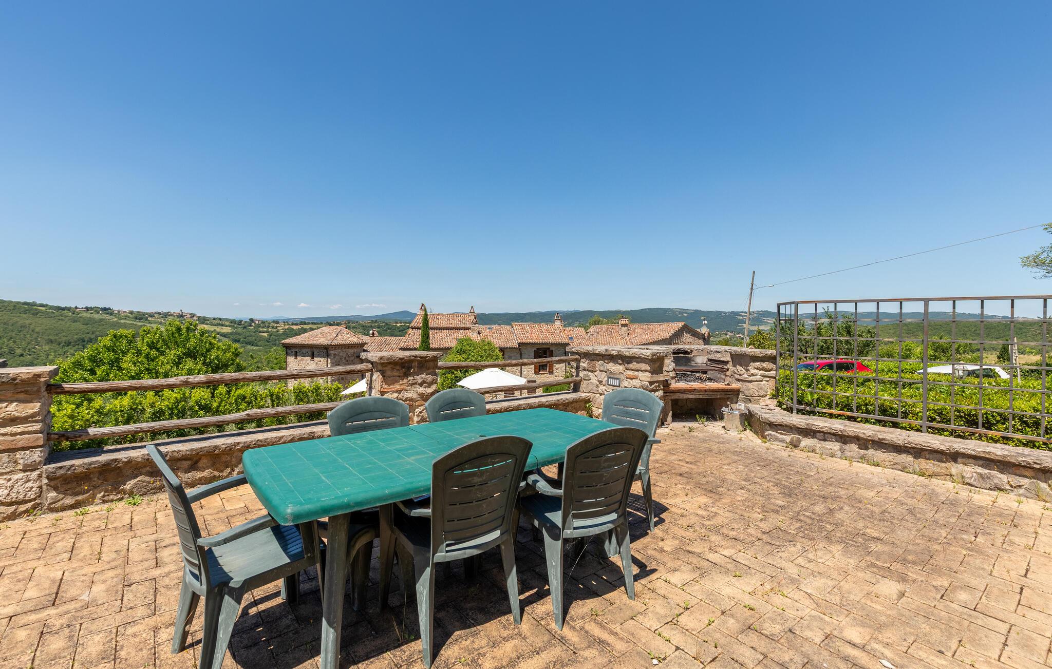 Gemütliches, typisches Appartement in einem winzigen und ruhigen, mittelalterlichen Weiler mit nur 6 Ferienappartements. Besonders schöner Blick auf die Hügel. Ruhige Lage. In Gemeinschaft: großer Aussenbereich mit Olivenbäumen, Sonnenterrasse beim Schwimmbecken, kleines, rundes Schwimmbecken (Durchm. 2,5 m) und Club-Haus (Esszimmer mit Kochecke). Komfortable Einrichtung. S. auch das angrenzende Appartement IUP695.