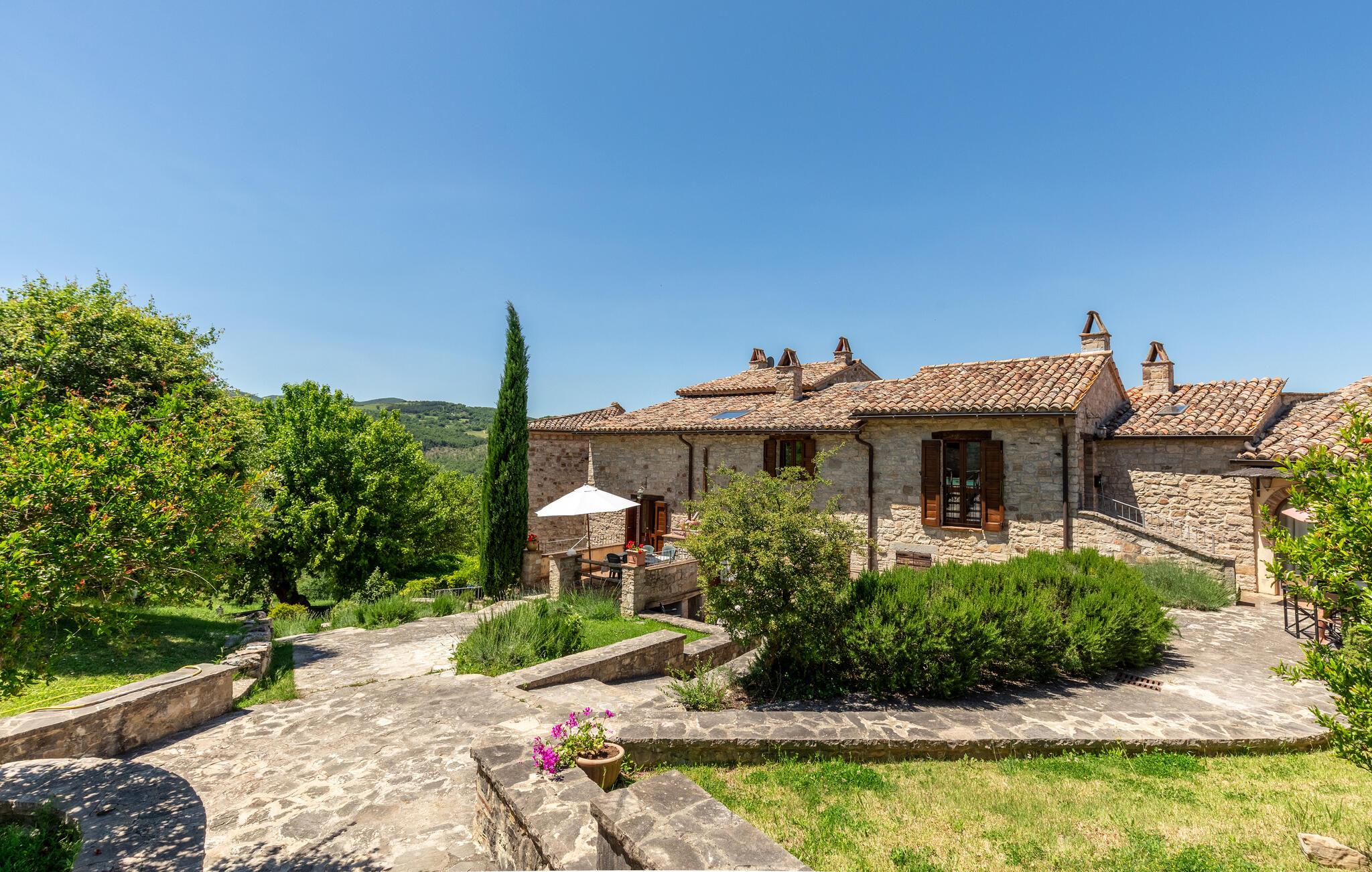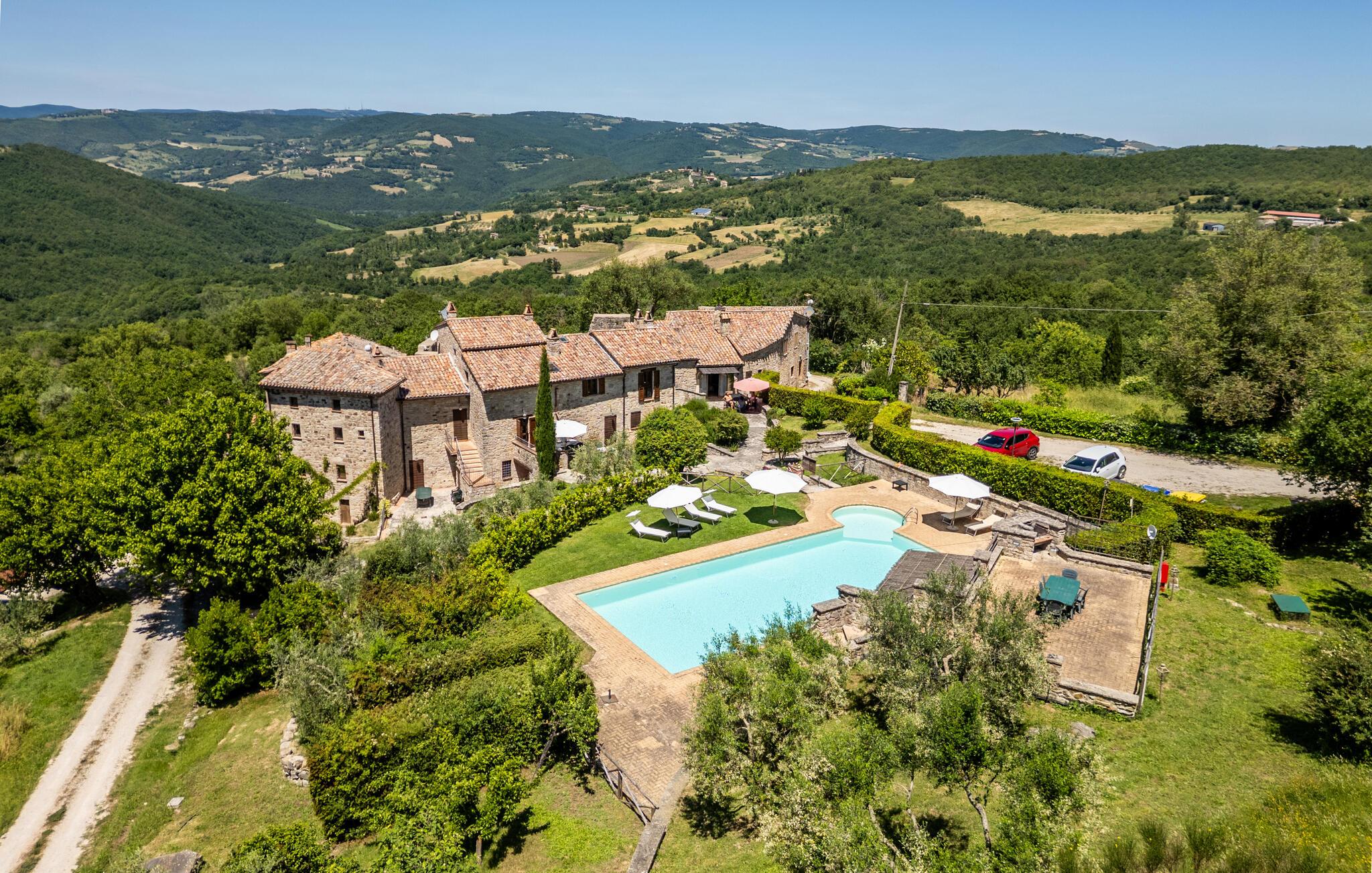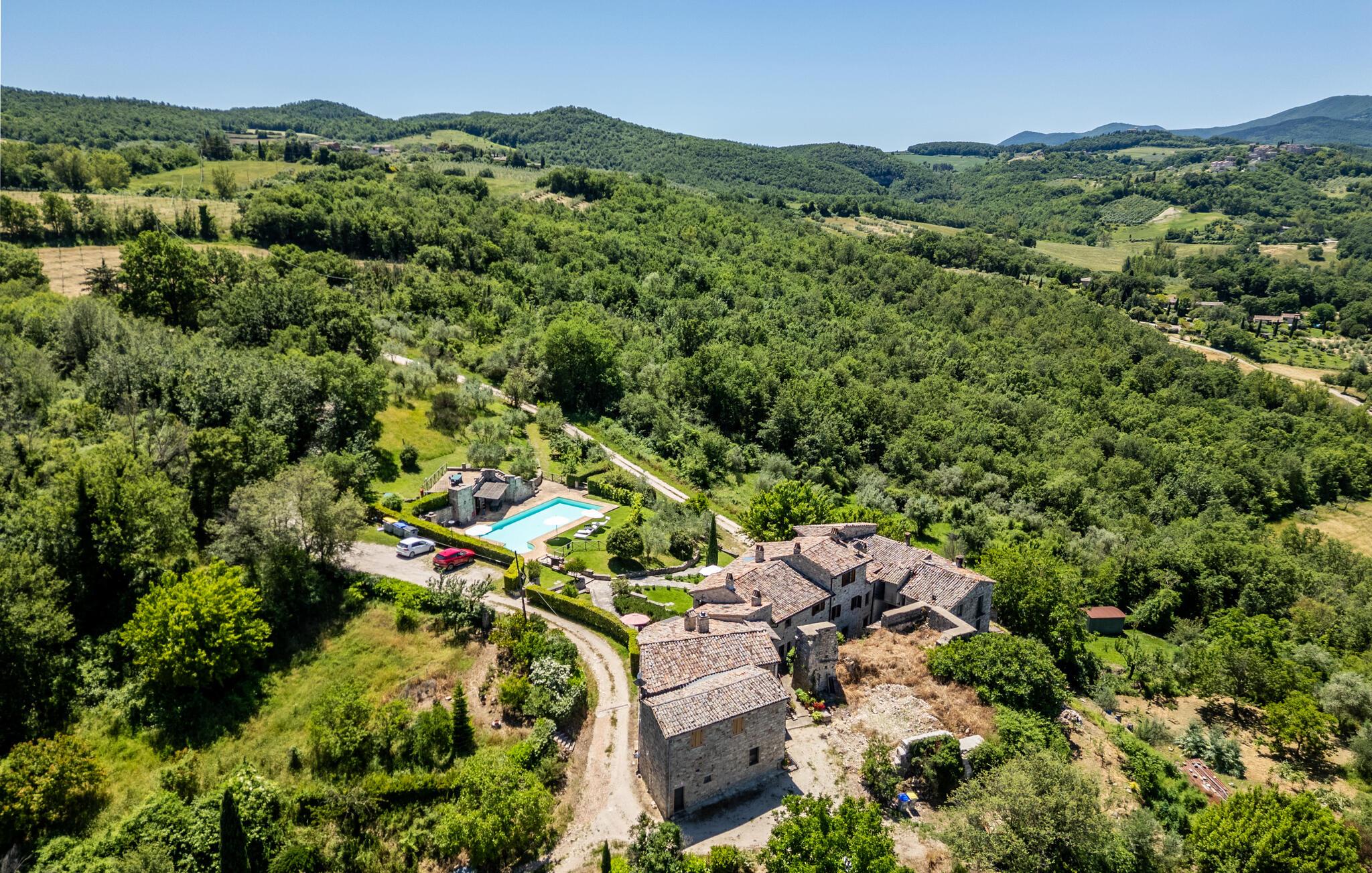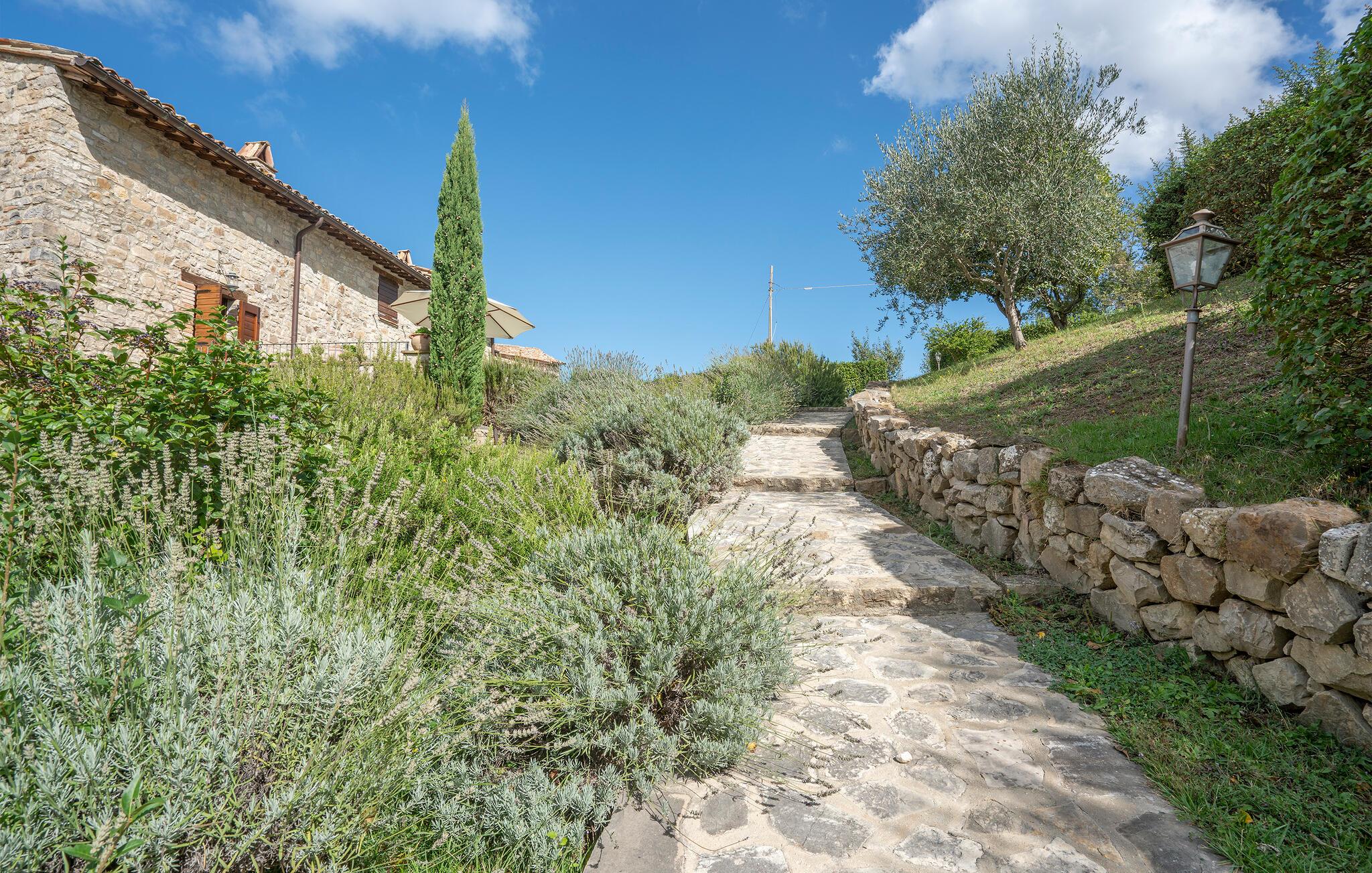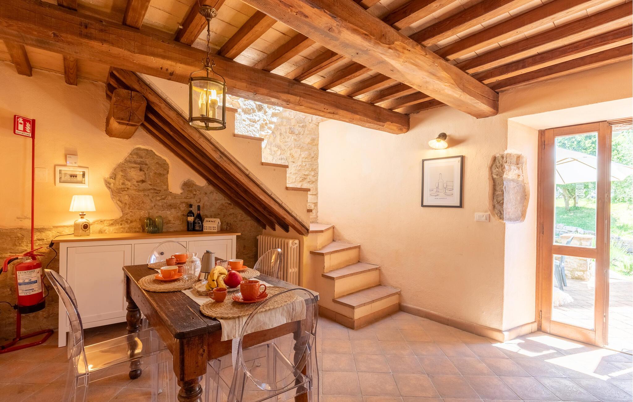 Gemütliches, typisches Appartement in einem winzigen und ruhigen, mittelalterlichen Weiler mit nur 6 Ferienappartements. Besonders schöner Blick auf die Hügel. Ruhige Lage. In Gemeinschaft: großer Aussenbereich mit Olivenbäumen, Sonnenterrasse beim Schwimmbecken, kleines, rundes Schwimmbecken (Durchm. 2,5 m) und Club-Haus (Esszimmer mit Kochecke). Komfortable Einrichtung. S. auch das angrenzende Appartement IUP695.