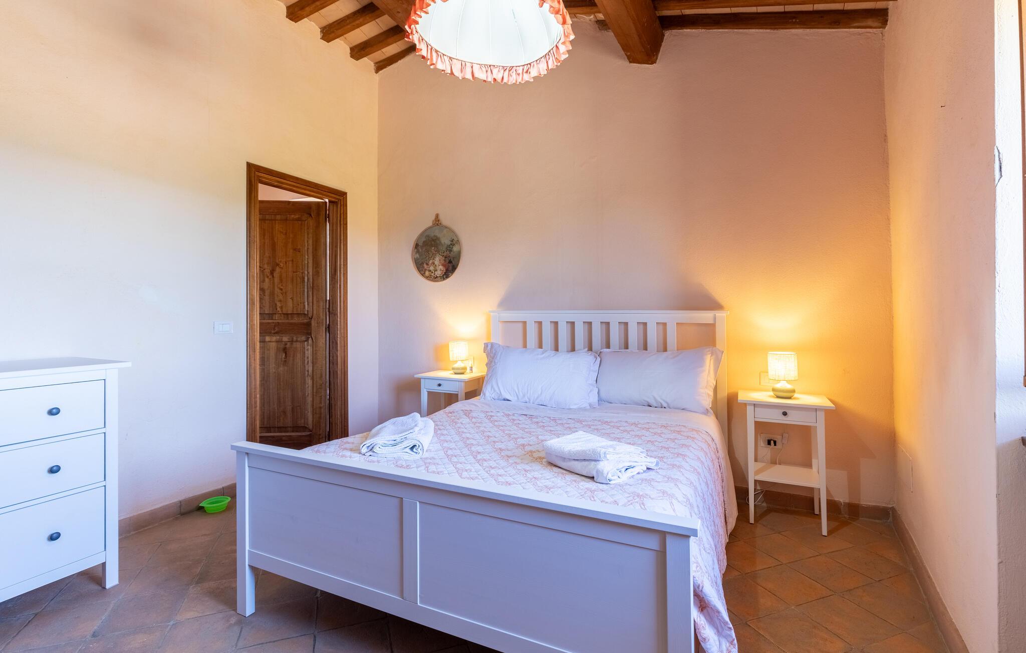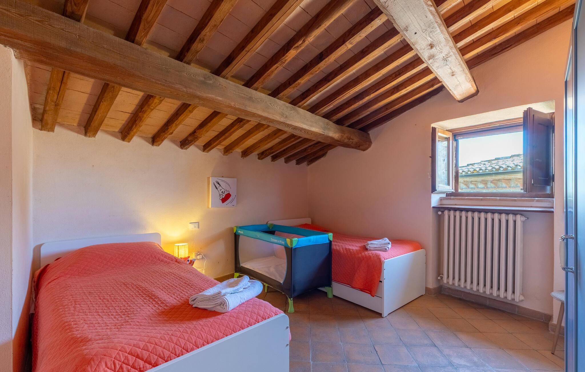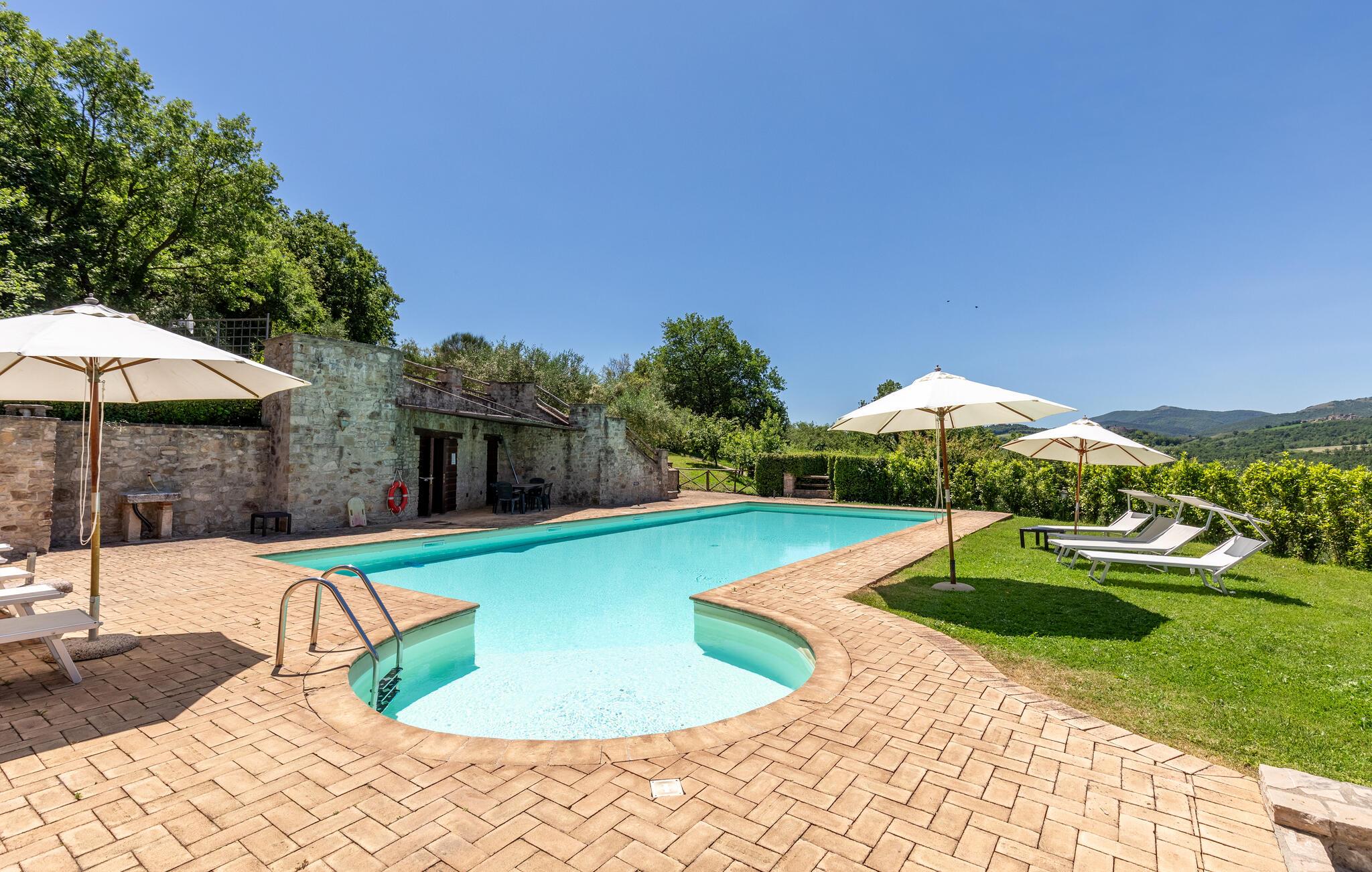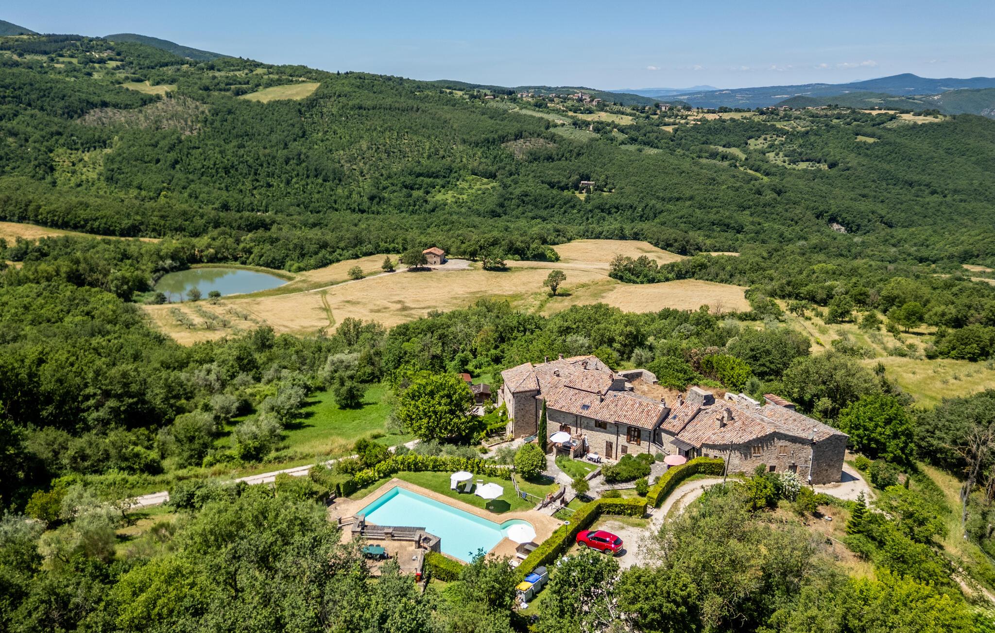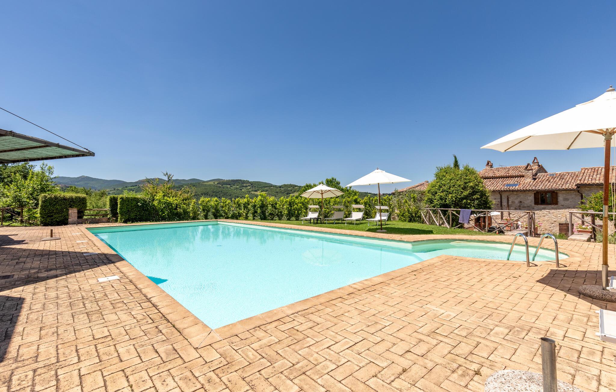 Gemütliches, typisches Appartement in einem winzigen und ruhigen, mittelalterlichen Weiler mit nur 6 Ferienappartements. Besonders schöner Blick auf die Hügel. Ruhige Lage. In Gemeinschaft: großer Aussenbereich mit Olivenbäumen, Sonnenterrasse beim Schwimmbecken, kleines, rundes Schwimmbecken (Durchm. 2,5 m) und Club-Haus (Esszimmer mit Kochecke). Komfortable Einrichtung. S. auch das angrenzende Appartement IUP695.