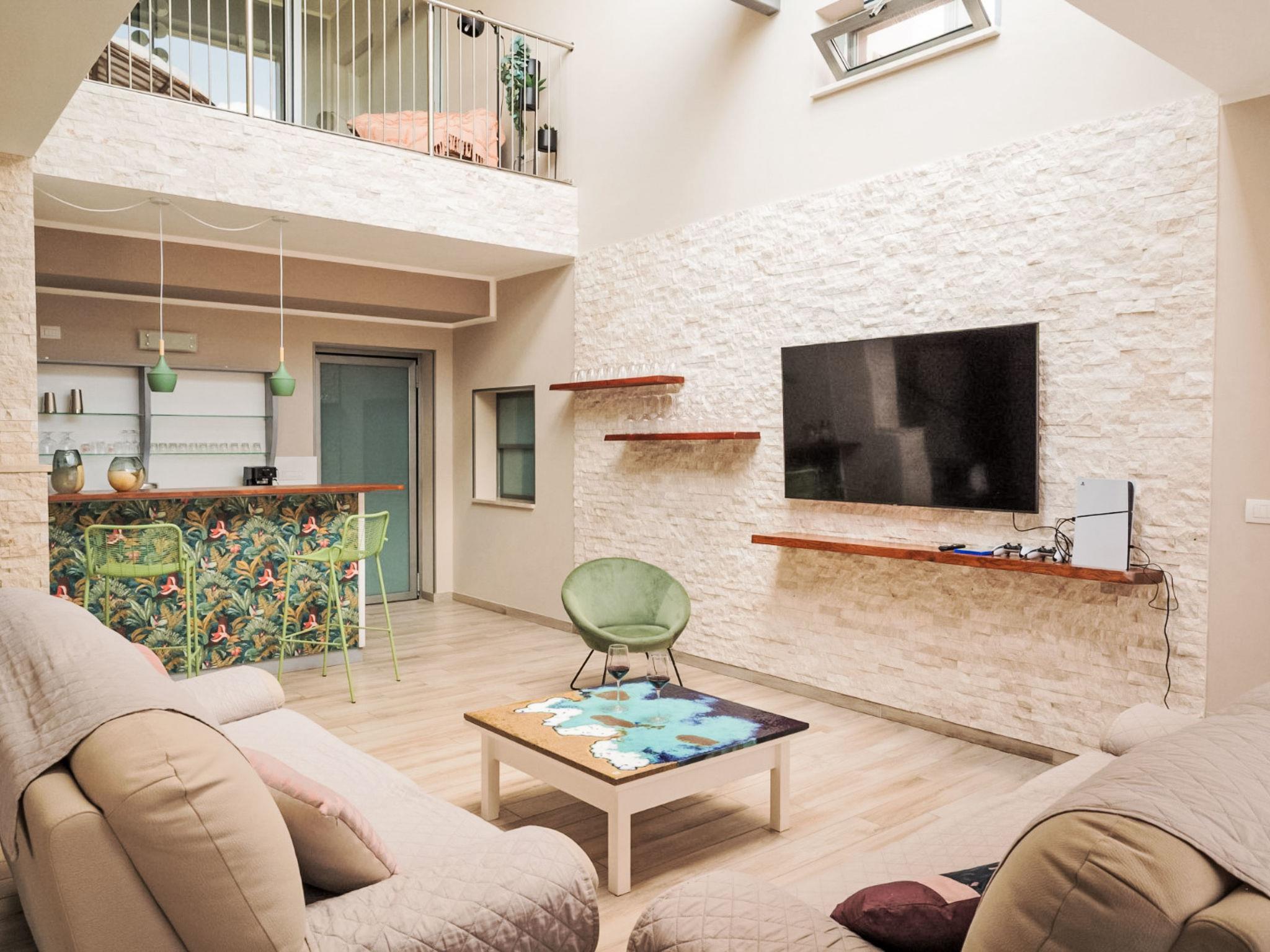 8-room villa 250 m2 on 2 levels. Practical and modern furnishings: large living room with dining table and TV (flat screen). Exit to the garden. 2 rooms, each room with 1 x 2 bunk beds, 1 double bed, shower/bidet/WC and TV (flat screen). Exit to the garden. Large kitchen (oven, dishwasher, 6 gas rings, kettle, microwave, freezer, grill, electric coffee machine, pizza oven) with separate WC. Exit to the garden. 2 sep. WC's. Electric heating, air-conditioning. Heating available only from 15.10. to 15.04. Upper floor: open gallery. 1 double bedroom with shower/bidet/WC and TV (flat screen). Exit to the balcony. 2 rooms, each room with 1 bed, 1 double bed, shower/bidet/WC and TV (flat screen). Exit to the balcony. 1 room with 1 bed, 1 double bed, shower/bidet/WC and TV (flat screen). Exit to the garden, to the balcony. Beautiful panoramic view of the countryside. Facilities: washing machine, safe, children's high chair, baby cot, hair dryer. Internet (WiFi). 1 small pet/ dog allowed. All the rooms are also equipped with safe and minibar. One of the double bedrooms on the ground floor has a bathroom for disable. IT054052B501031390