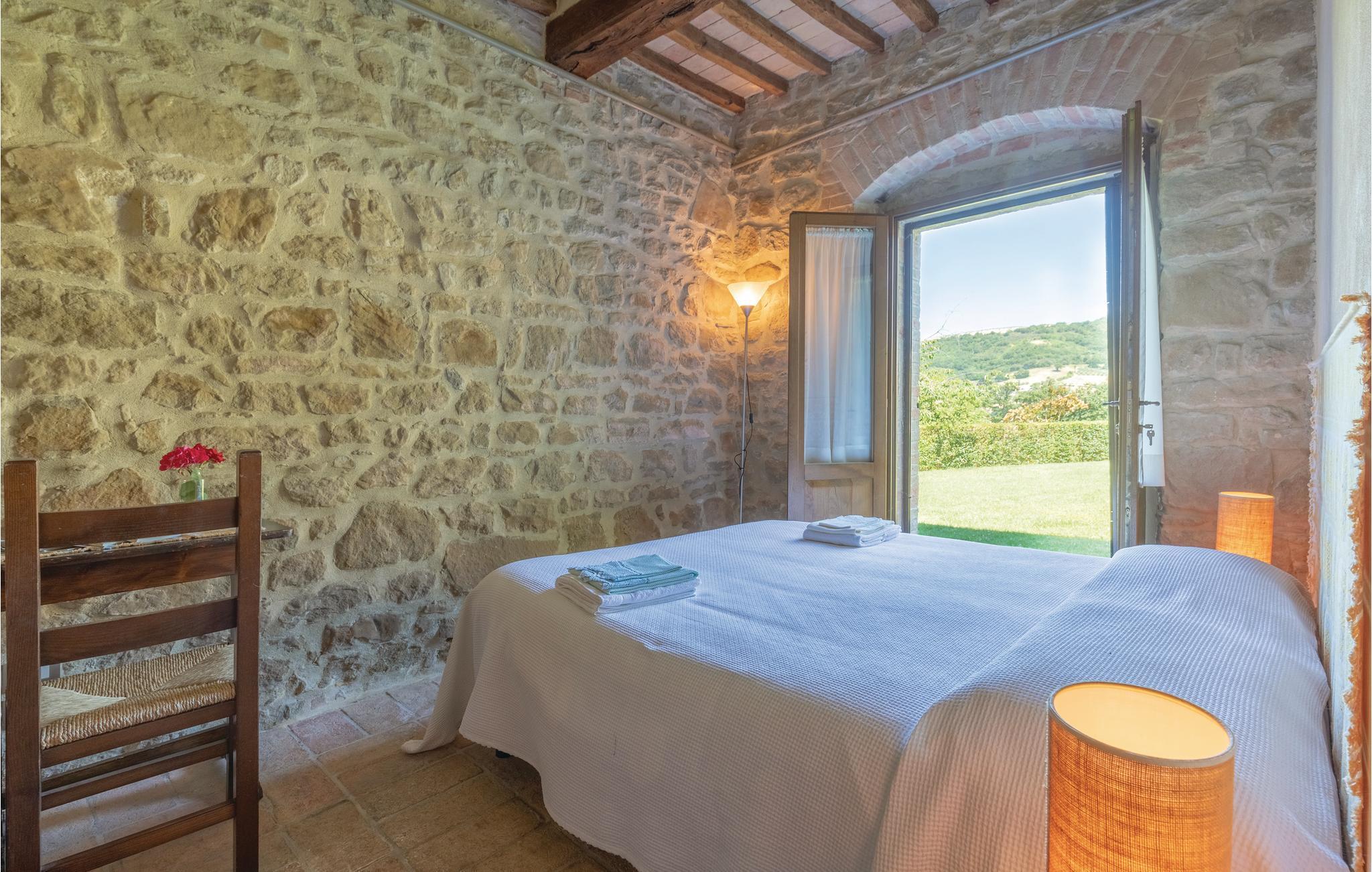 Historisches Landhaus mit 2 Wohnungen und einer weiteren, kleineren Wohnung im angrenzenden Türmchen. Sehr schöne, ruhige, erhöhte Lage über einem großen Tal, umgeben von einem Eichenhain. Jede Wohnung verfügt über einen privaten Aussenbereich. Der Swimmingpool mit einer großen Sonnenterrasse, mit fantastischer Aussicht, wird gemeinschaftlich genutzt, u.a. mit den Gästen einer am Eingang des Grundstücks gelegenen Scheune mit 2 Schlafplätzen. Gute Möglichkeiten für schöne Spaziergänge. Einrichtung mittleren Komforts. 3 km Pianello (Lebensmittelgeschäfte), 6 km Valfabbrica (Geschäfte aller Art), 19 km Assisi, 20 km Perugia, 30 km Gubbio, 45 km Trasimeno See. S. IUP751-752-753-588.