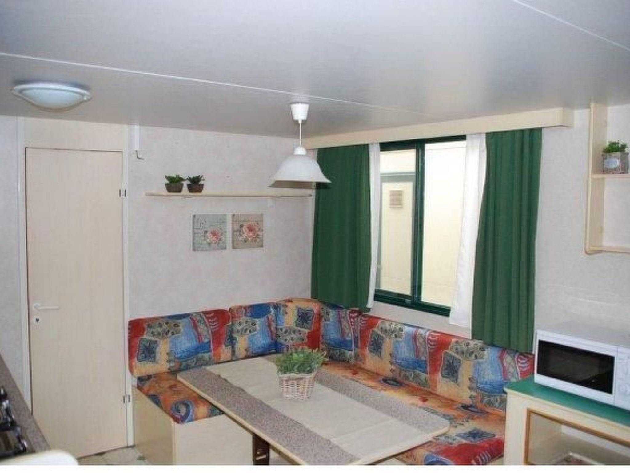 Outside there is a large, roofed and furnished veranda measuring 7 x 2m.Next to the mobile home there is a free private parking space.From the campsite there is a shuttle bus to the seaside, only in the main season There is also a large children’s playground with six large trampolines, a football pitch, climbing frames and a shared swimming pool.There are also a restaurant, a supermarket, a shop with camping gear and bike and mountain bike rental.The campsite has a capacity of around 400 places and there is a reception where Italian, German, Dutch and English are spoken.