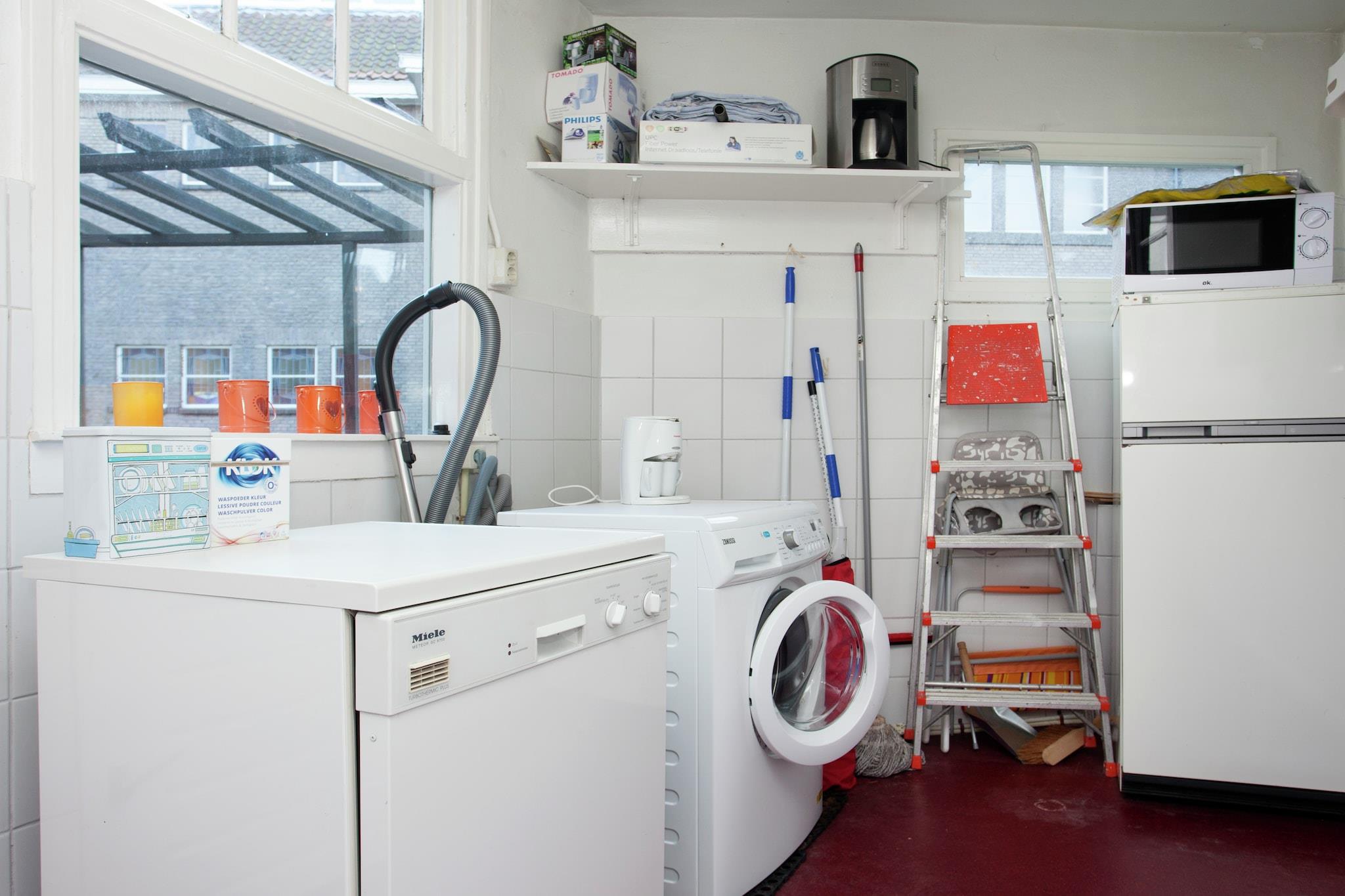 Ground floor: (Entrance, open kitchen(electric kettle, cooker(ceramic), hood, 2x coffee machine(cups, filter), oven(grill-oven), dishwasher), Living/diningroom(TV(flatscreen, digital), dining table(5 persons), seating area), toilet, pantry(microwave, fridge-freezer, tumble dryer, washing machine, high chair), ironing board, iron) On the 1st floor: (bedroom(single bed, children's bed), bedroom(2x single bed), bedroom(double bed), bathroom(bath tub, shower(unit), washbasin, toilet), Landing) camping cot, washing machine, heating(central), terrace(2 m2), garden furniture