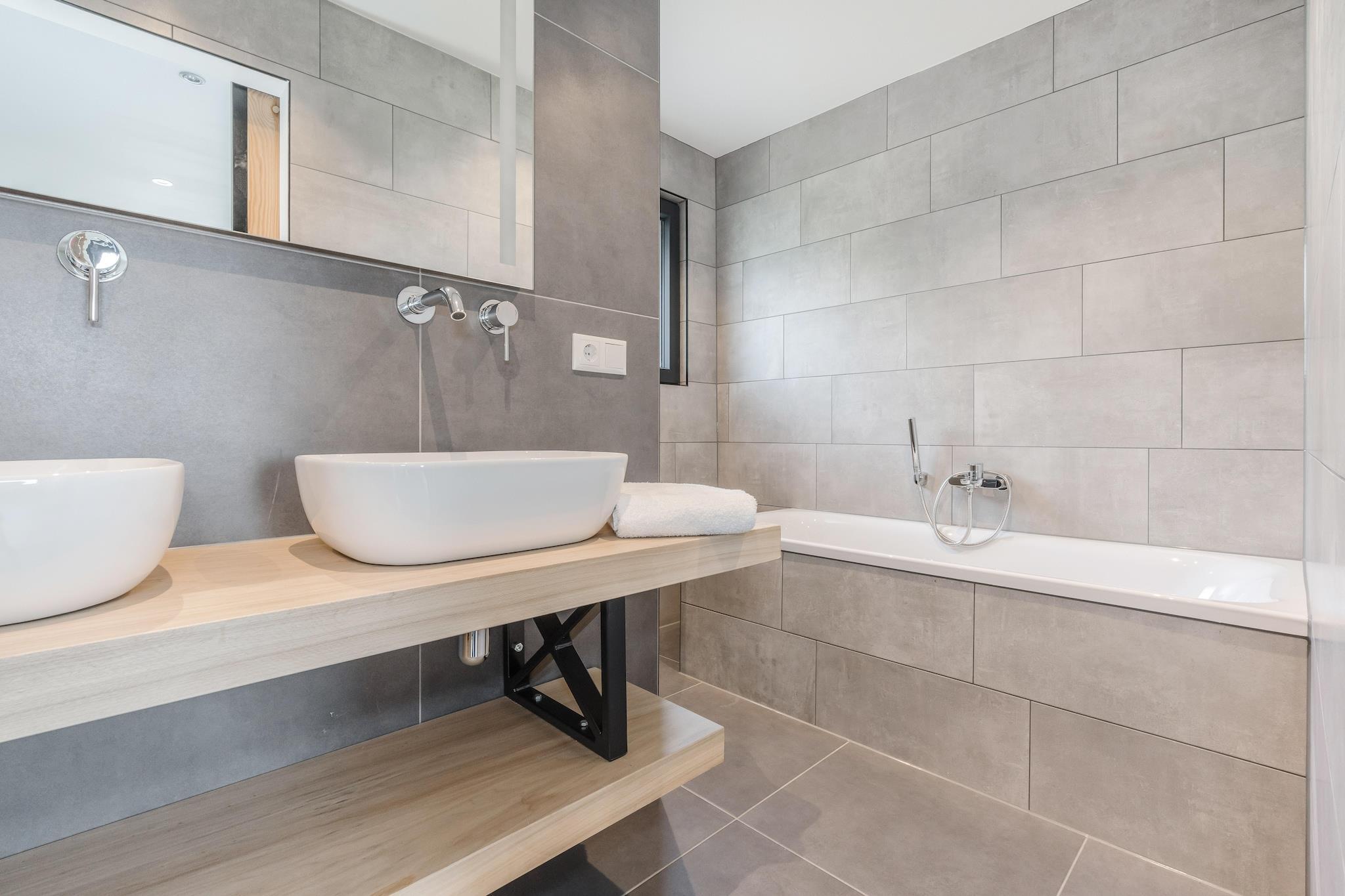 Ground floor: (Living room(TV, air conditioning), open kitchen(hob(ceramic), electric kettle, coffee machine(cups, filter), combination microwave, dishwasher, fridge(+ freezer)), bedroom(double bed or 2 single beds), bedroom(double bed or 2 single beds), bathroom(bath tub, shower, toilet), storage(tumble dryer, washing machine)) On the 1st floor: (Bedroom with bathroom(double bed or 2 single beds, shower, washbasin, toilet)) heating(central), terrace, garden, garden furniture, parking, swimming pool(shared with other guests, outside, heatable)