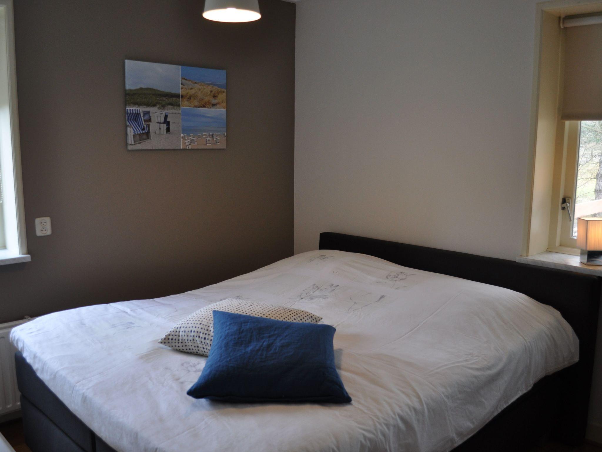 The bungalow has three bedrooms on the ground floor: two bedrooms have a double bed (box spring) and one bedroom has a bunk bed. The shower is accessible via the living room and has a combination rain shower/hand shower.