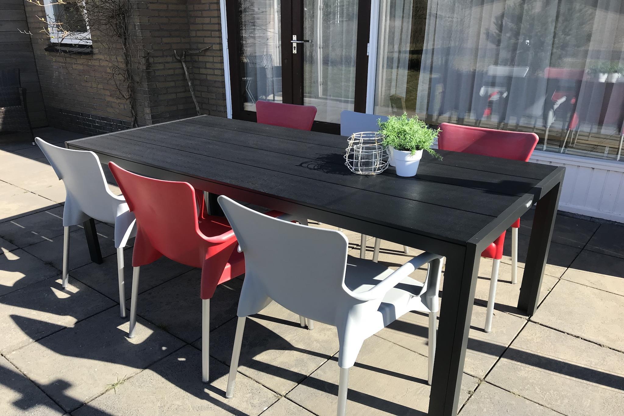 Ground floor: (Living room(TV(flatscreen), seating area, DVD player, stereo unit), open kitchen(electric kettle, toaster, cooker(4 ring stoves, gas), hood, 2x coffee machine(cups, filter), microwave, fridge), bedroom(bunk bed(duvet, 90 x 200 cm)), bedroom(bunk bed(duvet, 90 x 200 cm)), bedroom(double bed(twin duvet, 160 x 200 cm)), bathroom(shower, washbasin, toilet, heating(Floor heating)), storage(washing machine)) terrace, garden(private), children's bed, high chair