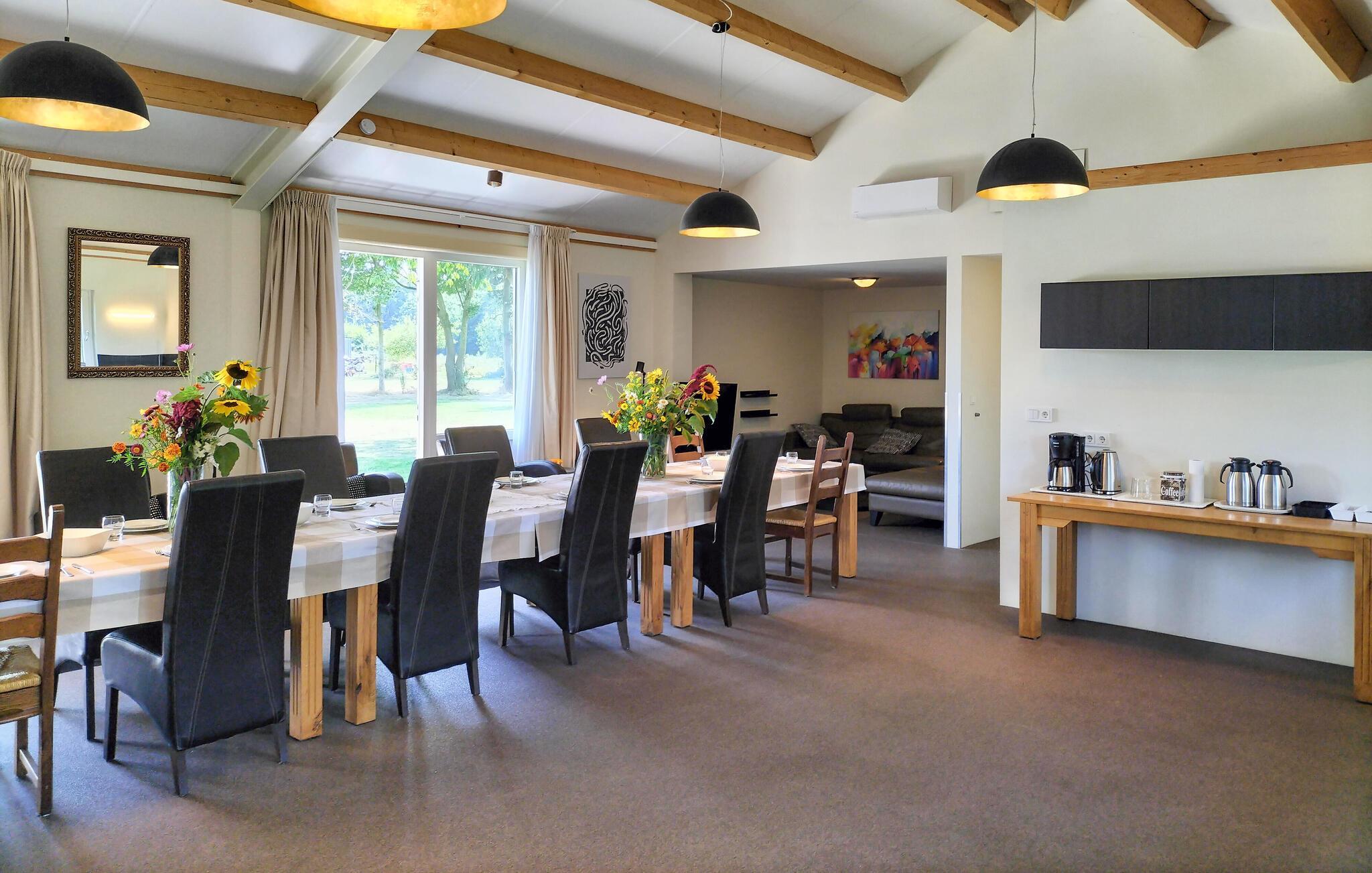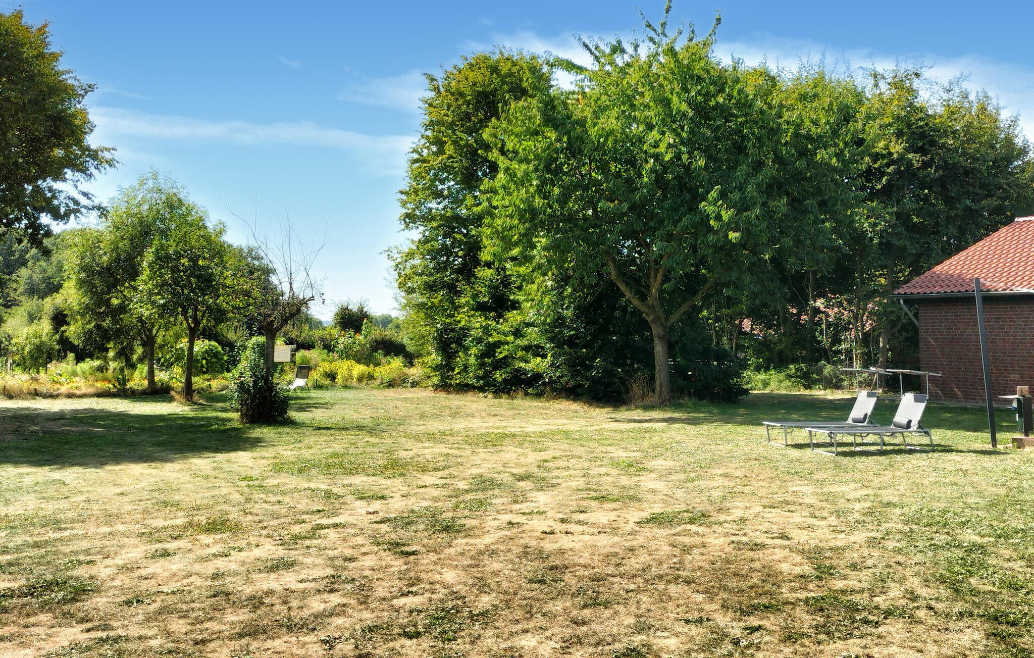 Direkt neben dem schönen Gemüse- und Kräutergarten des Eigentümers gelegen, können Sie in Ihrem Ferienhaus die herrliche Aussicht auf die umliegenden Wiesen genießen. Betreten Sie den weitläufigen Innenbereich mit rustikalen Holzbalken an der Decke und nehmen Sie Platz an der langen Tafel im Essbereich, die ideal für gesellige Mahlzeiten ist. Nutzen Sie die moderne Küche, um gemeinsam zu kochen. Entspannen Sie sich im gemütlichen Wohnzimmer mit bequemen Sofas und Fernseher oder ziehen Sie sich in einen der Sitzbereiche zurück, um ein Buch zu lesen. Genießen Sie die helle, freundliche Atmosphäre, die durch große Fenster und eine offene Raumgestaltung entsteht.