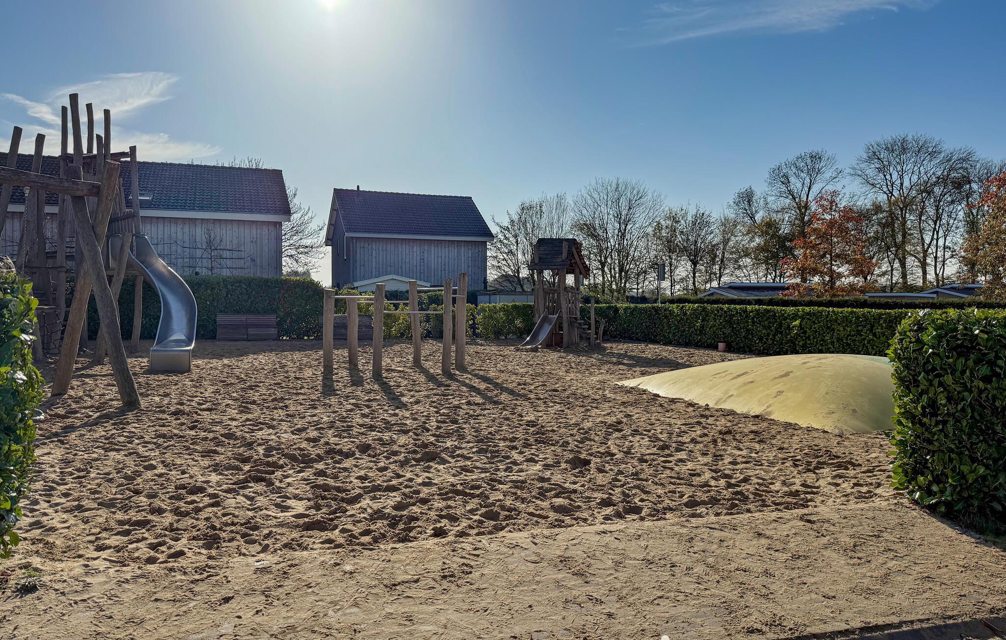 Diese helle und einladende Unterkunft ist perfekt für entspannte Ferientage. Die stilvolle Einrichtung und die familienfreundliche Ausstattung lassen Sie sich hier sofort wie zu Hause fühlen. Der Wohnbereich besticht durch seine gemütliche Atmosphäre, die durch den Kamin ergänzt wird, der sowohl vom Wohnzimmer als auch von der Terrasse aus sichtbar ist. Hier können Sie gesellige Abende verbringen oder bei einem Buch entspannen. Die Terrasse lädt Sie zu sonnigen Stunden und gemeinsamen Mahlzeiten im Freien ein, während Ihre Kinder die schöne Wohnanlage und den großen Spielplatz erkunden können.