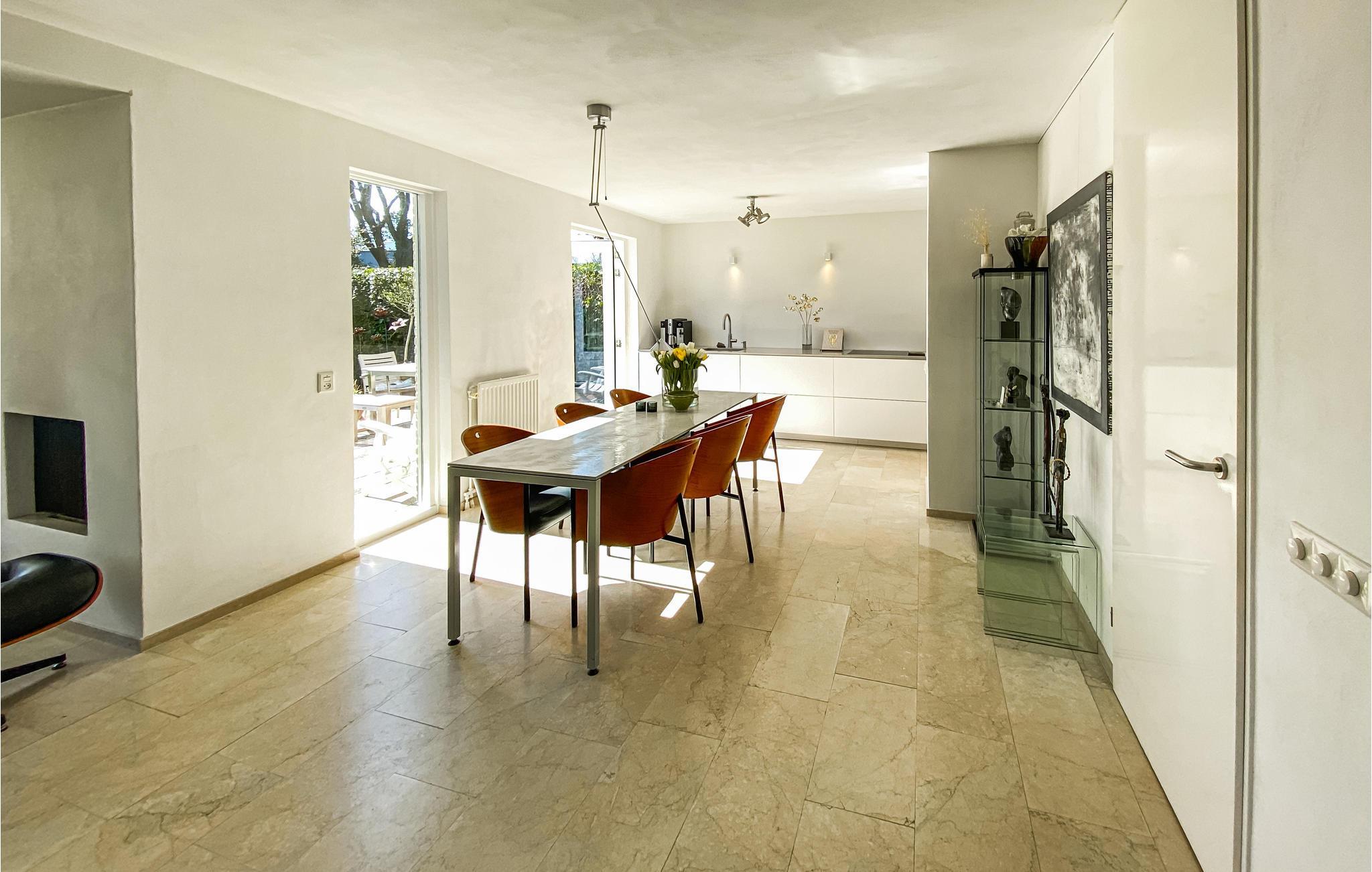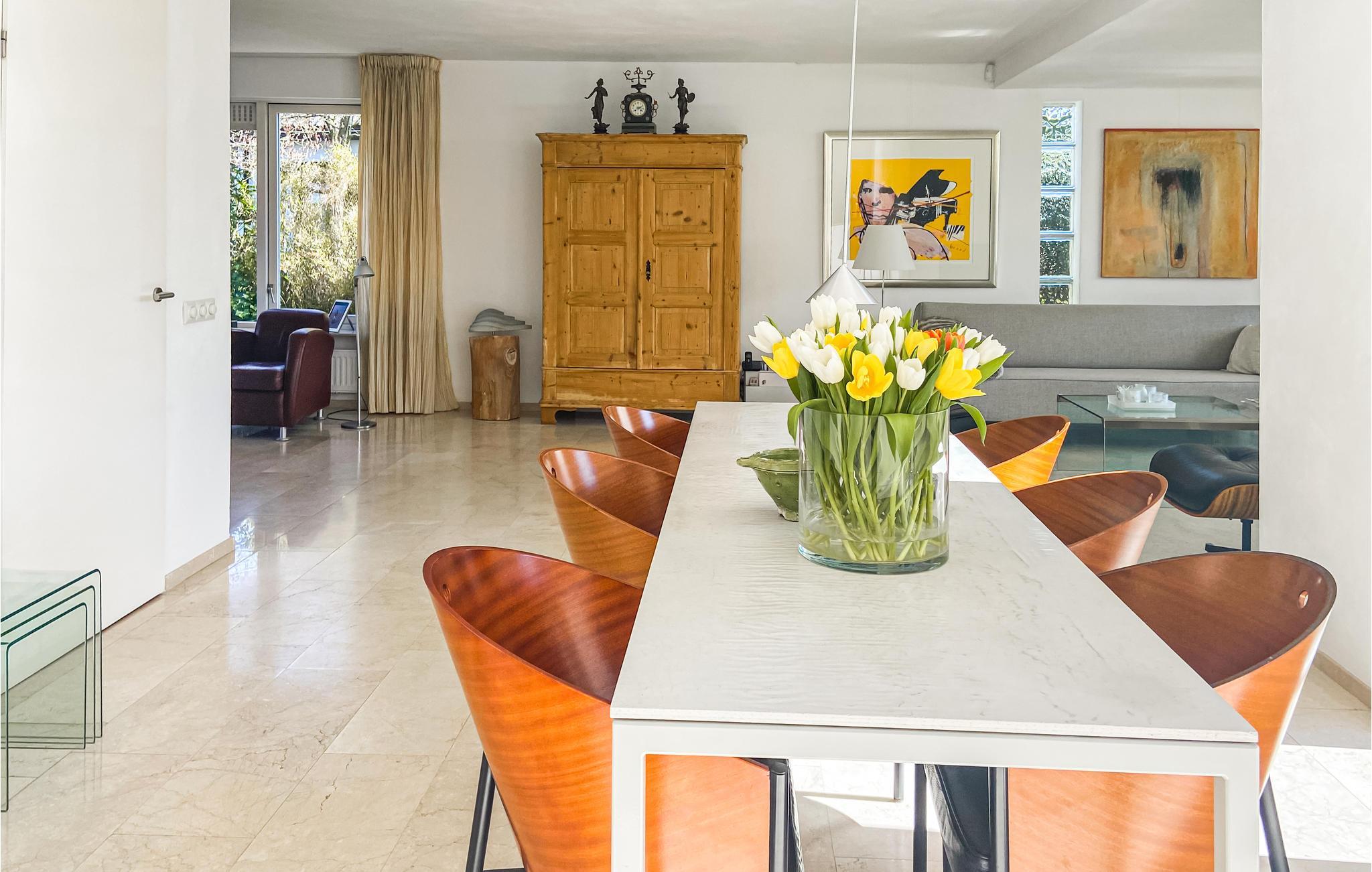 Durch die Eingangshalle mit Gäste-WC betreten Sie das geräumige Wohnzimmer mit TV-Ecke mit Sesseln, Esstisch mit 6 Stühlen und einer wunderbar hellen Sitzecke mit Kamin. Sie blicken auf den Garten und den breiten Graben und haben aufgrund der Lage im Süden viel Sonnenlicht.