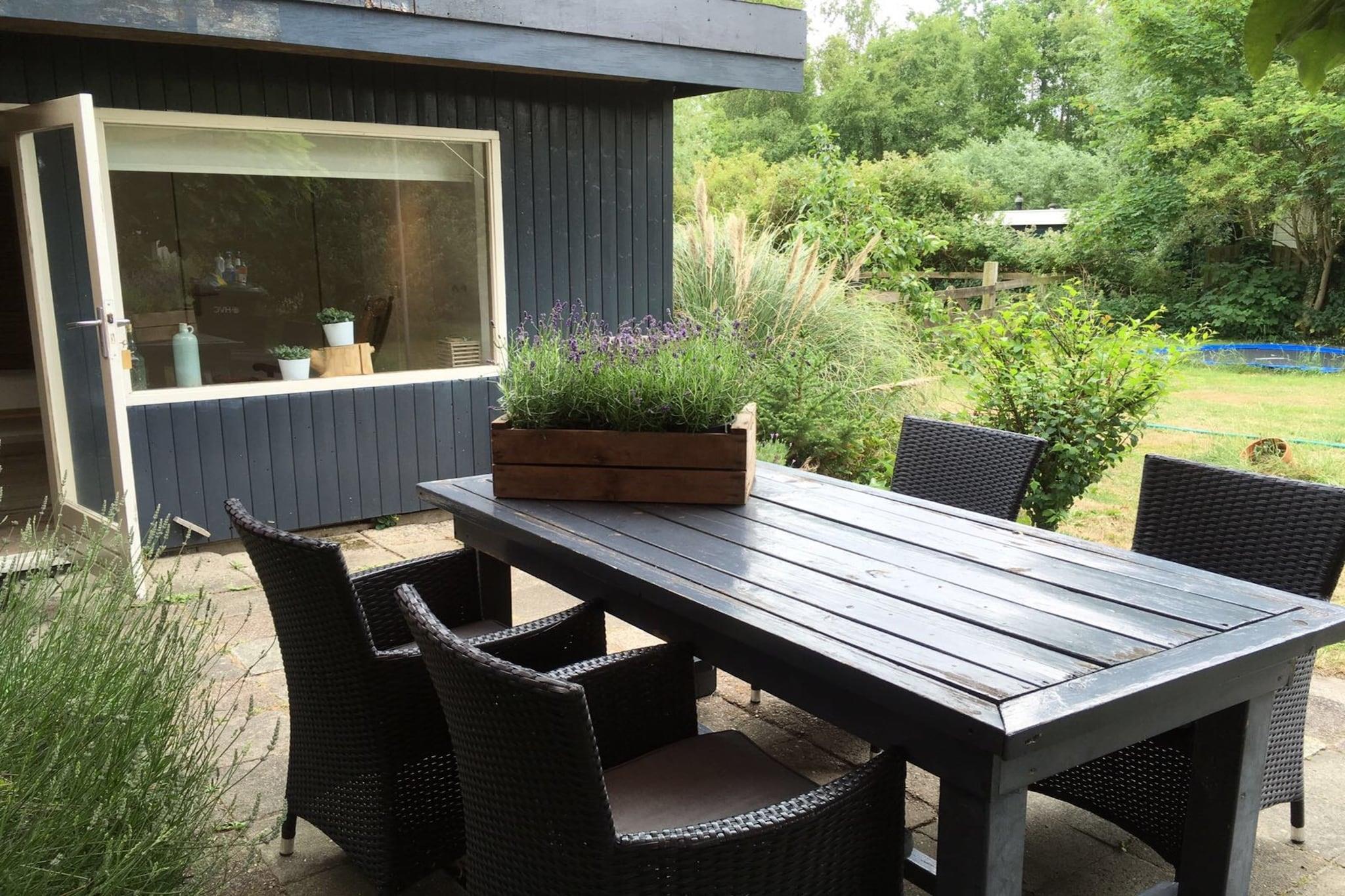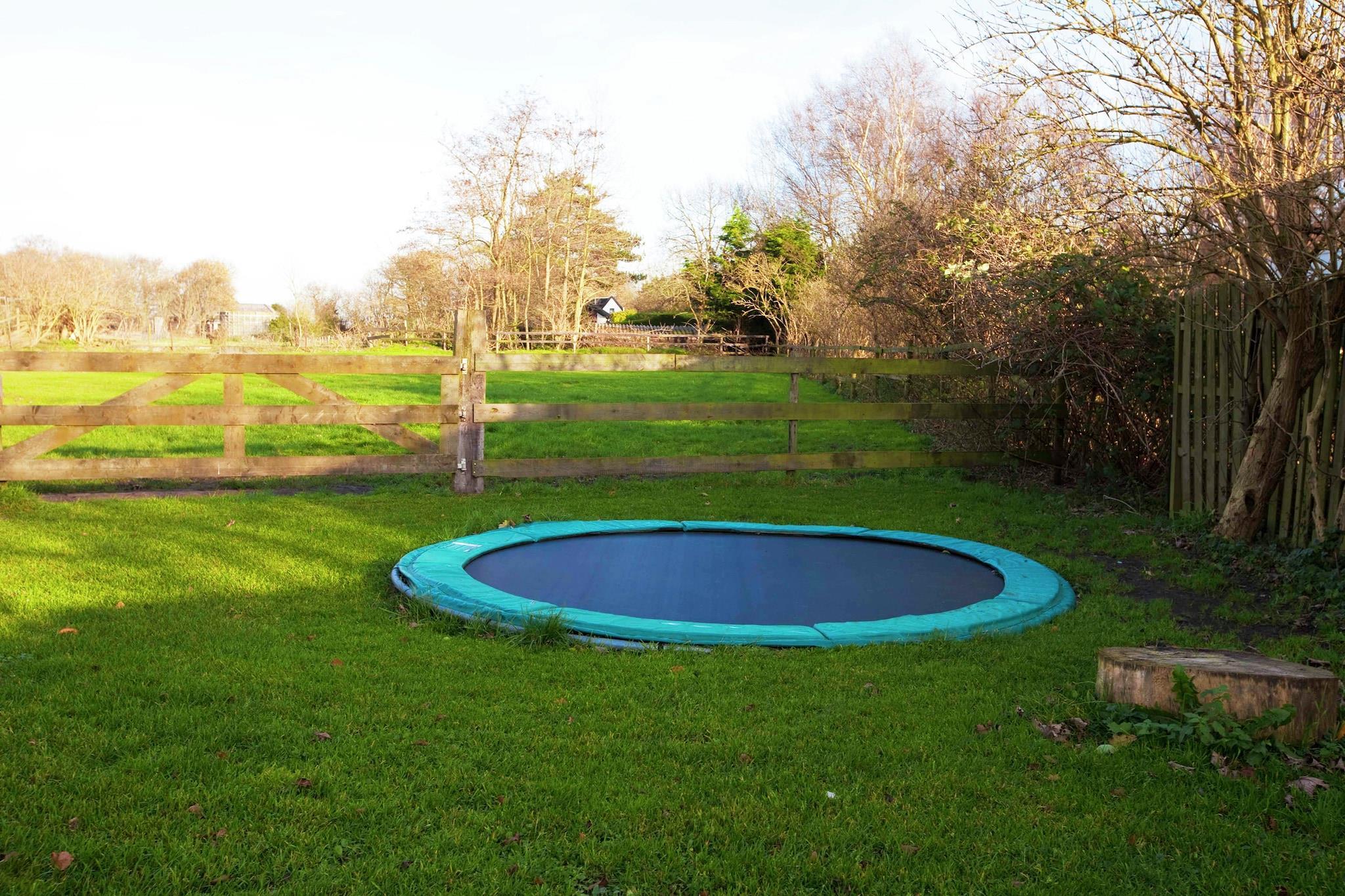 Ground floor: (Living room(double bed box, TV(flatscreen), dining table, seating area, DVD player), Kitchen(cooker(gas), coffee machine(pads), combination microwave, fridge-freezer, high chair), bedroom(double bed(two single duvets), camping cot), bathroom(shower, washbasin, toilet), washing machine, heating, terrace(private), garden(350 m2), BBQ, parking, trampoline)