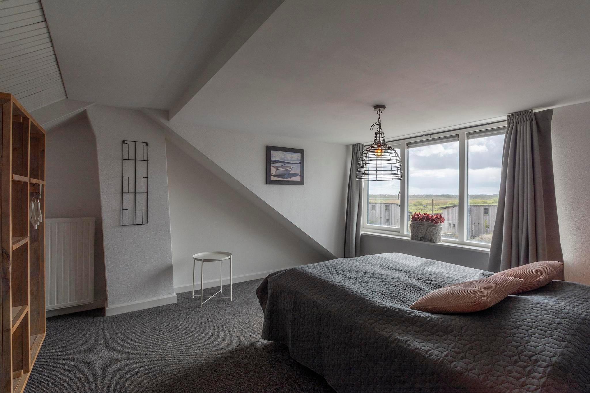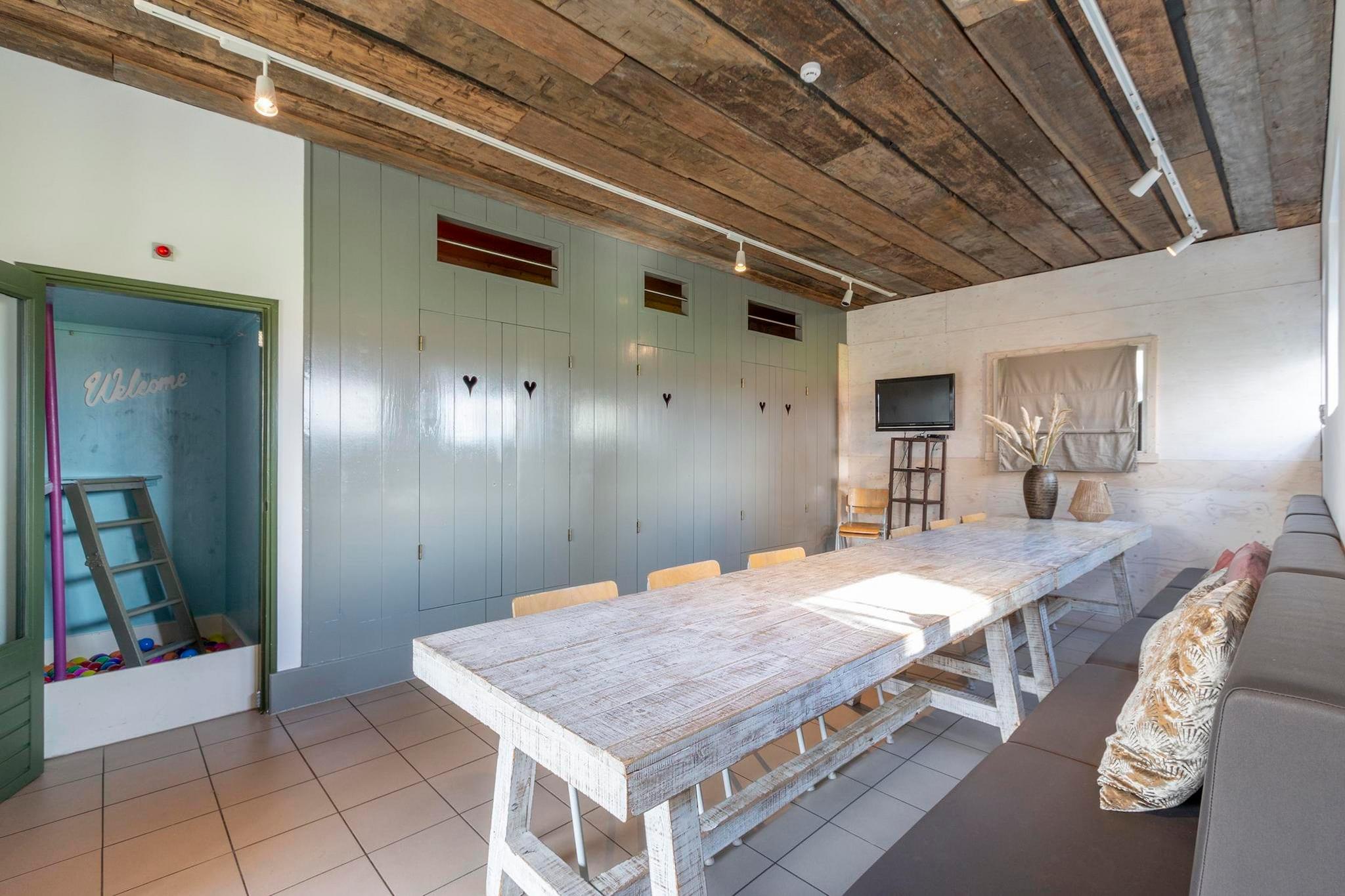 Perfect for large families or groups, this charming holiday home offers a cozy blend of rustic character and modern comforts. The spacious property is cleverly split into a front and rear section, providing both communal and private areas. At the back, a large group room is ideal for shared meals, games, or movie nights, and includes two box beds for four guests. A nearby children's room with three beds and a fun ball pit ensures younger guests are entertained. At the front, a welcoming living room with multiple seating areas and a working fireplace sets a warm tone. The adjoining dining space seats eight, and the semi-open kitchen is fully equipped with a 5-burner stove, oven, dishwasher, and ample cookware for up to 18 guests. Upstairs, the first floor features three double bedrooms, a room with two bunk beds, and a bathroom with a shower. The second floor adds two more bedrooms and a spacious bathroom with a whirlpool tub. Outside, the home is surrounded by a well-kept garden and a west-facing terrace, ideal for enjoying sunshine all day. A sliding door connects the group room directly to the fenced terrace. Located near Duynpark, guests also enjoy access to children’s play areas, making this the perfect retreat for family reunions or group escapes.