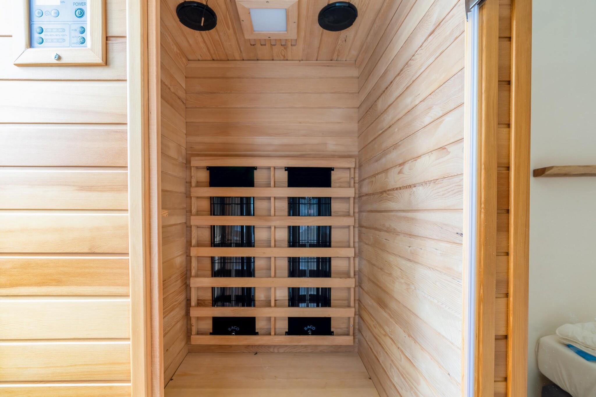 Ground floor: (Kitchen(hob(4 ring stoves, induction), electric kettle, toaster, coffee machine(pads), coffee machine(filter), combination microwave, dishwasher, fridge-freezer, Juicer), Living/diningroom(TV, dining table, seating area), bedroom(single bed(boxspring), single bed(boxspring)), bedroom(single bed(boxspring), single bed(boxspring)), bathroom(shower, washbasin, toilet), infrared sauna, air conditioning) balcony, bicycle storage, garden furniture, parking, children's bed, high chair