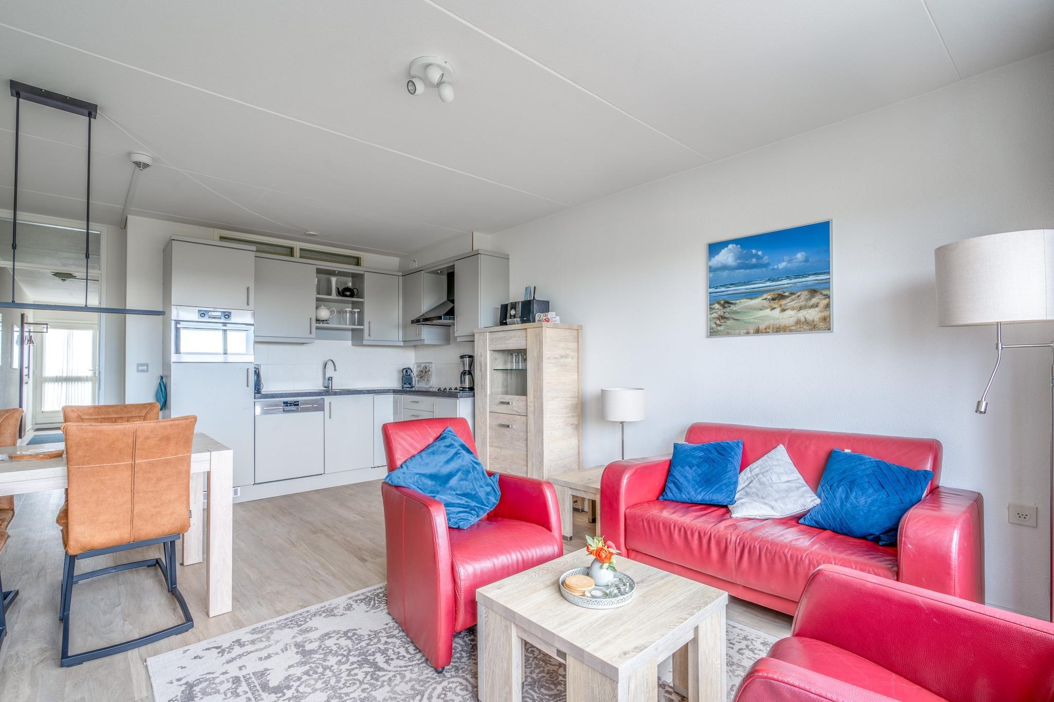 Apartment for 4 people with an island and sea view on the second floor. Balcony overlooking Texel, the dunes, and the North Sea. Living room with sitting area, dining table, TV, and stereo. Open-plan kitchen is equipped with a dishwasher, combination microwave, fridge-freezer, and various coffee machines. Two bedrooms, both with two single beds. The smallest bedroom is located in the middle of the apartment, so there is no window. Bathroom with sink and shower. The toilet is separate. Small bedroom: beds 70x200 cm. Balcony with views of the seaside resort of De Koog, the dunes, and the sea. Laundry facilities are available on site. Children's furniture is available upon request. Free Wi-Fi. Smoking is not permitted. One parking space is available on-site per accommodation.
