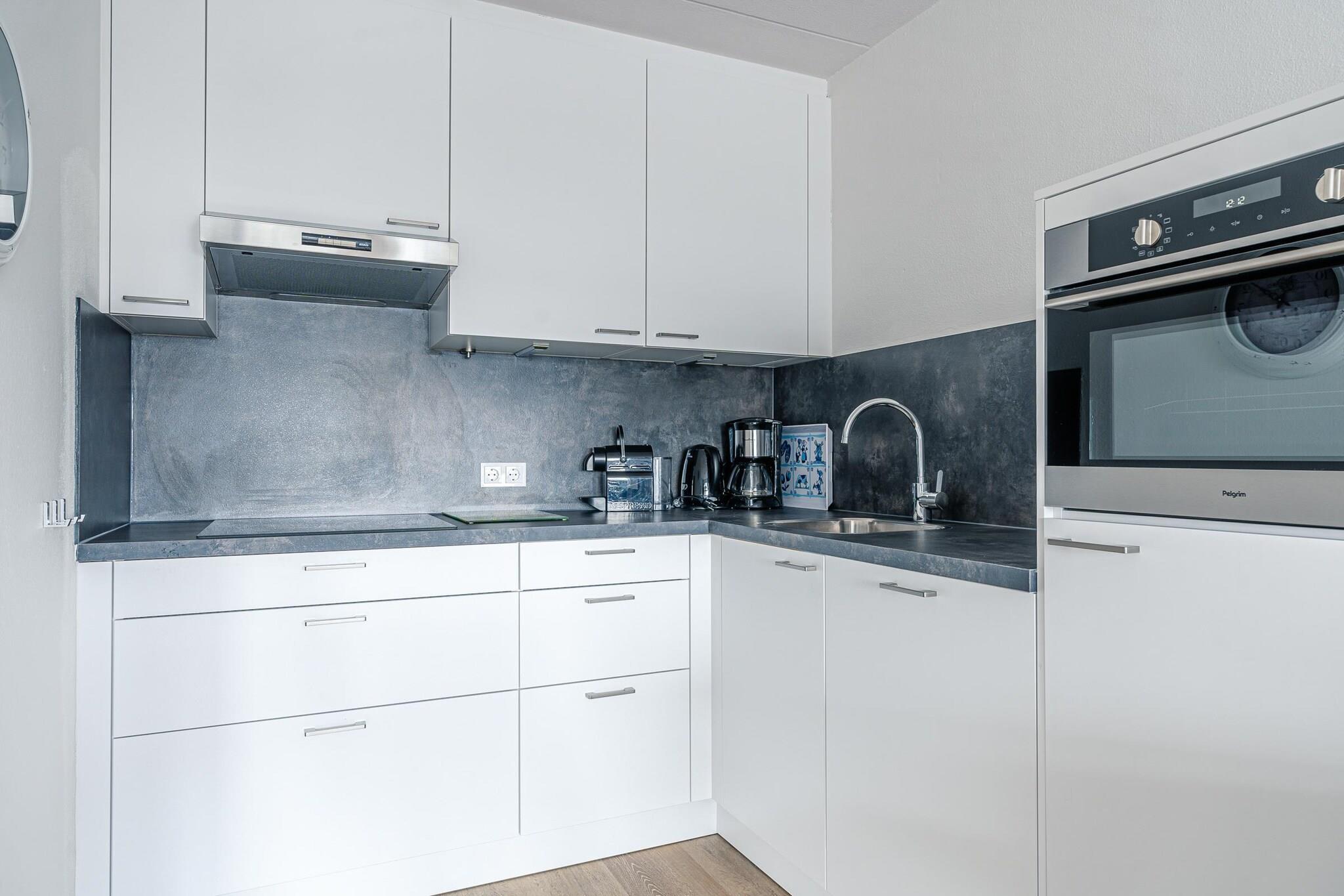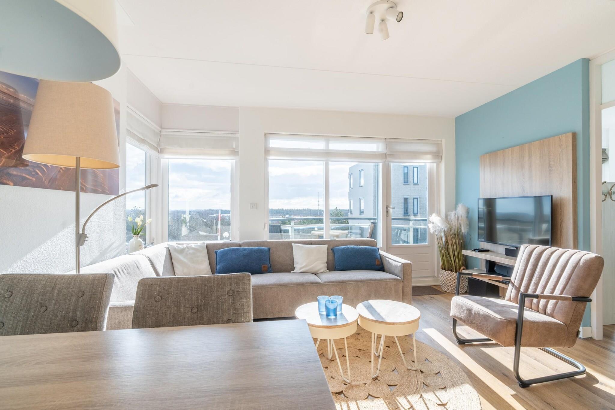 Charming 4-person apartment on the first floor with a balcony overlooking De Koog and the surrounding countryside. The spacious living room features a sitting area, TV, and a dining area with a dining table for 4. The neat open-plan kitchen is fully equipped, including a dishwasher, combination microwave, fridge-freezer, and various coffee machines. There are two bedrooms, one of which has a TV. Both bedrooms are furnished with two single box-spring beds. The well-maintained bathroom has a spacious walk-in shower and sink. The toilet is separate. The balcony offers the opportunity to admire a beautiful sunrise and is equipped with garden furniture. A laundry room is available on site for a fee. Children's furniture is available upon request and for a fee. Free Wi-Fi. Smoking is not permitted. One parking space is available on-site per accommodation.