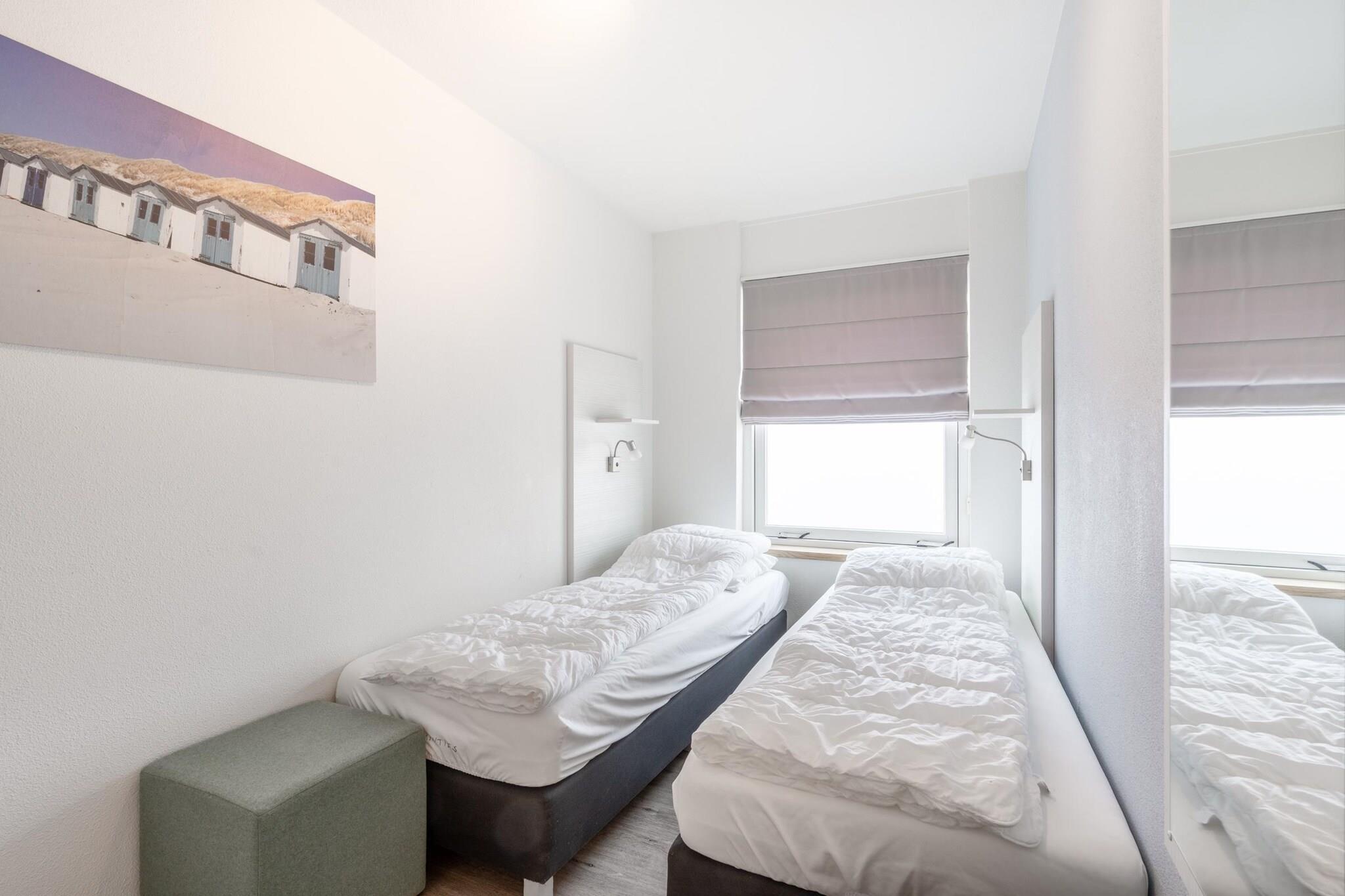 Tastefully furnished 4-person island view apartment on the second floor, with a balcony overlooking the seaside resort of De Koog and farmland. The cozy living room features a sitting area, fireplace, TV, music system, and a dining area with a dining table for 4. The open-plan kitchen is fully equipped, including a dishwasher, combination microwave, fridge-freezer, and various coffee machines. There are two bedrooms: the master bedroom has a double box-spring bed and a TV. The smaller bedroom has two single box-spring beds. The modern bathroom has a spacious walk-in shower and a double sink. The toilet is separate. The balcony is equipped with garden furniture and offers a view of the seaside resort of De Koog. From the terrace, you can admire a beautiful sunrise. Laundry facilities are available on site. Children's furniture is available upon request and for a fee. Free Wi-Fi. Smoking is not permitted. One parking space is available on-site per accommodation.