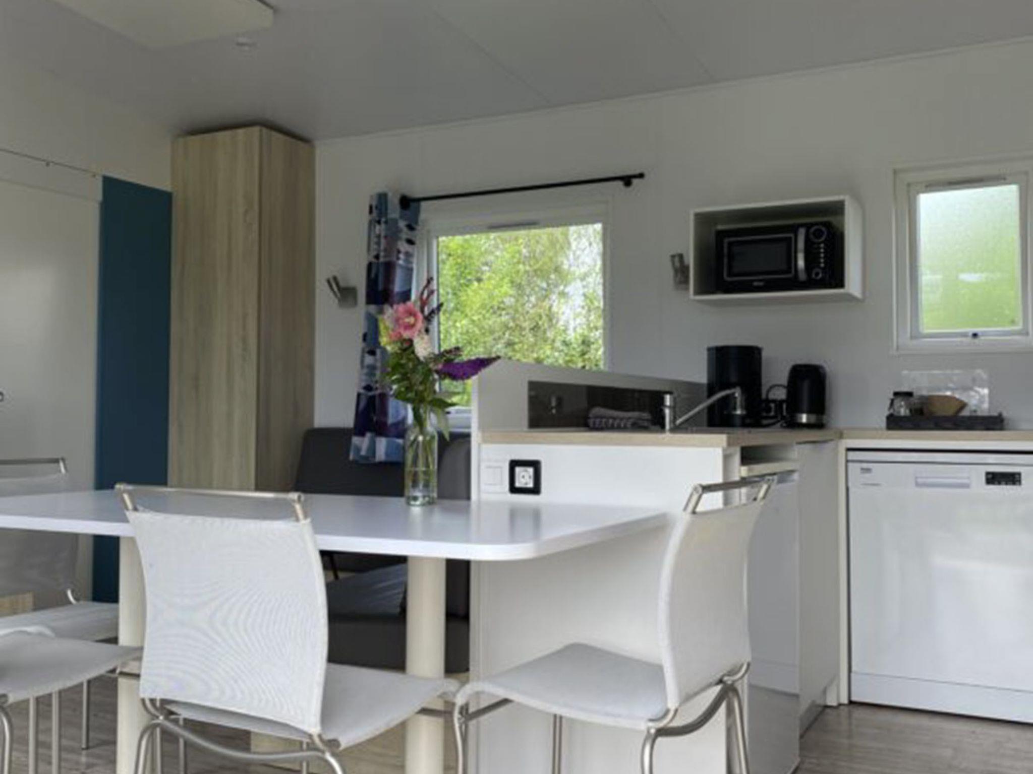 "6-persoons Eke", 4-room mobile home 40 m2. Comfortable furnishings: living/dining room with dining table and flat screen. Exit to the terrace. 2 rooms, each room with 2 beds. 1 room with 1 double bed. Open kitchen (4 hot plates, dishwasher, kettle, microwave, electric coffee machine). Shower/WC. Electric heating. Terrace. Terrace furniture. Facilities: Internet (WiFi, free). Please note: non-smokers only. Maximum 1 pet/ dog allowed. Smoke alarm.