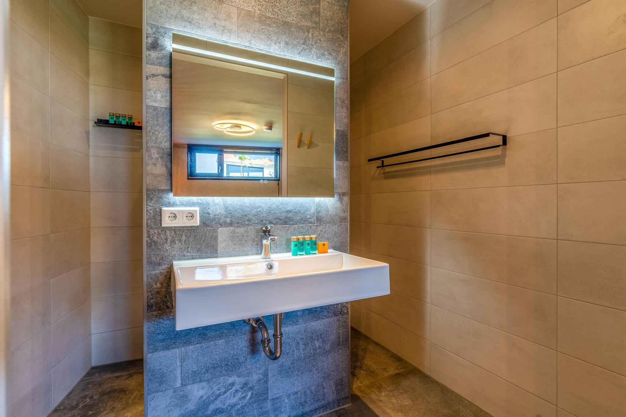 Ground floor: (open kitchen(bar(eating bar), hob(4 ring stoves, induction), toaster, combination microwave, dishwasher, fridge, freezer, Juicer), Living/diningroom(TV, dining table(8 persons), stove(wood), seating area), coffee machine(cups), coffee machine(filter), oven(steam), oven, oven) On the 1st floor: (Bedroom with bathroom(double bed(boxspring), TV, bath tub, shower, washbasin), Bedroom with bathroom(single bed(boxspring), single bed(boxspring), shower, washbasin)) Basement: (Bedroom with bathroom(single bed(boxspring), single bed(boxspring), TV, shower, washbasin), Bedroom with bathroom(double bed(boxspring), TV, bath tub, shower, washbasin, washbasin), relaxation area(sauna(8 persons))) outdoor kitchen, tumble dryer, hot tub, shower(outside), washing machine, heating(floor heating), terrace, bicycle storage, garden furniture, sun loungers, BBQ, parking, children's bed, high chair, stair gate, ironing board, iron, lounge set, Charging post for electric cars