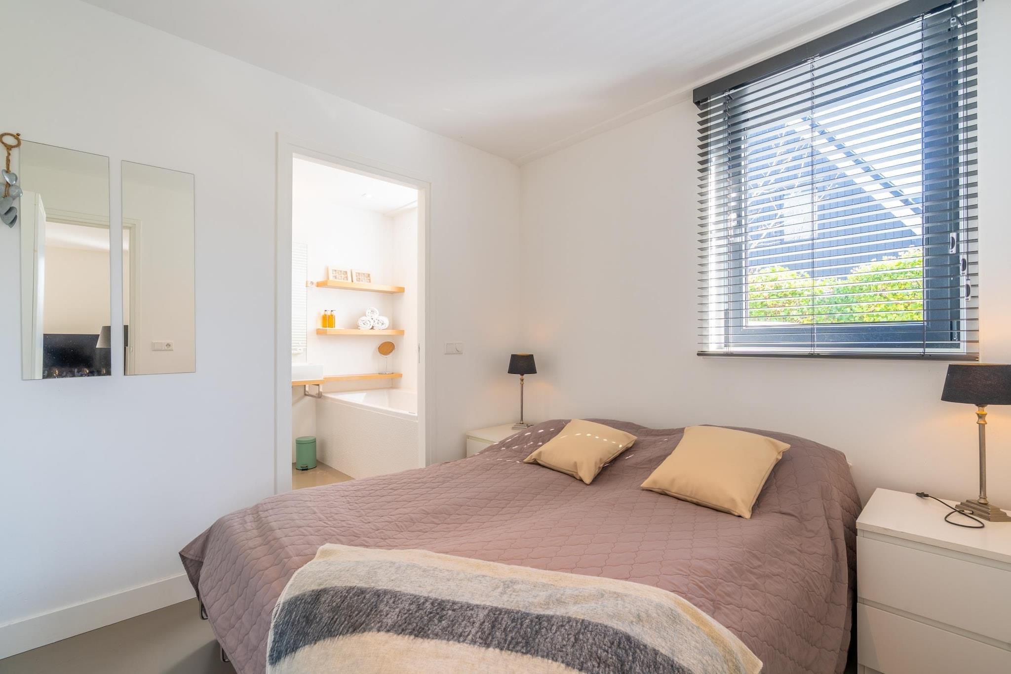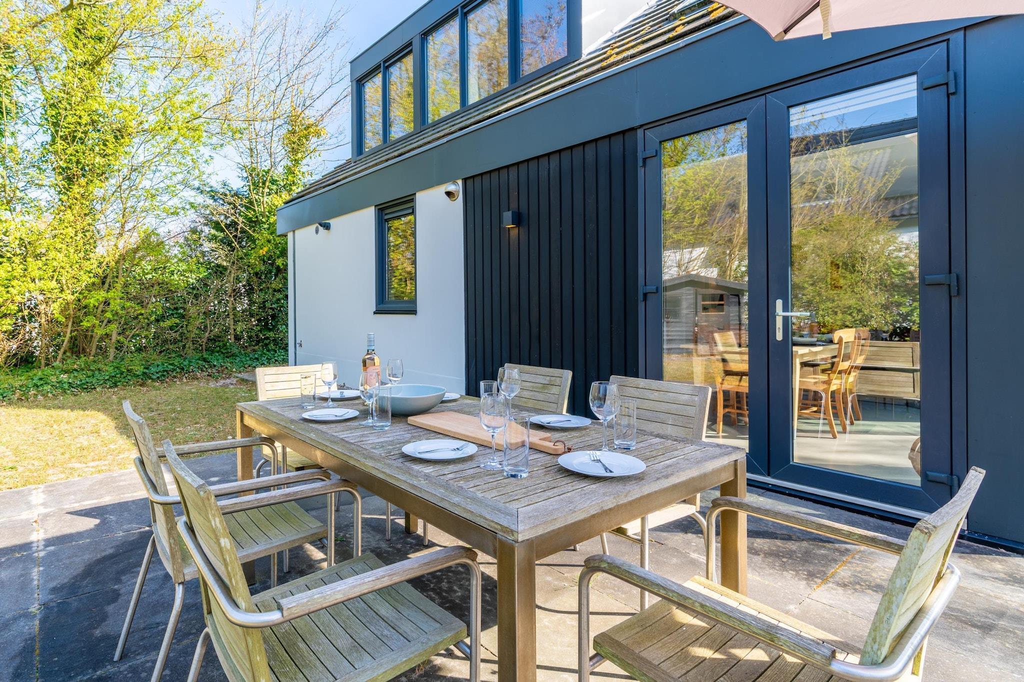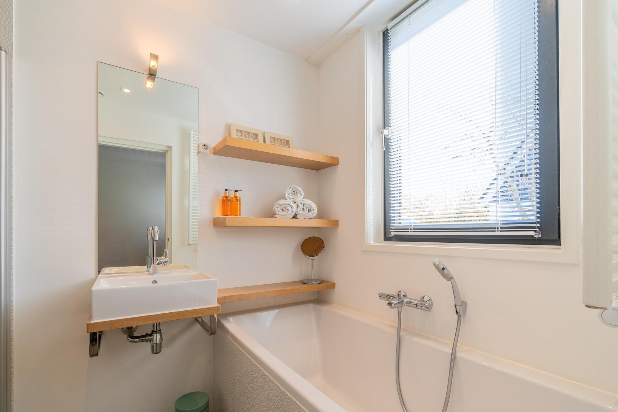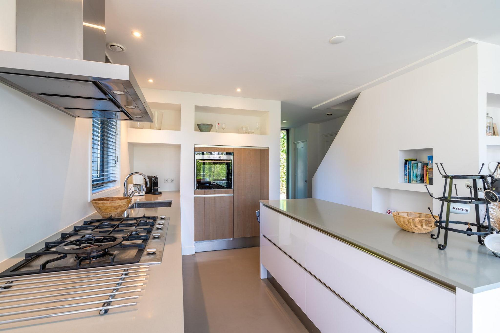 Luxurious 6-person holiday home with 2 bathrooms, situated on the edge of the forest. Spacious south-facing garden. Upon entering the living room, you'll find the delightful open-plan kitchen with a cooking island. The kitchen is fully equipped, including a dishwasher, convection oven, Quooker, filter coffee maker, and Nespresso coffee maker. There's also a spacious dining area with a dining table for 6 people, perfect for enjoying a meal. Passing the dining area, you'll enter the living room, which features a sitting area with a Smart TV. There are four bedrooms, one on the ground floor and three on the first floor. The living room leads to the bedroom, which has a comfortable double box-spring bed and an ensuite bathroom with a shower, sink, and bathtub. Upstairs, the bedrooms feature large windows, creating spacious and bright bedrooms. Two bedrooms have a comfortable double box-spring bed, and one has a comfortable single bed. The bathroom has a walk-in shower, sink, and toilet. There is also a separate toilet on the ground floor. Patio doors in the living room open onto the south-facing garden. The comfortable lounge sofa is perfect for relaxing. Garden furniture is provided. The accommodation has two private parking spaces. Children's furniture is available upon request, and additional children's furniture is available for a fee. A washing machine and dryer are available. Free Wi-Fi is available. Smoking is not permitted. The stairs are very steep, and there is no stair gate.