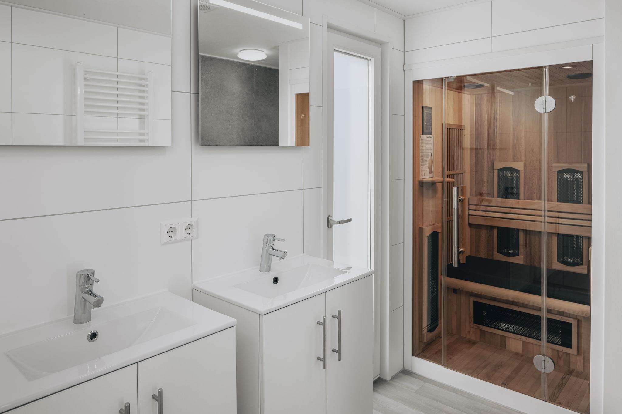 Ground floor: (Living room(TV(flatscreen, smart TV)), open kitchen(electric kettle, coffee machine(pads), combination microwave, dishwasher, fridge-freezer), bedroom(double bed or 2 single beds), bedroom(double bed or 2 single beds), bathroom(bath tub, shower(walk-in shower), infrared sauna, washbasin), toilet) terrace, garden, garden furniture, parking