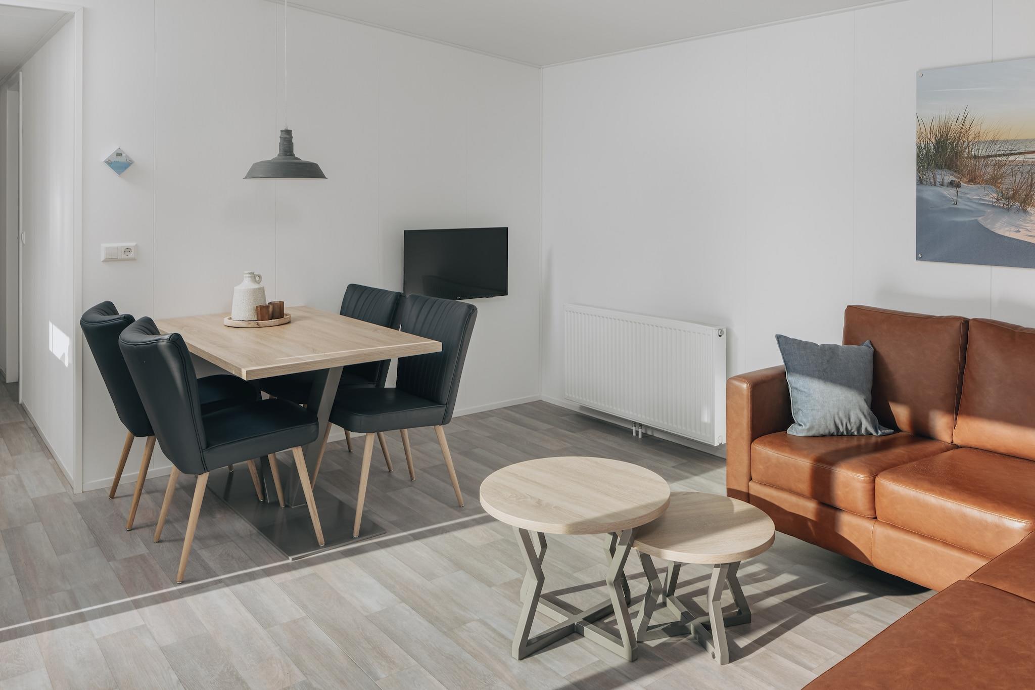 This modern, detached chalet, built in 2020, offers a comfortable stay in a scenic setting. It features a cozy living room with a Smart TV and two well-appointed bedrooms, each furnished with two single box-spring beds that can be arranged together or separately. The bathroom includes a luxurious walk-in shower, a bathtub, and an infrared sauna for added relaxation. A separate toilet provides extra convenience. While pets are not allowed, families are welcome, though a cot can only be placed in the living area. Parking is available in the central lot near the chalet. Located just 650 meters from the lively town center, this holiday home provides easy access to beautiful sandy beaches and nature reserves. Guests can explore charming cafes, seaside restaurants, and local markets offering fresh produce and regional delicacies. The area also features cycling and hiking trails, wellness centers, and golf courses, ensuring plenty of leisure activities for all visitors. The chalet includes an open-plan kitchen equipped with a dishwasher, microwave, and ample counter space for preparing meals. A private terrace with garden furniture allows guests to enjoy outdoor dining in a peaceful setting. With modern amenities and an ideal location, this accommodation is perfect for a relaxing coastal getaway. Note: The swimming pool at this park is currently closed, but you can use the pool at Beach Resort Kamperland nearby for free. This way, a day of water fun remains part of your holiday.