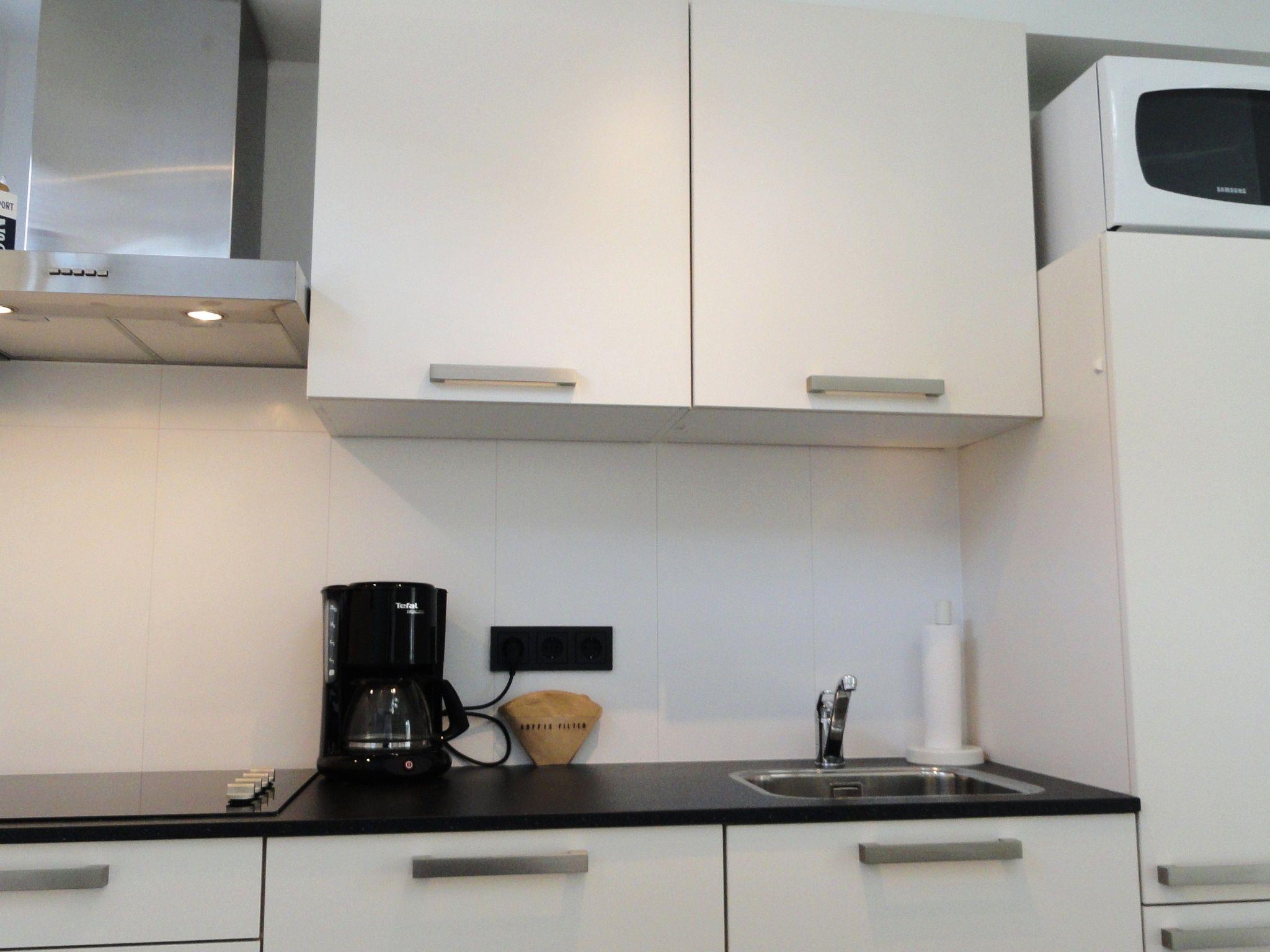 The kitchen is equipped with a Combi-Magnetron, Fridge with Freezer, Coffee pod machine and a Coffee filter machine, Bread/Toaster, a Mixer and Cutlery.