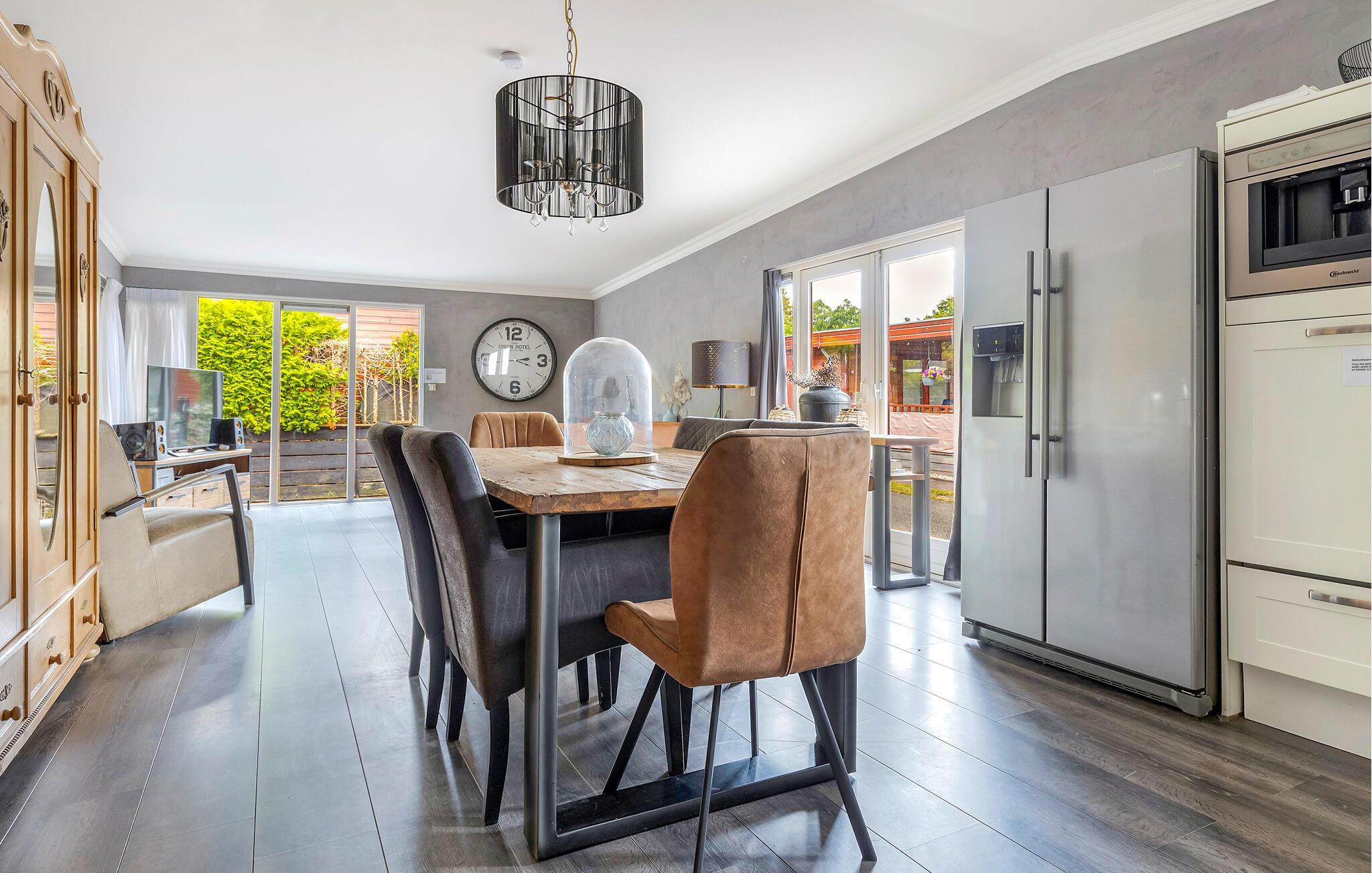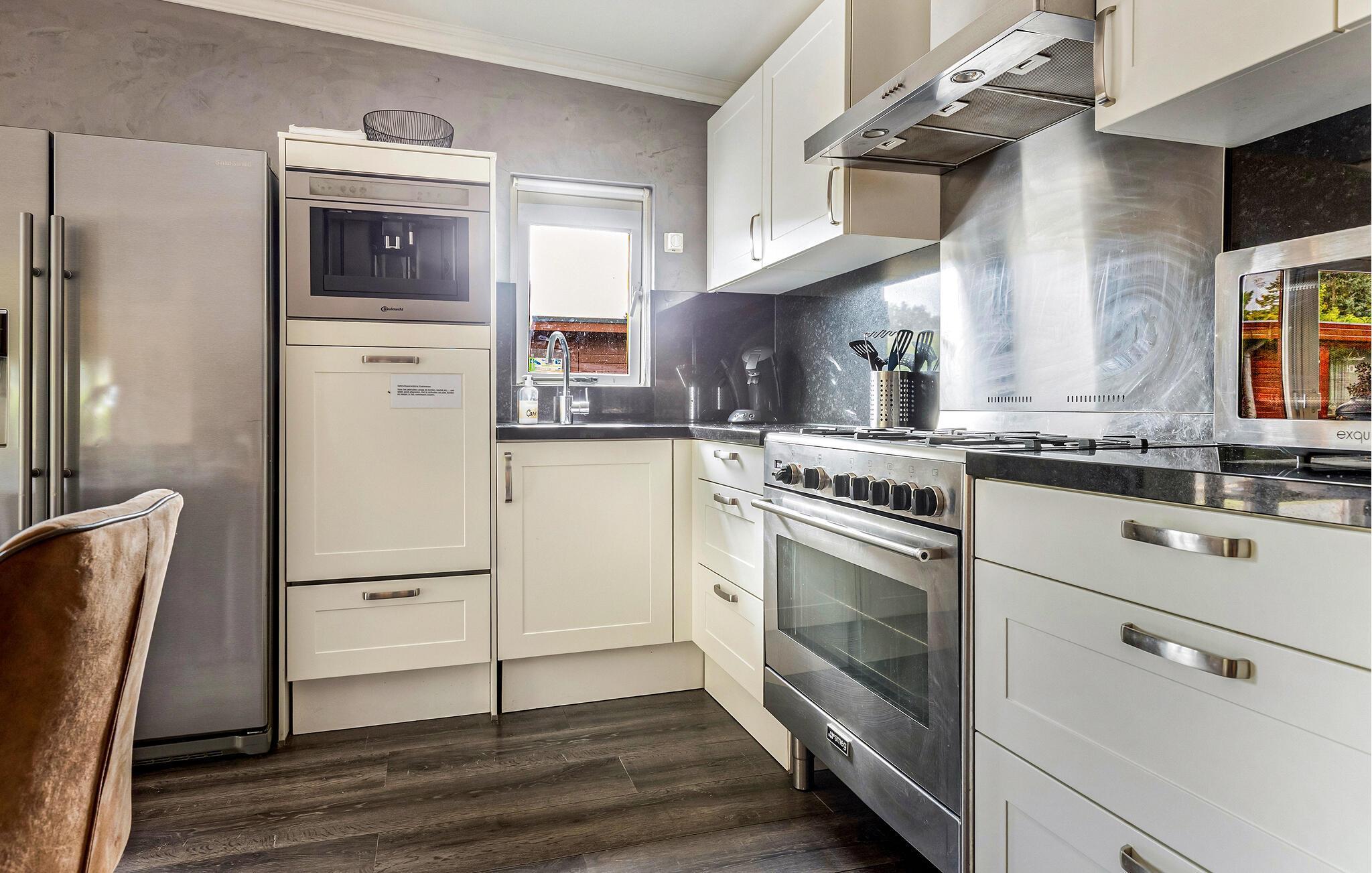 Verbringen Sie erholsame Tage in einem charmanten Ferienhaus mitten im Grünen und mit viel Komfort. Betreten Sie den hellen, liebevoll eingerichteten Wohnbereich mit großen Fenstern und gemütlichen Sofas. Die geschmackvolle Einrichtung in sanften Farben schafft eine freundliche und einladende Atmosphäre. Lehnen Sie sich zurück und lassen Sie den Blick ins Grüne schweifen. Essen Sie am Esstisch neben der offenen Küche, die zum gemeinsamen Kochlöffelschwingen einlädt.