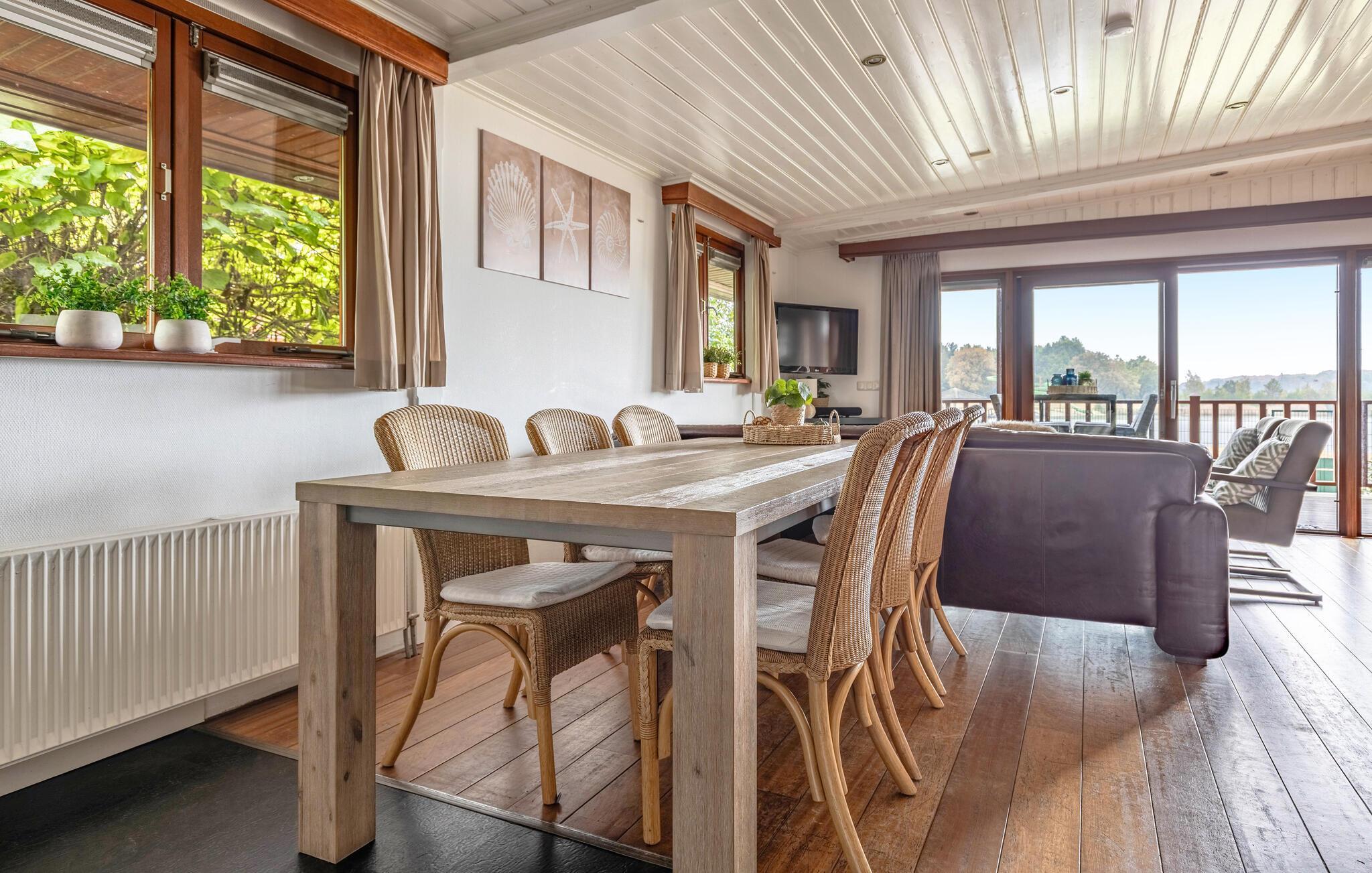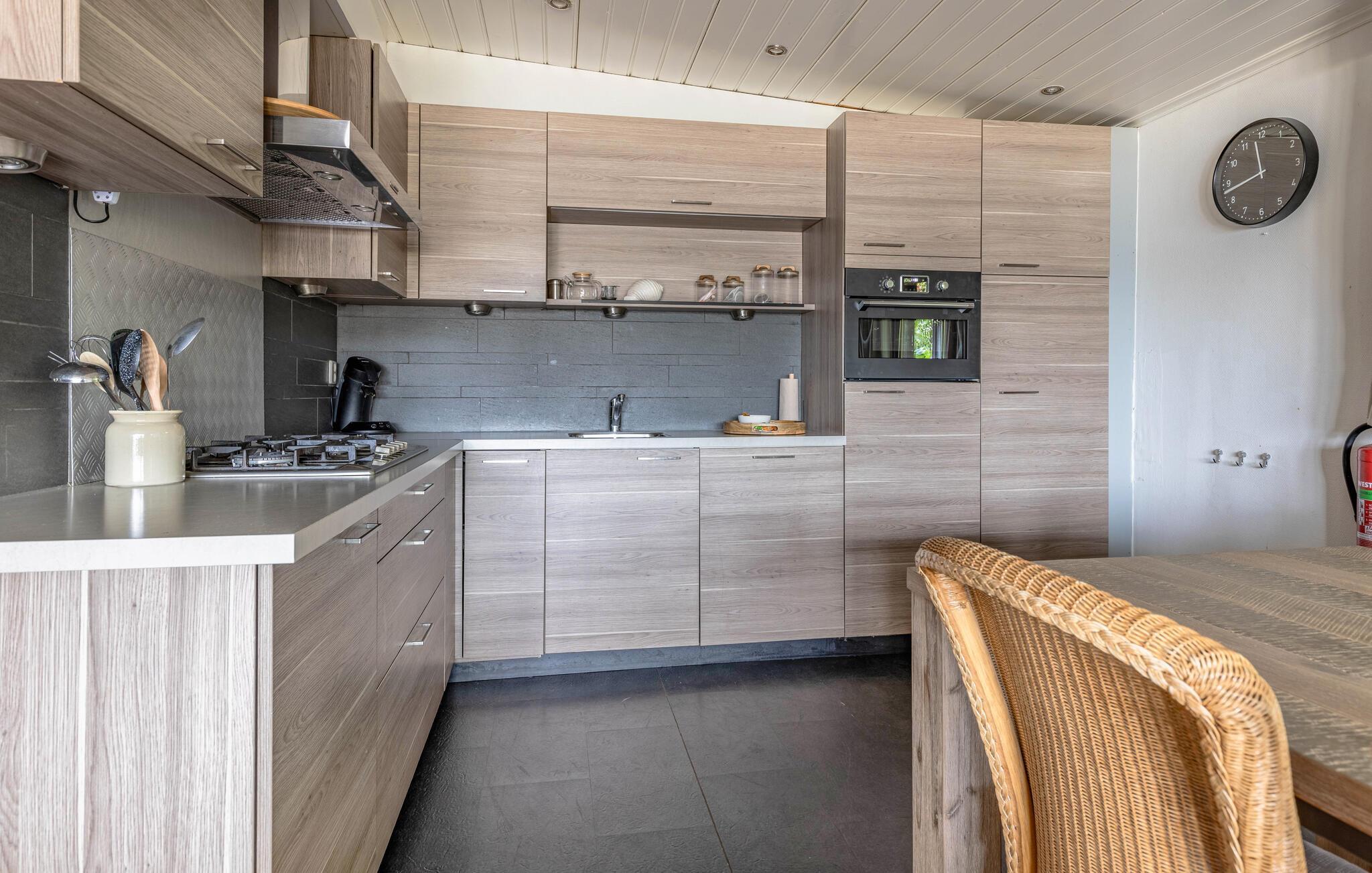 Verbringen Sie einen erholsamen Urlaub in diesem charmanten Ferienhaus mitten im Grünen und mit viel Komfort. Betreten Sie den hellen, liebevoll eingerichteten Wohnbereich mit großen Fenstern und gemütlichen Sitzgelegenheiten. Die geschmackvolle Einrichtung in sanften Farben schafft eine freundliche und einladende Atmosphäre. Lehnen Sie sich zurück und lassen Sie den Blick ins Grüne schweifen. Essen Sie am Esstisch neben der offenen Küche, die zum gemeinsamen Kochlöffelschwingen einlädt.