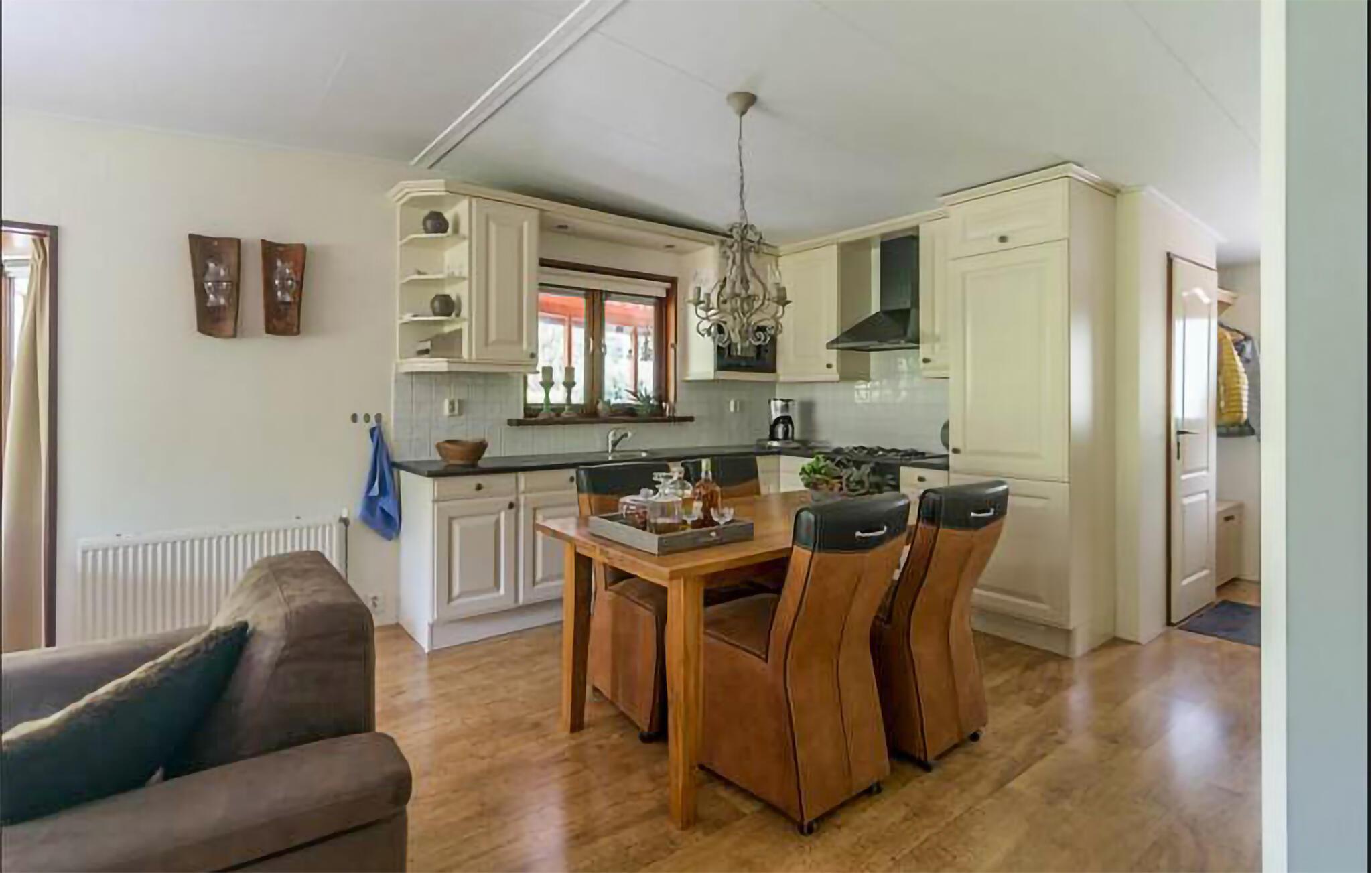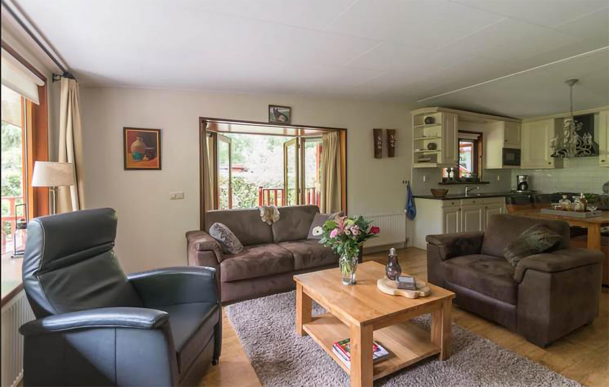 Verbringen Sie erholsame Tage in einem charmanten Ferienhaus mitten im Grünen und mit viel Komfort. Betreten Sie den hellen, liebevoll eingerichteten Wohnbereich mit großen Fenstern und gemütlichen Sitzgelegenheiten. Die geschmackvolle Einrichtung in sanften Farben schafft eine freundliche und einladende Atmosphäre. Lehnen Sie sich zurück und lassen Sie den Blick ins Grüne schweifen. Essen Sie am Esstisch neben der offenen Küche, die zum gemeinsamen Kochlöffelschwingen einlädt. Entspannung pur bietet die Infrarot-Sauna.