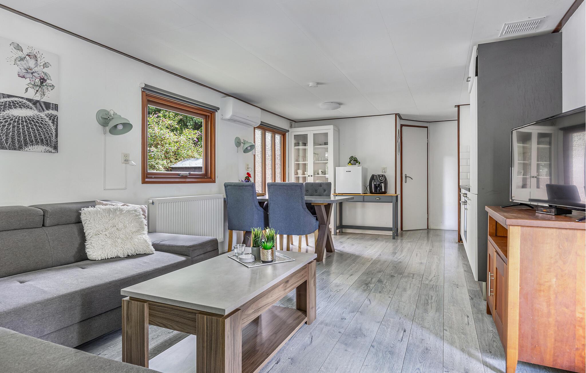 Verbringen Sie erholsame Tage in einem charmanten Ferienhaus mitten im Grünen und mit viel Komfort. Betreten Sie den hellen, liebevoll eingerichteten Wohnbereich mit großen Fenstern, gemütlichen Sofas. Die geschmackvolle Einrichtung in sanften Farben schafft eine freundliche und einladende Atmosphäre. Lehnen Sie sich zurück und lassen Sie den Blick ins Grüne schweifen. Essen Sie gemeinsam am schönen Esstisch oder nutzen Sie die angrenzende Küche zum gemeinsamen Kochlöffelschwingen.