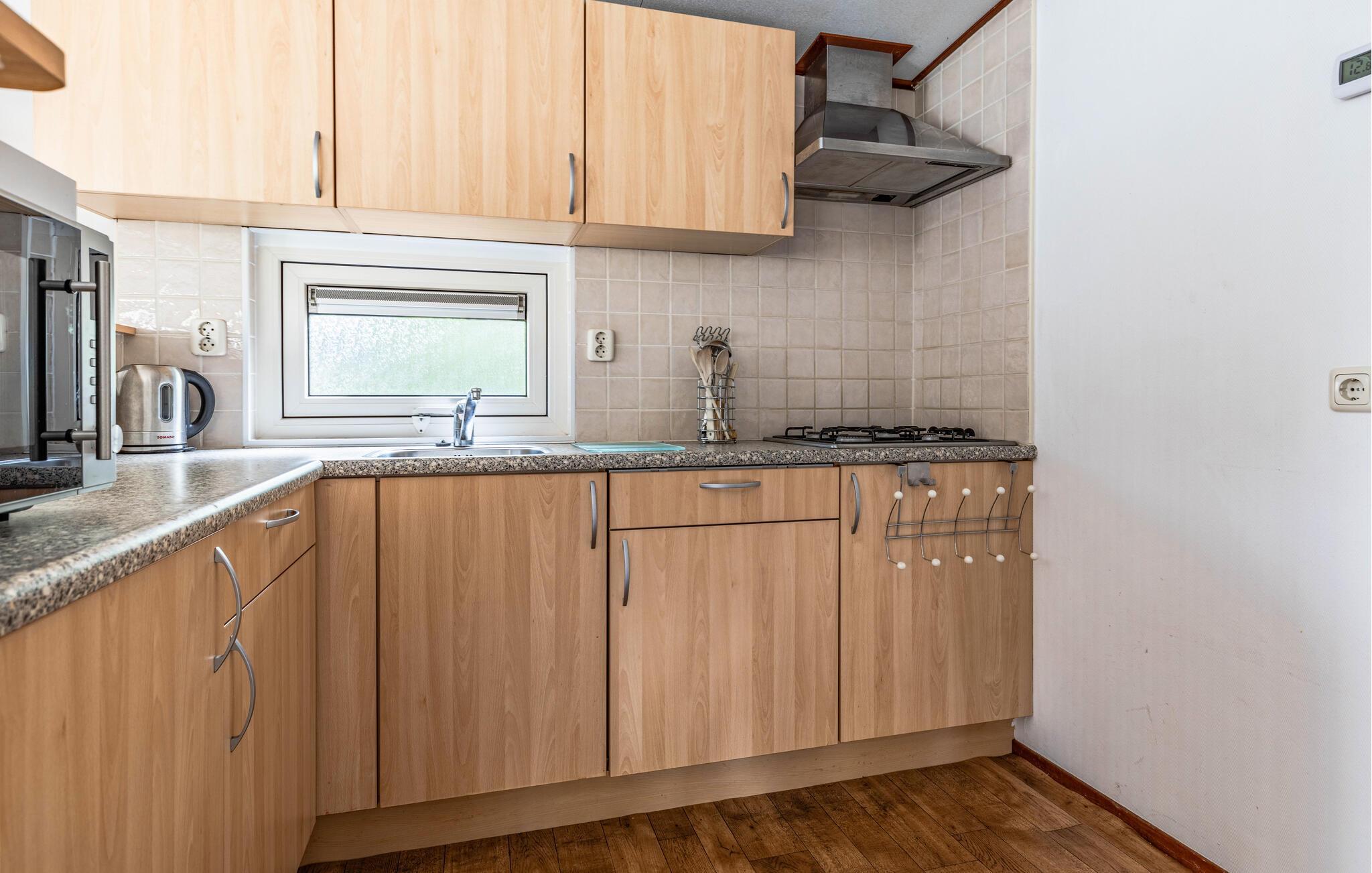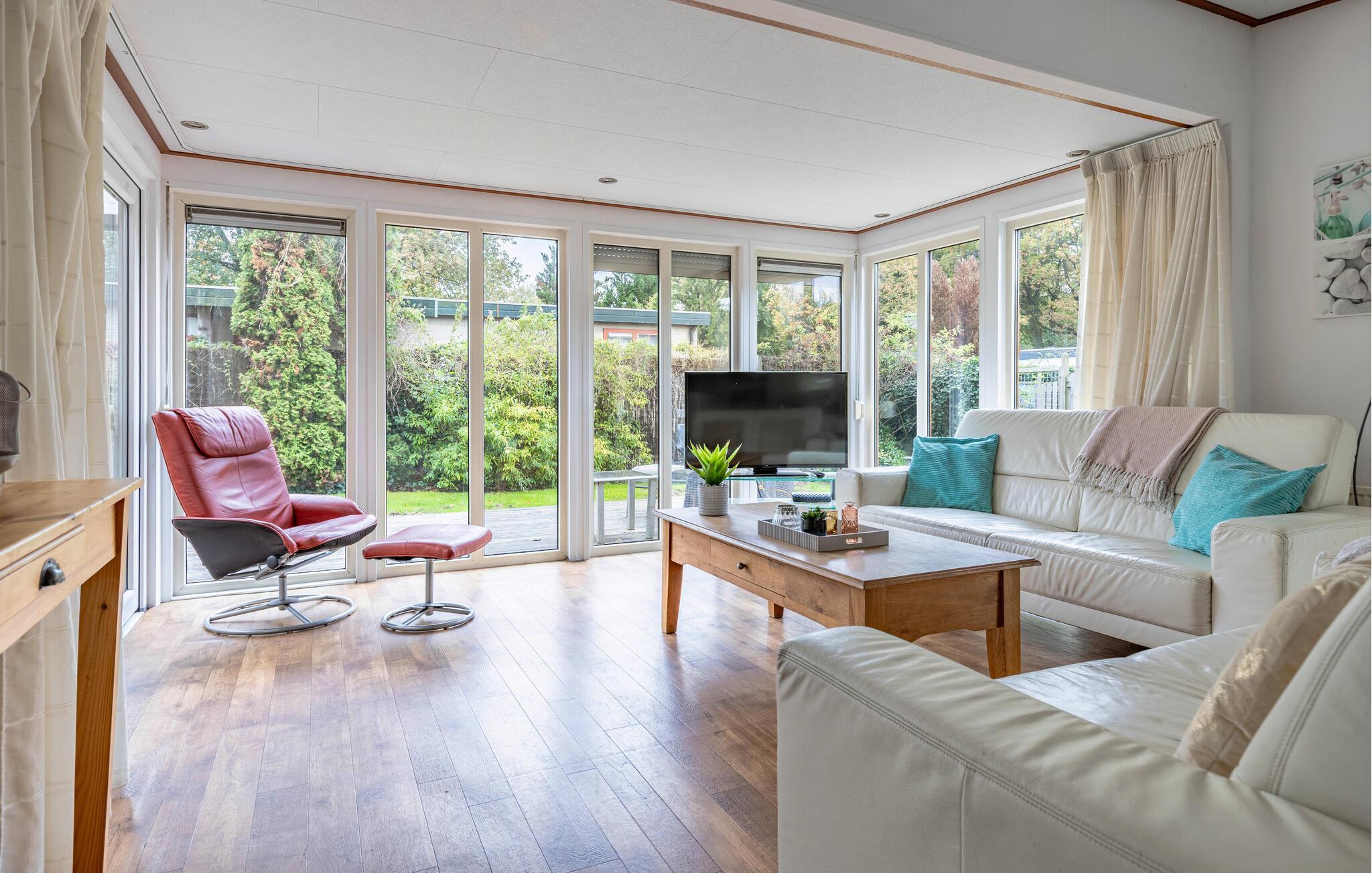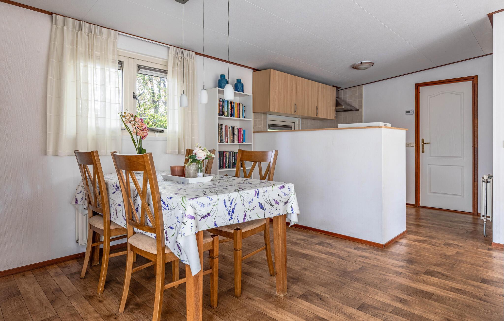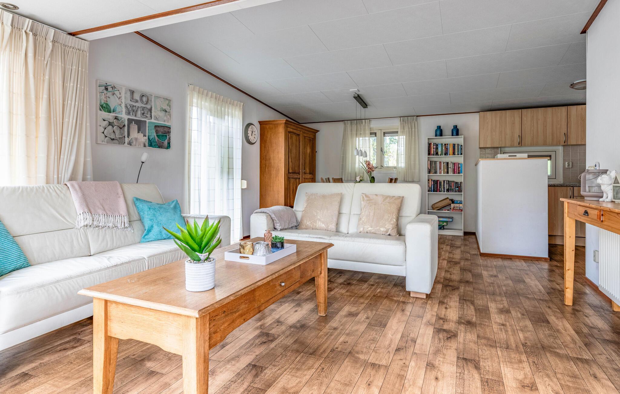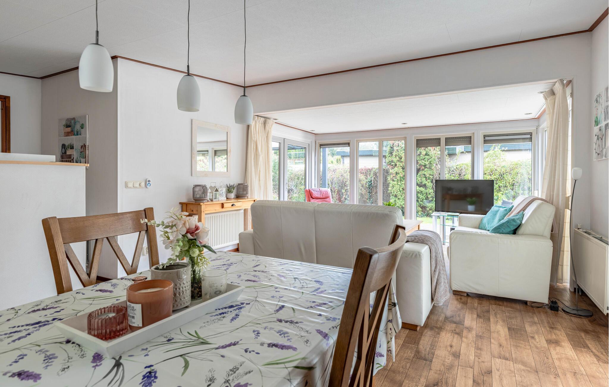 Verbringen Sie einen erholsamen Urlaub in diesem charmanten Ferienhaus mitten im Grünen und mit viel Komfort. Betreten Sie den hellen, liebevoll eingerichteten Wohnbereich mit großen Fenstern und gemütlichen Sitzgelegenheiten. Die geschmackvolle Einrichtung in sanften Farben schafft eine freundliche und einladende Atmosphäre. Lehnen Sie sich zurück und lassen Sie den Blick ins Grüne schweifen. Essen Sie am Esstisch neben der offenen Küche, die zum gemeinsamen Kochlöffelschwingen einlädt.