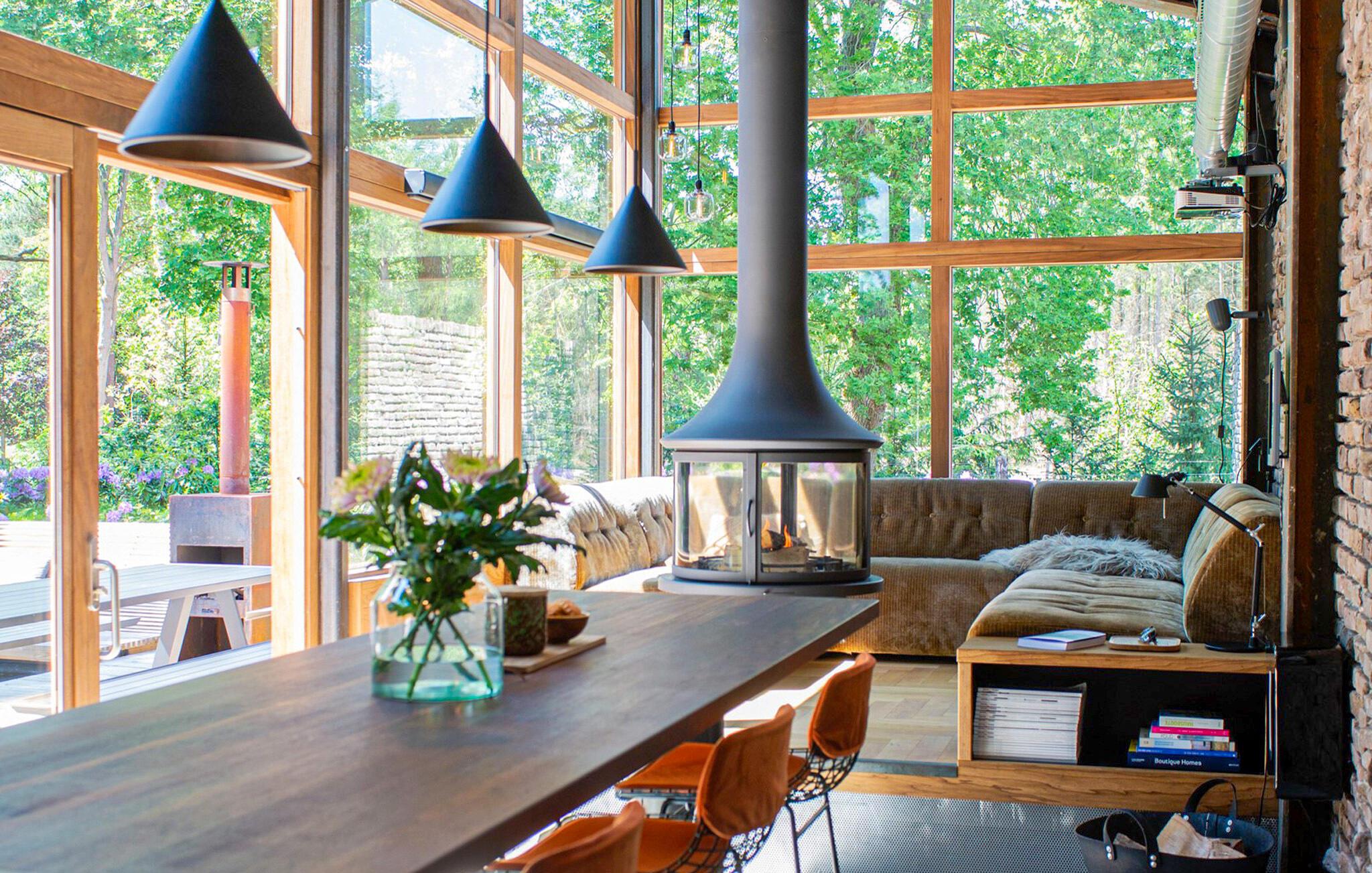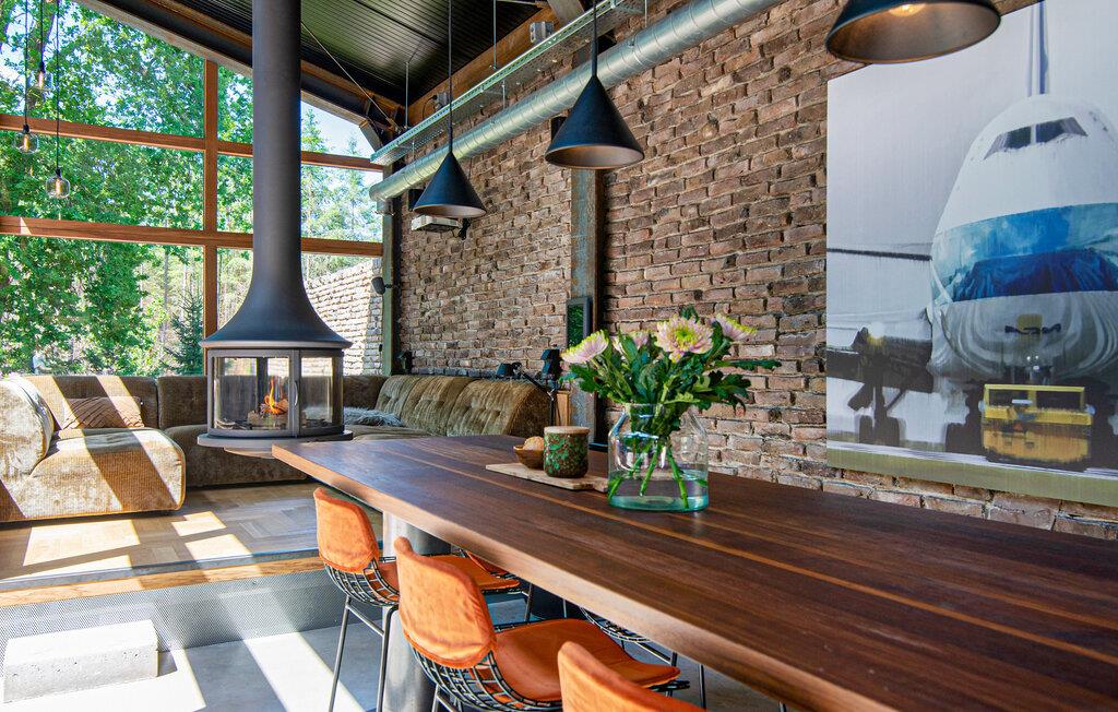 Genießen Sie Ihren Aufenthalt in diesem außergewöhnlichen Haus, das moderne Architektur eindrucksvoll mit einer ruhigen, natürlichen Umgebung verbindet. Machen Sie es sich auf dem geräumigen Sofa im Wohnzimmer bequem, das direkt vor den bodentiefen Fenstern steht. Verbringen Sie gemütliche Abende am zentral angeordneten Kamin und genießen Sie die wohltuende Wärme. Bereiten Sie Ihre Mahlzeiten in der stilvollen Küche mit ihrer langen Arbeitsfläche zu oder versammeln Sie sich zum gemeinsamen Essen um den großen Holztisch.