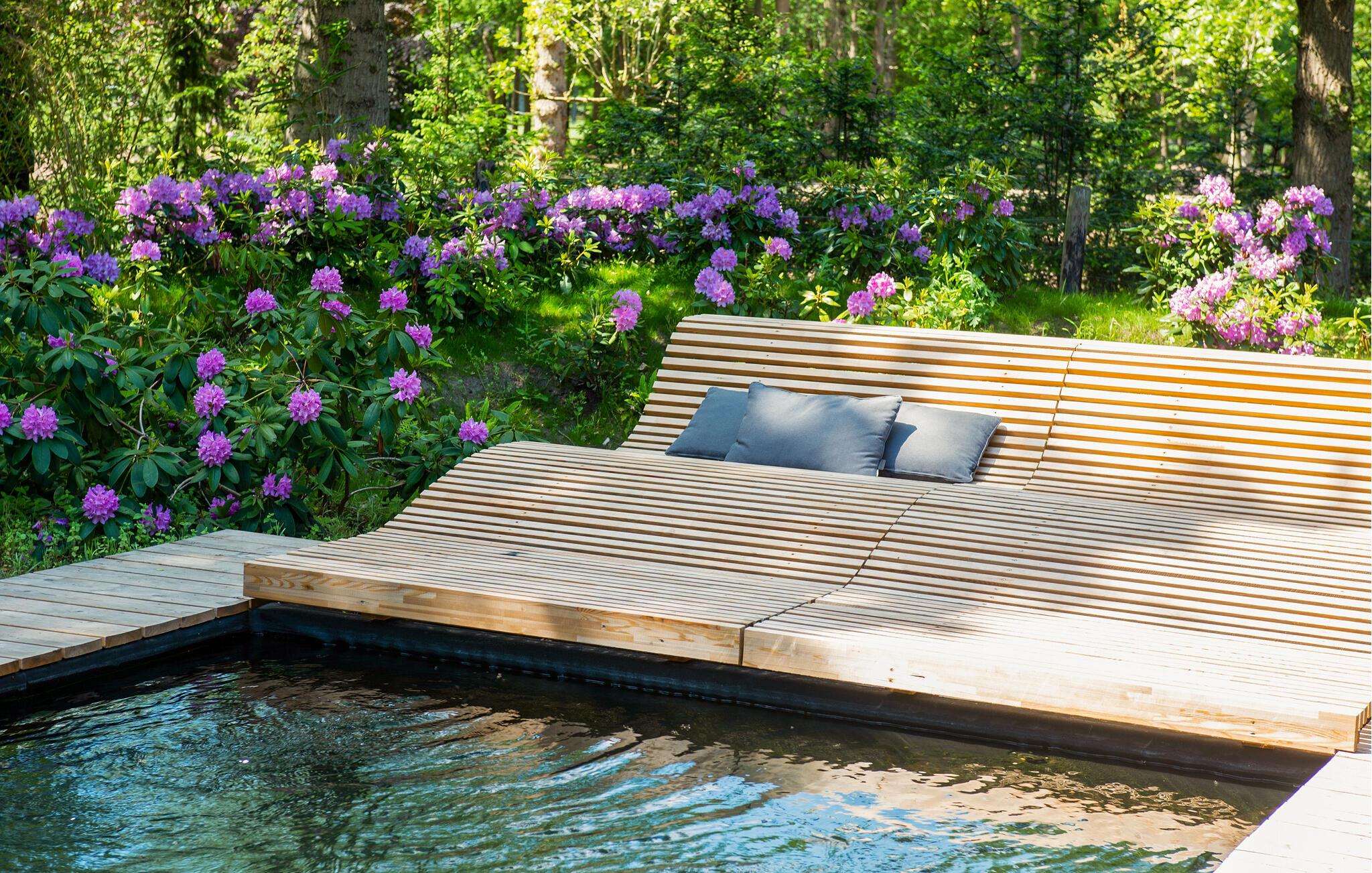 Draußen können Sie auf der modernen Terrasse die Sonne genießen. Suchen Sie sich ein Plätzchen auf der Sonnenterrasse oder entspannen Sie sich am Wasser auf der Liegebank, um den Tag ausklingen zu lassen. Die üppige Bepflanzung und die hohe Natursteinmauer schaffen eine private Atmosphäre, ideal für ruhige Momente im Freien.