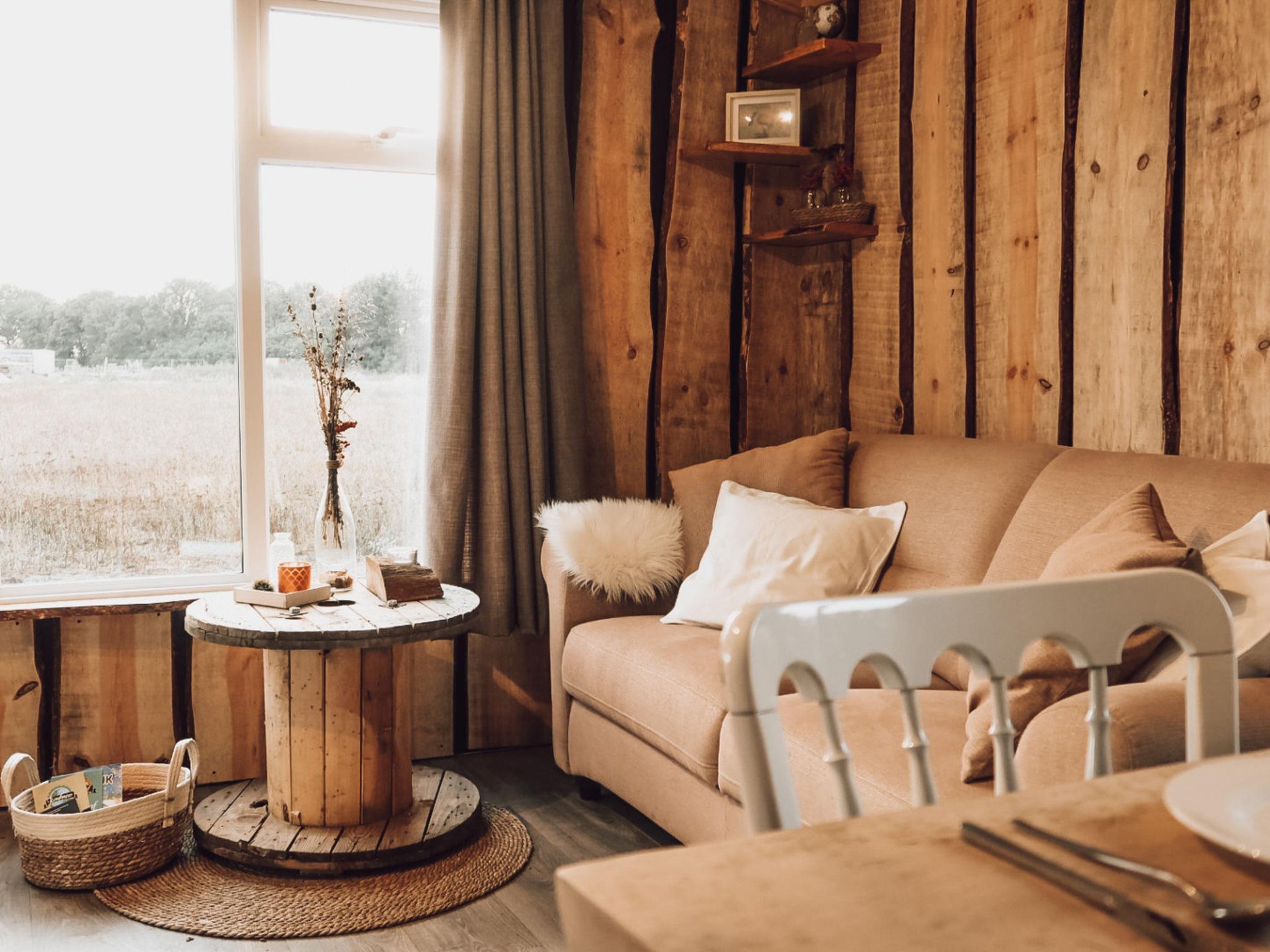 The chalet has three bedrooms: one with a comfortable double bed and two rooms with two single beds each, ideal for families or groups of friends. In the cosy living room, you'll find a seating area where you can relax after a day in nature, and a dining table where you can eat together. The double garden doors provide access to the 10.5 m² terrace, where you can enjoy the fresh air and the view of the extensive 2000 m² garden.