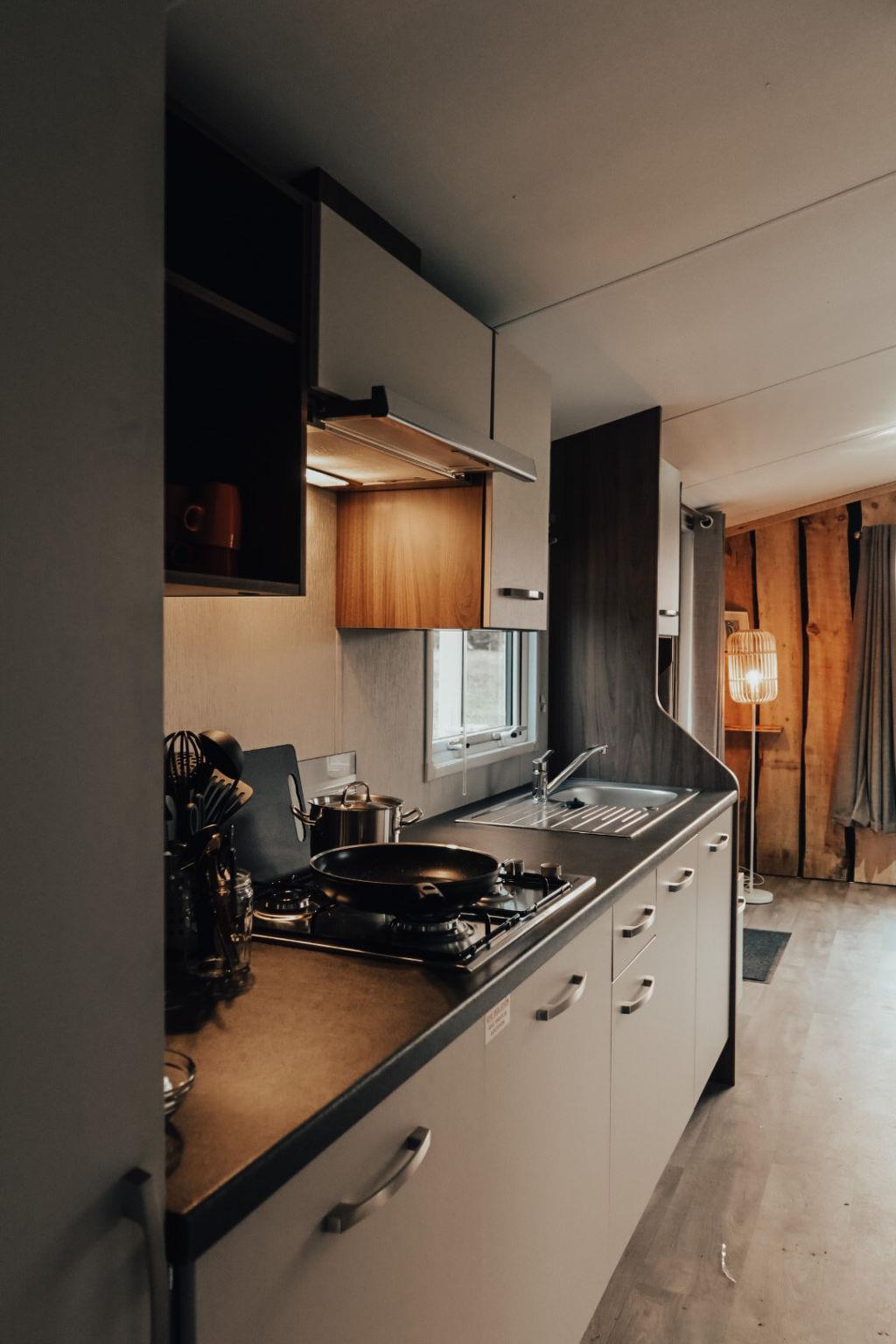 The chalet has two bedrooms. One with a double bed and the other with two single beds. In the spacious bedroom with the double bed, you will find a large wardrobe and two bedside tables. The bathroom is equipped with a washbasin, mirror, shower and toilet. Bed linen is included, but kitchen linen is not present and can be brought along or booked additionally..
