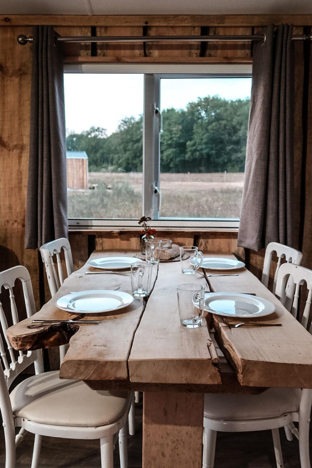 Inside, everything is provided for a comfortable stay. The living room offers a seating area with an electric heater and central heating for cooler evenings, and a dining table for cosy meals. From the living room, you can directly access the terrace through the double garden doors. The kitchen is fully equipped with a gas stove, extractor hood, coffee maker, fridge/freezer combination and a complete inventory, so you can cook without worries.