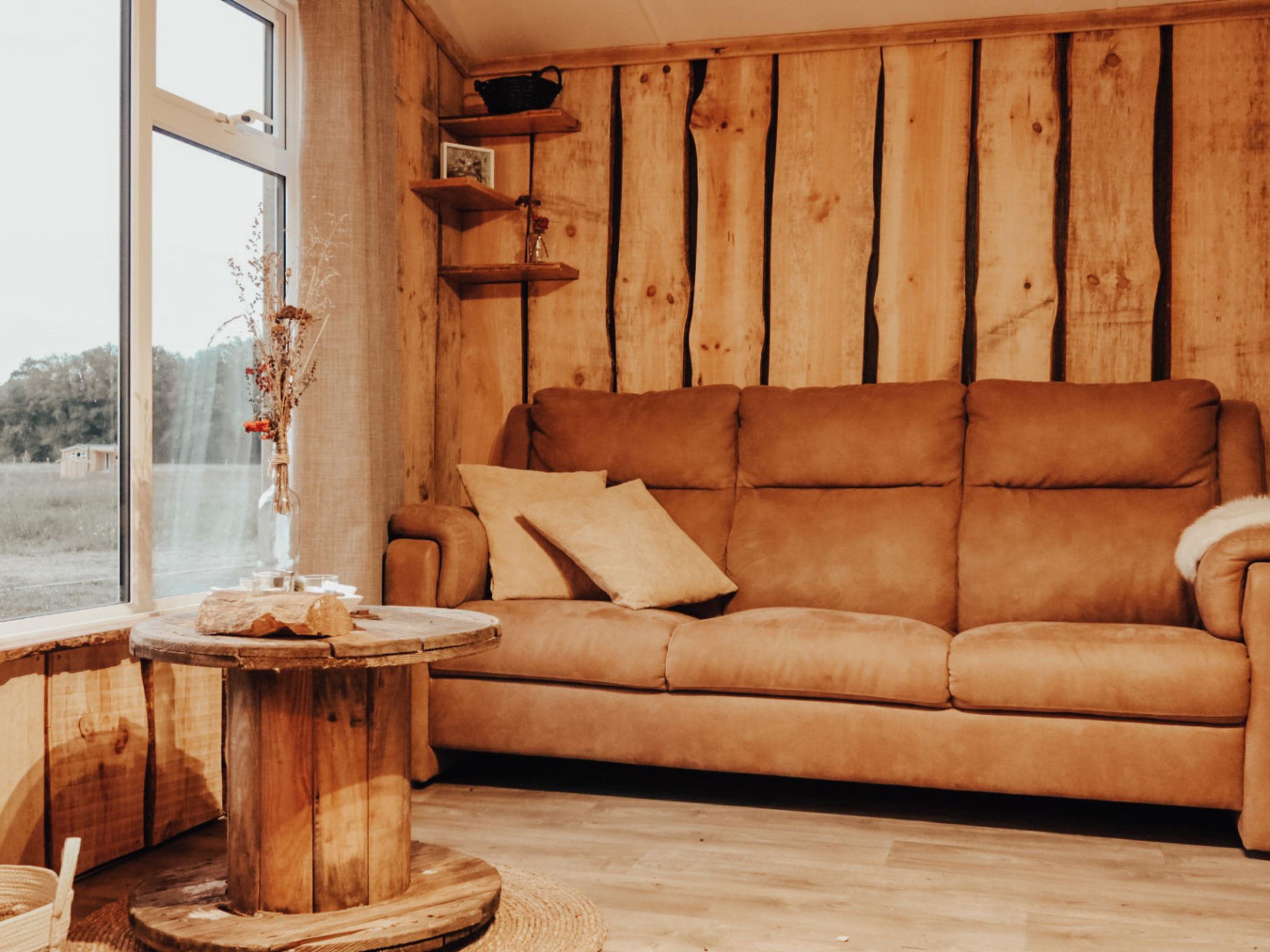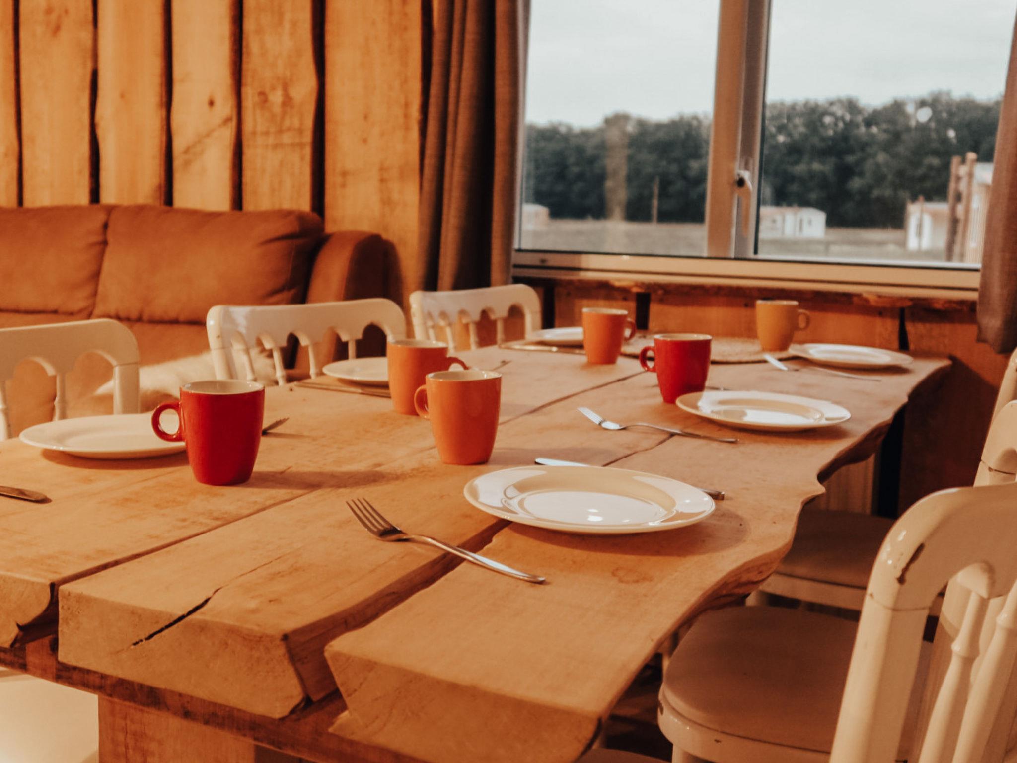 Inside the chalet, you immediately feel at home. The living room is equipped with comfortable seating areas, a dining table for cosy meals, and free Wi-Fi. The double garden doors give you access to the terrace, where you can relax and enjoy nature. The chalet has central heating and an electric stove, so you'll always be nice and warm, even during the cooler evenings.