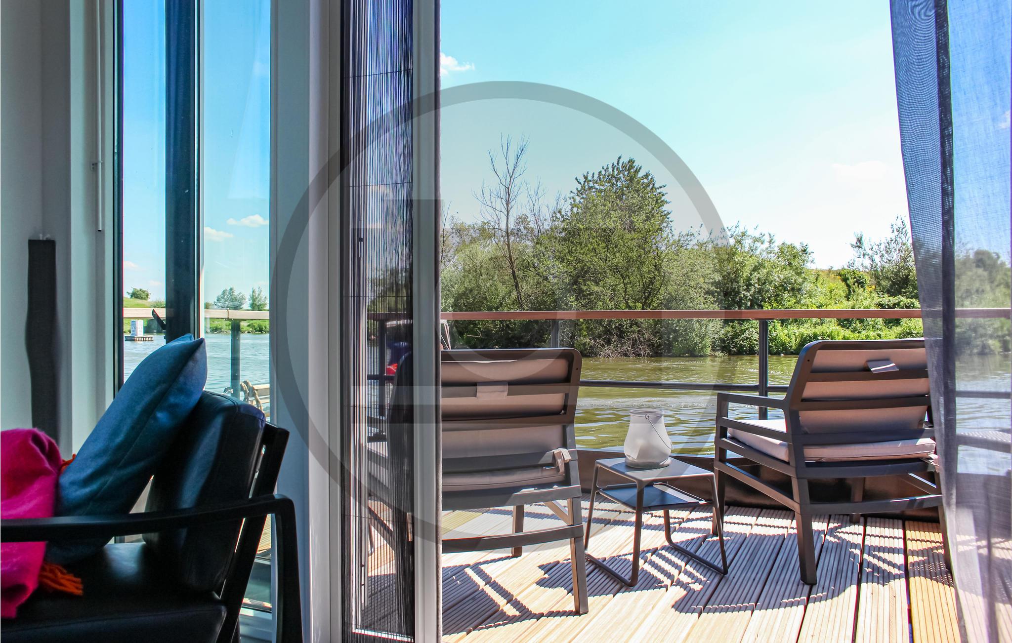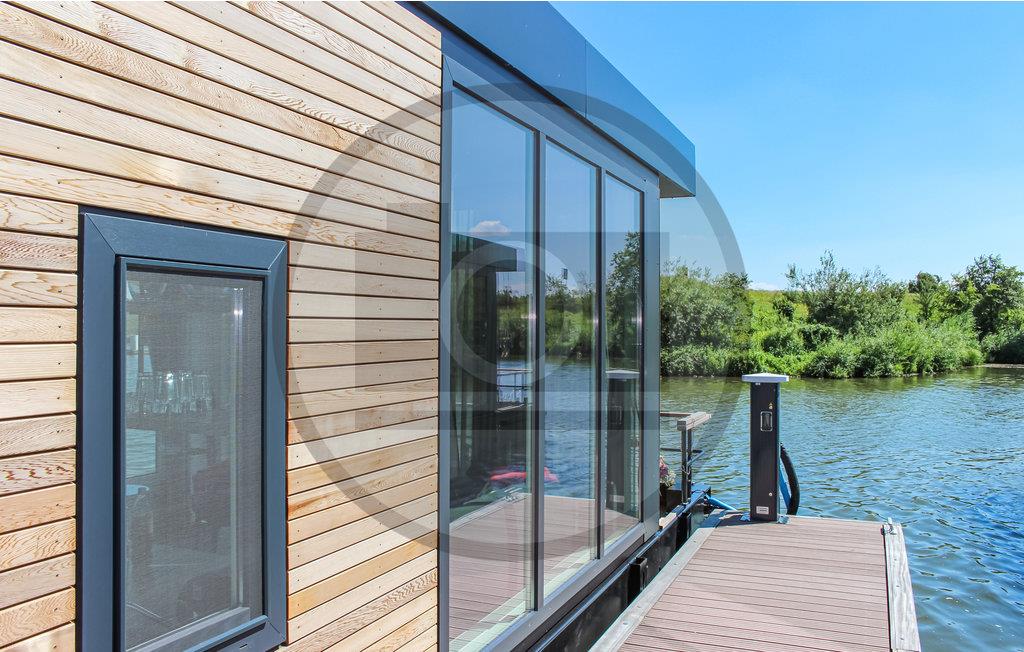 Das schwimmende Ferienhaus verfügt über einen eigenen Steg, an dem Sie Ihr kleineres Boot, Kanu oder SUP festmachen können. Sie betreten das Haus über die Terrasse mit freiem Blick auf das Wasser. Wenn Sie Schatten brauchen, hält der Eigentümer im Haus ein Sonnensegel für Sie bereit. Über die Terrasse betreten Sie das Wohnzimmer mit offener Küche. Vom Sitz- und Essbereich haben Sie einen schönen Blick auf das umliegende Wasser. Für ein Hausboot ist die Küche überdurchschnittlich gut ausgestattet. Zum Beispiel gibt es einen kleinen Geschirrspüler und einem Ofen. 2 Schlafzimmer haben ein Doppelbett (200x180cm und 200x150cm), das 3. Schlafzimmer hat ein Etagenbett.