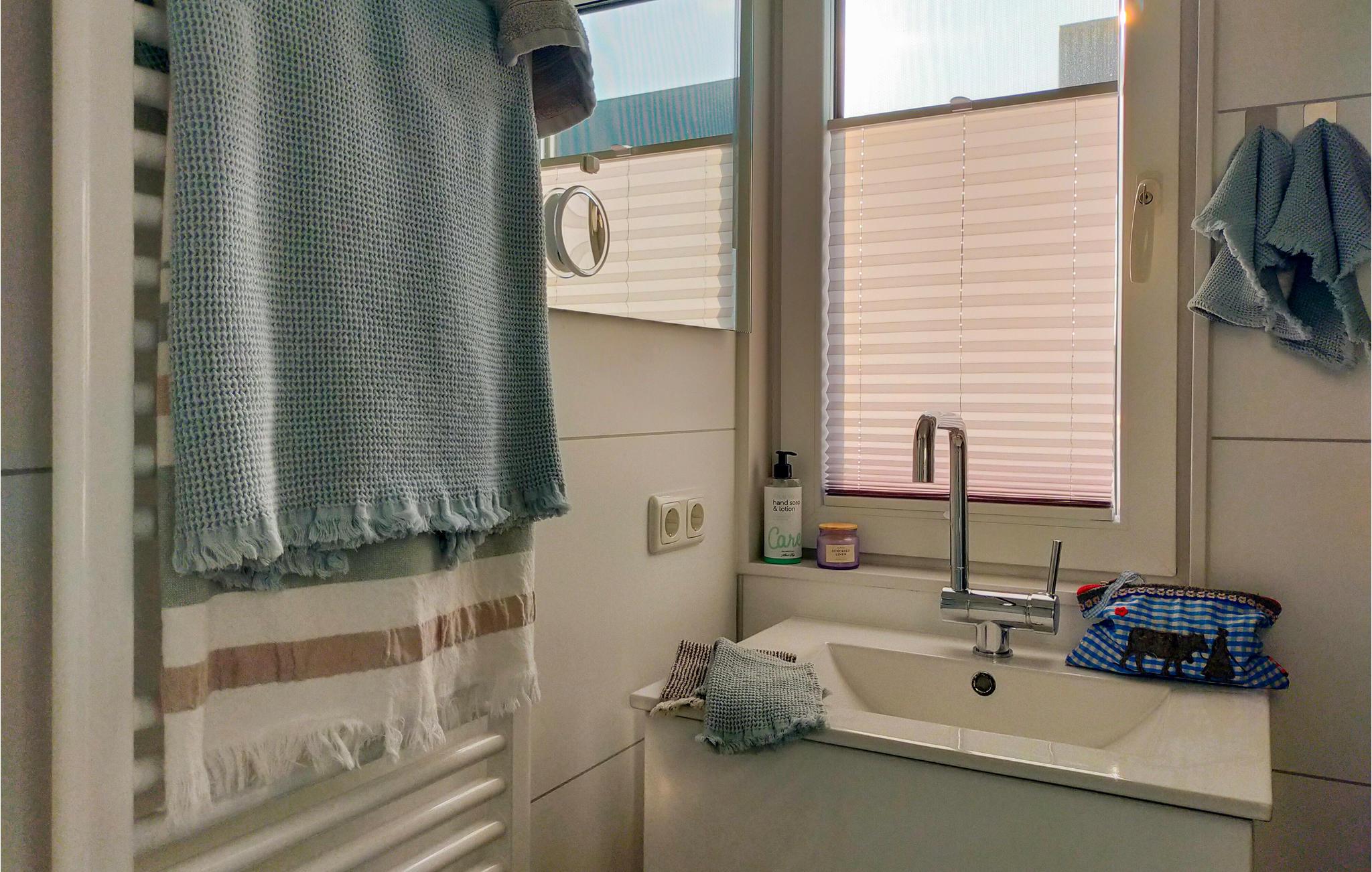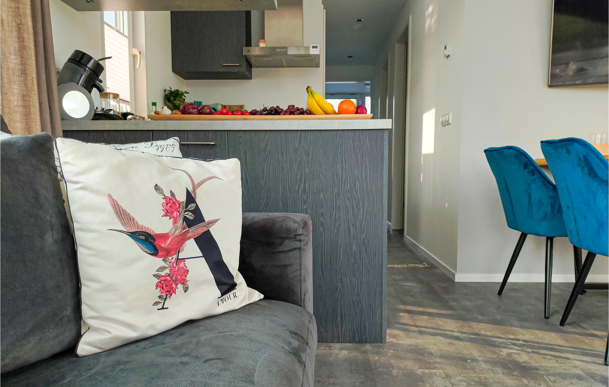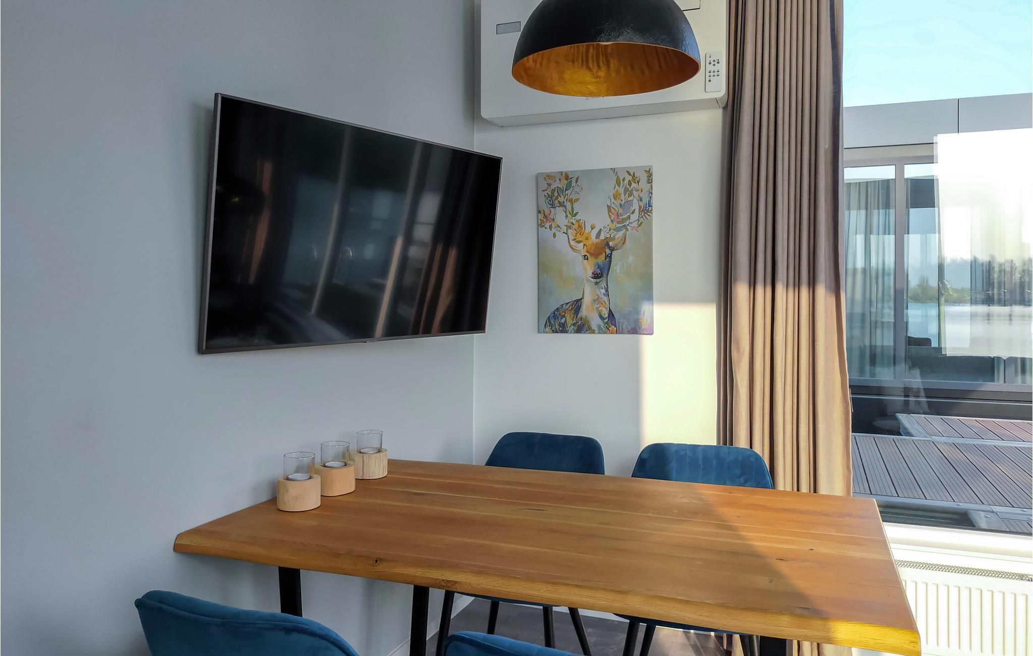 Das schwimmende Ferienhaus verfügt über einen eigenen Steg, an dem Sie Ihr kleineres Boot, Kanu oder SUP festmachen können. Sie betreten das Haus über die Terrasse mit freiem Blick auf das Wasser. Wenn Sie Schatten brauchen, hält der Eigentümer im Haus ein Sonnensegel für Sie bereit. Über die Terrasse betreten Sie das Wohnzimmer mit offener Küche. Vom Sitz- und Essbereich haben Sie einen schönen Blick auf das umliegende Wasser. Für ein Hausboot ist die Küche überdurchschnittlich gut ausgestattet. Zum Beispiel gibt es einen kleinen Geschirrspüler und einem Ofen. Die Schlafzimmer haben ein Doppelbett (200x180cm und 200x150cm) und einen Fernseher.