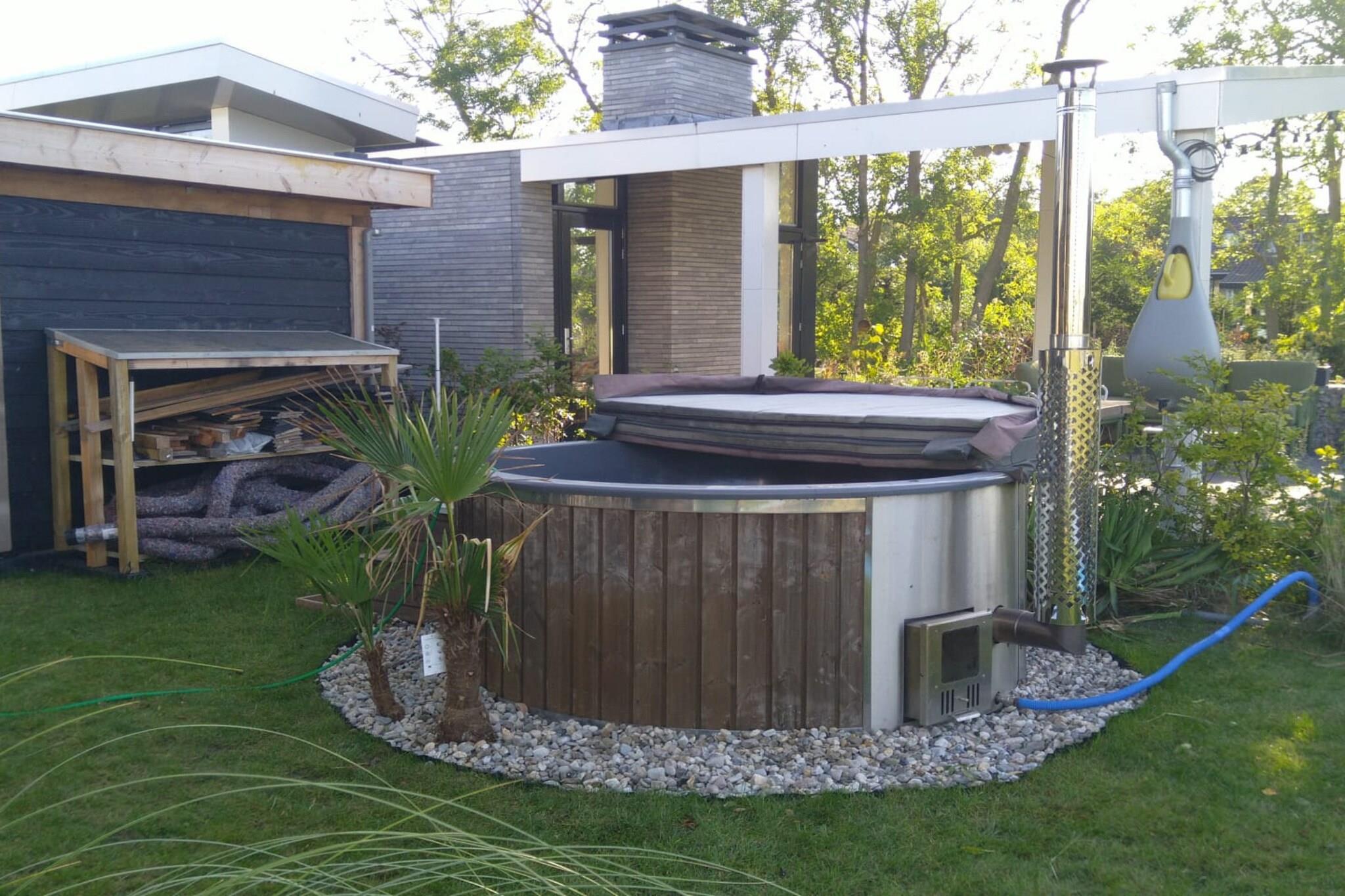Ground floor: (Living room(TV, decorative fireplace, seating area), open kitchen(coffee machine, combination microwave, dishwasher), bedroom(double bed), bedroom(bunk bed), bathroom(shower, washbasin, toilet)) hot tub, terrace, garden, parking