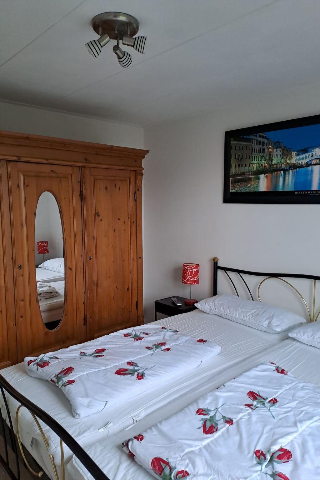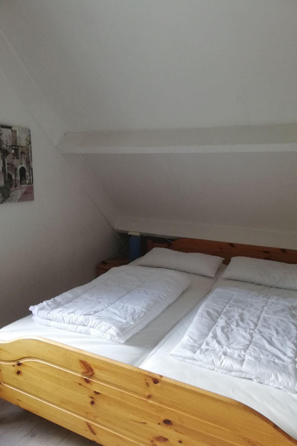 The living space of approx. 90 m² is spread over two fully heated floors. The windows are fitted with electric shutters to darken the room. On the ground floor there is a living area with a seating area and Smart TV (German and English channels only), a dining area, a fully equipped fitted kitchen with fridge-freezer, a double bedroom and a bathroom. The bedroom is equipped with a Smart TV and double bed (2 × 0.90 m wide). The bathroom on the ground floor has a walk-in shower, washbasin and WC. There is also a storage room on this floor with a washing machine and tumble dryer for free use. The upper floor offers two further bedrooms, each with a double bed (2x0.90cm wide) and a satellite TV (German and English channels only), as well as a further bathroom with shower, washbasin and toilet. Fly screens are attached to all bedroom windows. A travel cot is available on site. Internet reception via wifi. Please note that you must bring your own bed linen and towels.