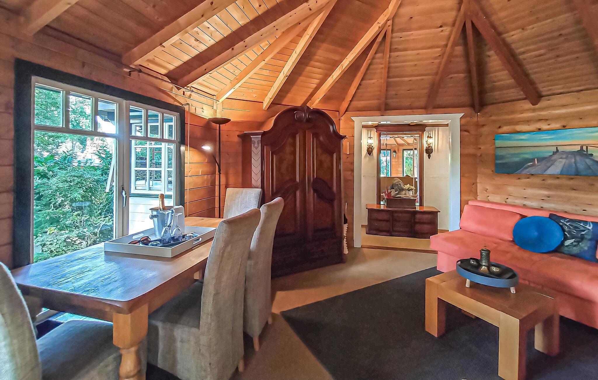 Die Holzelemente und liebevollen Details im Innenbereich schaffen eine behagliche Atmosphäre, in der Sie sich sofort wohlfühlen werden. Nutzen Sie den Fernseher für einen entspannten Abend oder nehmen Sie am Esstisch Platz, um gemeinsame Mahlzeiten zu genießen. Ihre Speisen bereiten in der urigen Küche mit direktem Blick in den grünen Außenbereich zu. Voll und ganz entspannen können Sie im Whirlpool im Badezimmer.