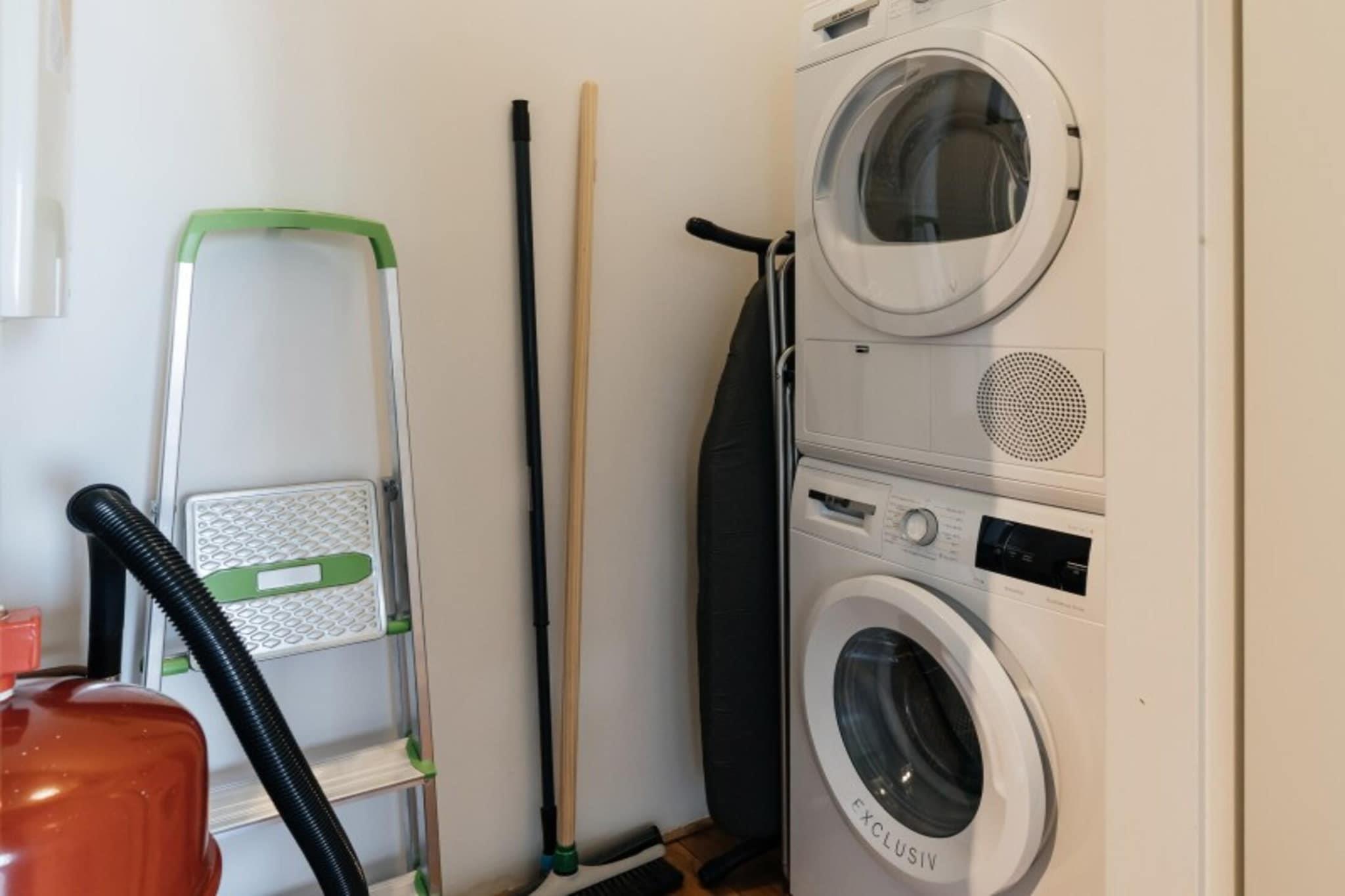 Ground floor: (Kitchen(hob, electric kettle, hood, coffee machine(cups, espresso), oven, microwave, dishwasher, fridge), Living/diningroom(TV(flatscreen, smart TV, international television channels), dining table, balcony), bedroom(3x single bed(boxspring), TV(flatscreen, smart TV, international television channels), balcony), bedroom(2x single bed(boxspring), TV(flatscreen, smart TV, international television channels), balcony), bathroom(shower, washbasin, toilet), Internet access) tumble dryer, washing machine, heating, parking, lift, ironing board, iron, hairdryer